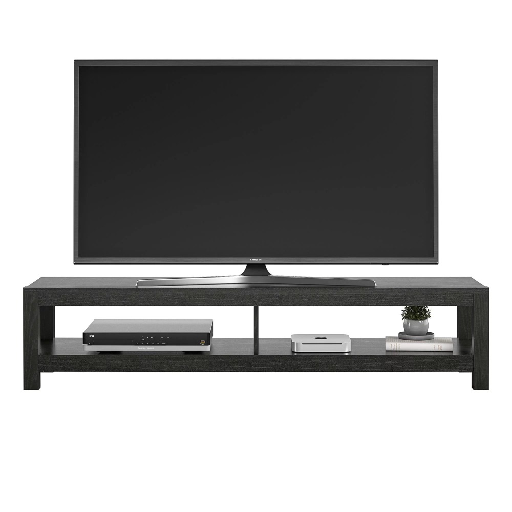 Display your flat screen tv on the stable mainstay easy assembly tv stand for TVs up to 65" wide. The black oak woodgrain finish on the laminated hollow core and particleboard pairs with any style and decor. The large top surface can hold your flat screen tv up to 65" wide or up to 120 lbs. Organize your cable box, DVD player, and gaming consoles on the lower open shelf. The open concept allows proper air circulation to prevent your components from overheating and gives you easy access to outlets. The low-profile stand gives your tv a stable base and doesn't take up a lot of valuable space making this the perfect addition to small and medium-sized rooms.