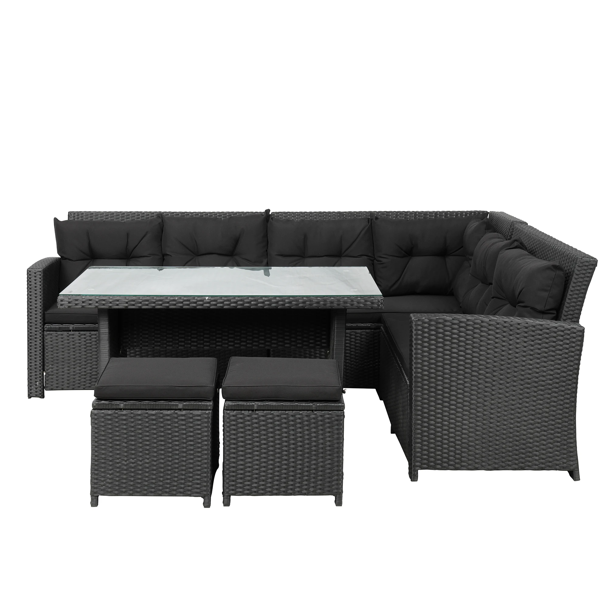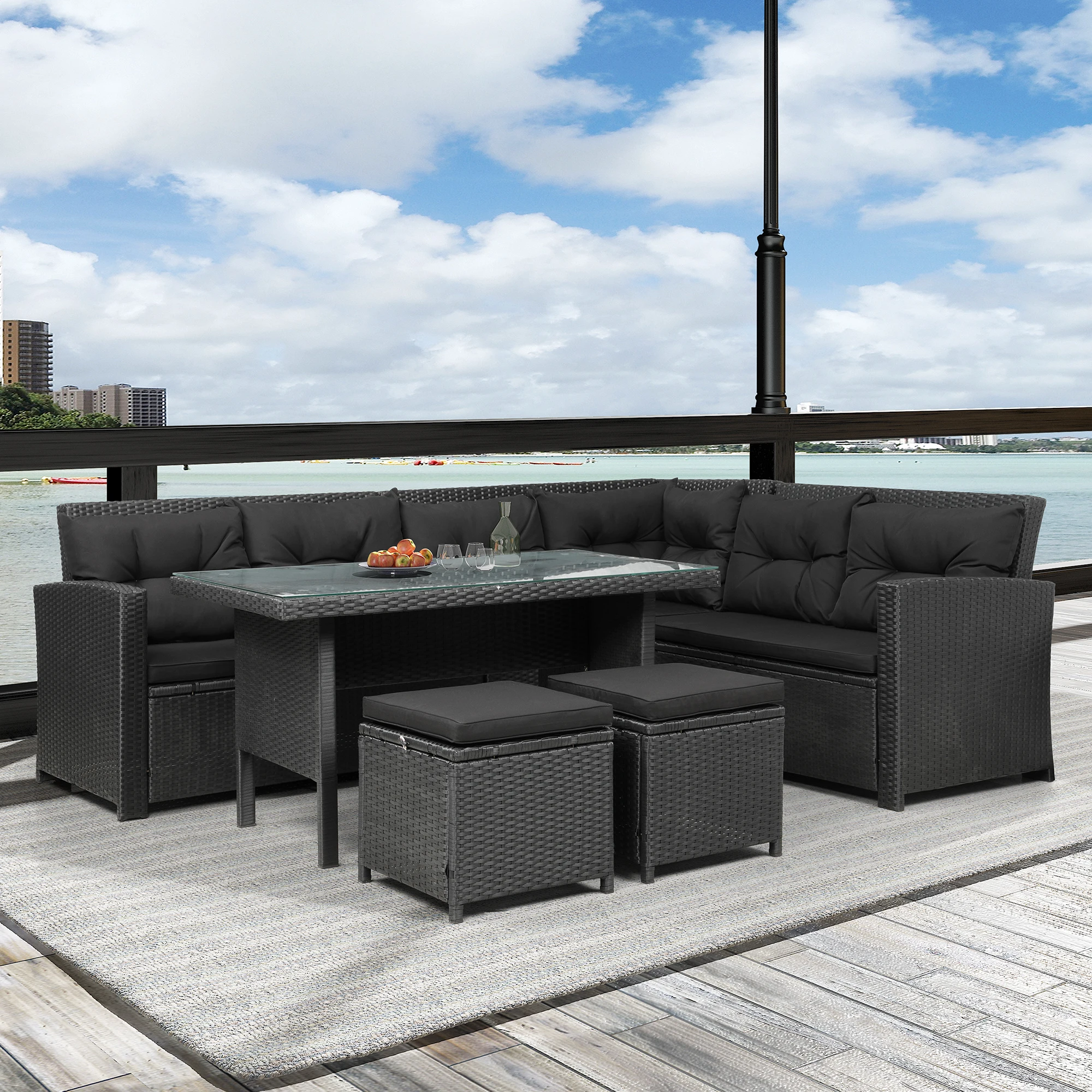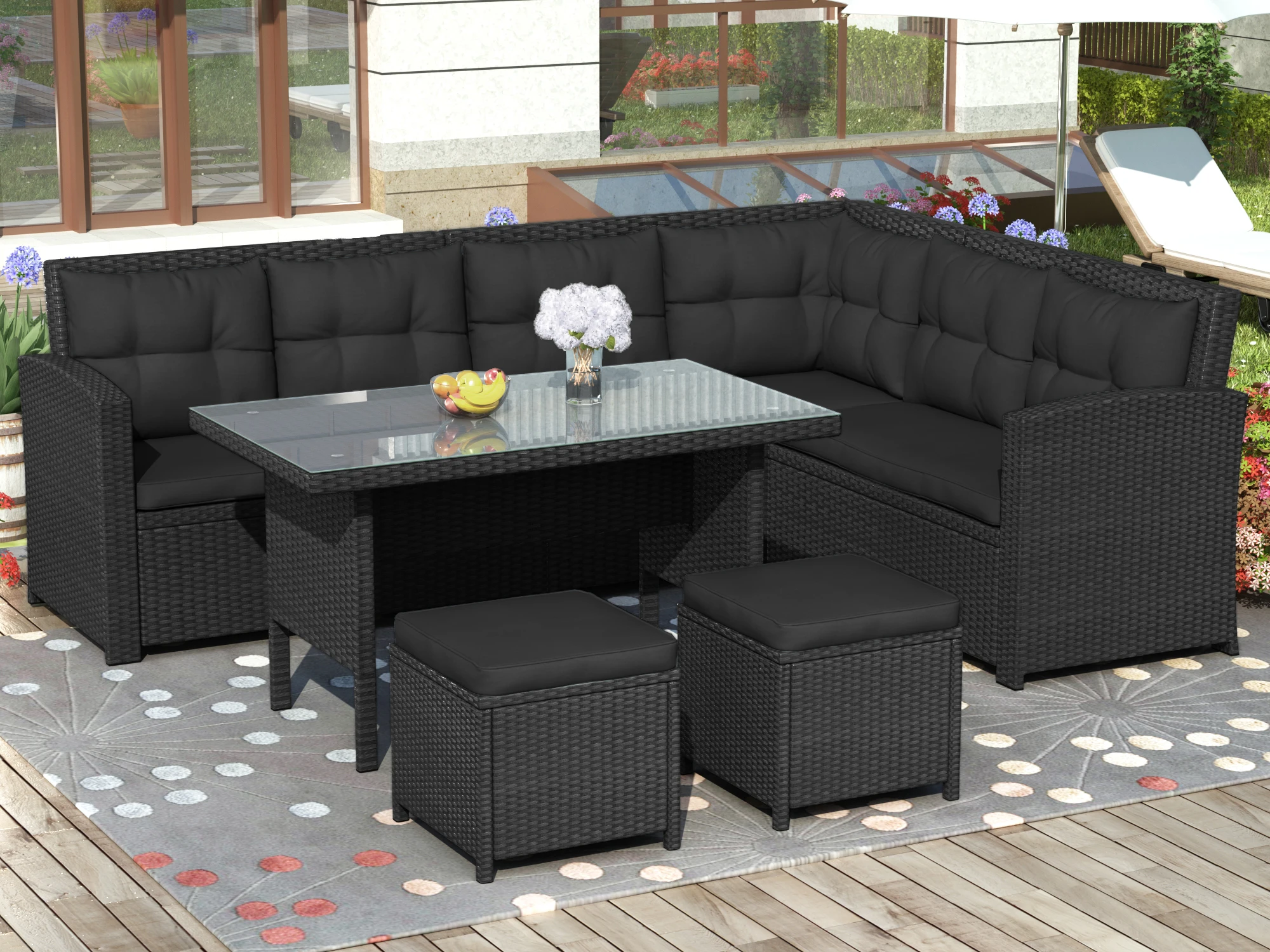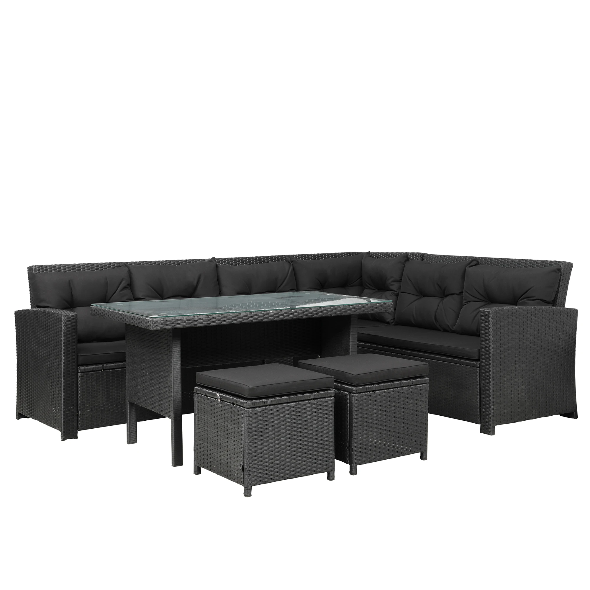 Patio Furniture 6-Piece Set Outdoor Sectional Sofa with Glass Table Ottomans for Pool Backyard Lawn Black/Gray[US-Depot]