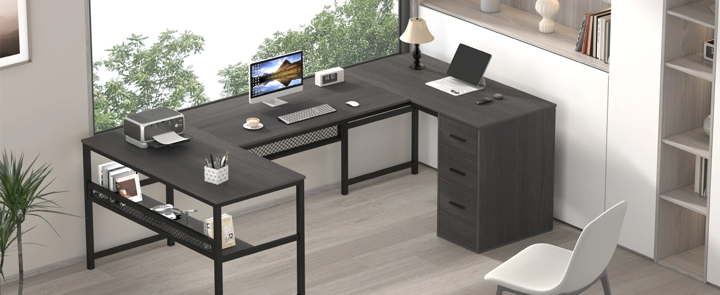 This U-shaped computer desk, with its spacious desktop and intelligent storage design, allows you to easily organize your workspace, enhancing overall productivity and providing comfortable support for extended study sessions.