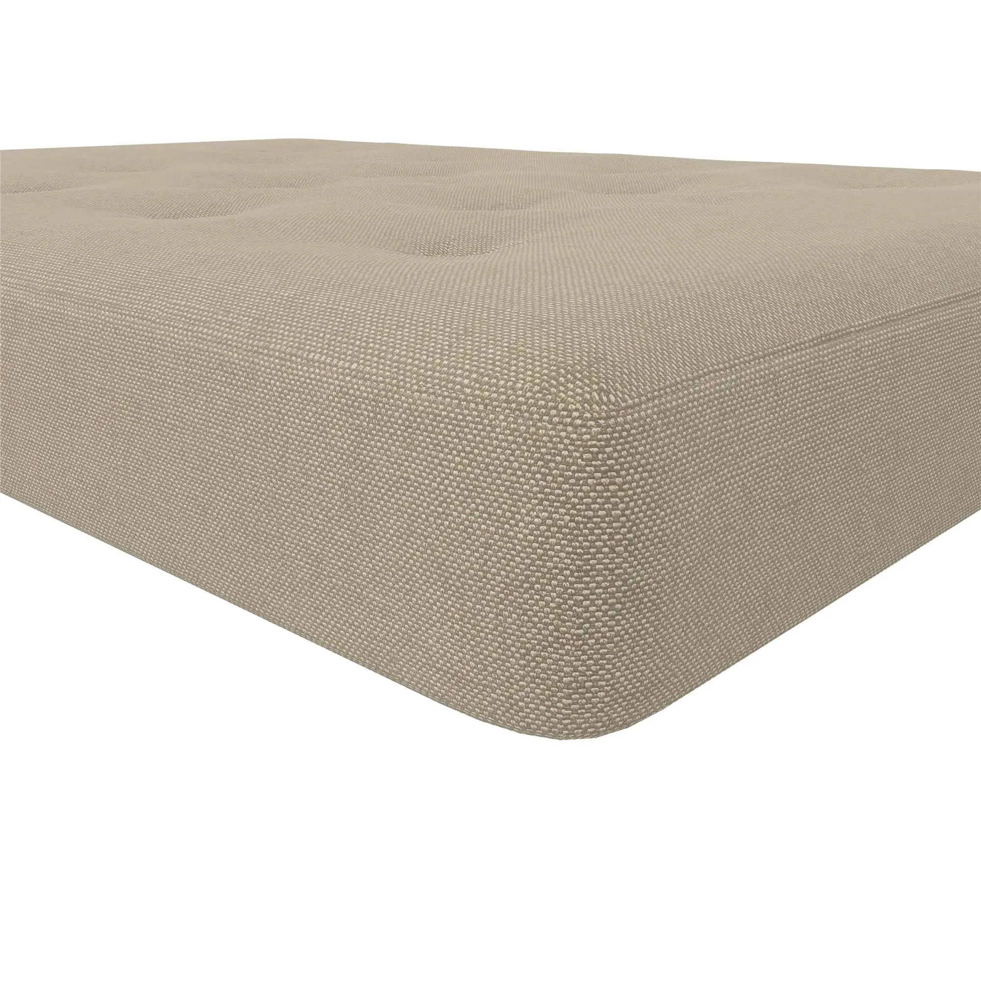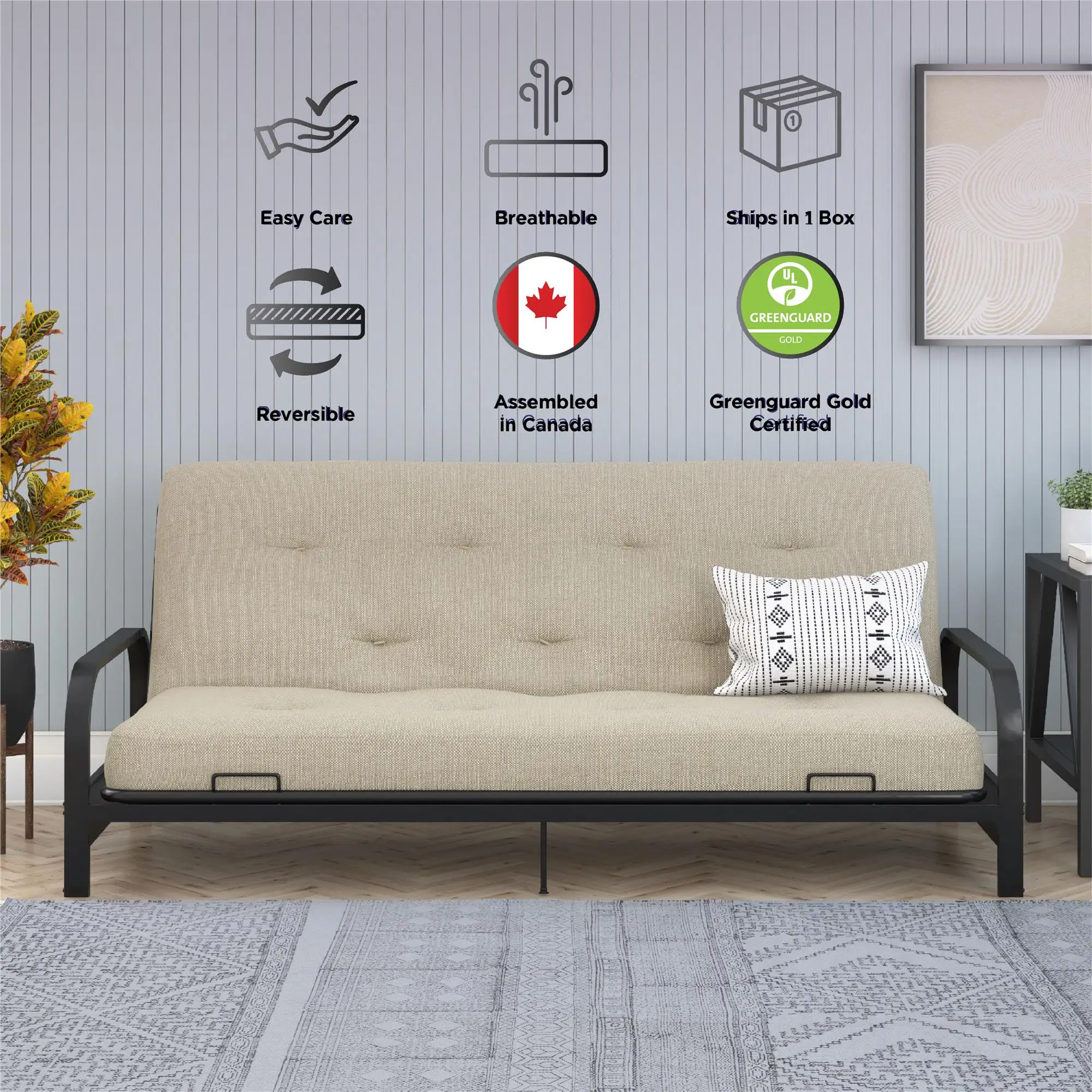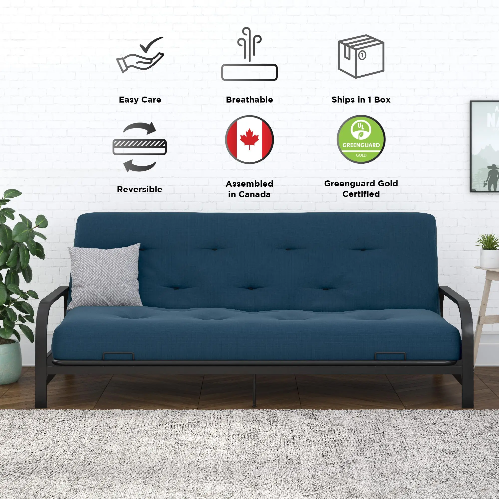 Lasting comfort is only moments away with the DHP Trule 8" Pocket Coil Reversible Full Size Futon Mattress. Designed for people who crave a sag-less sitting and sleeping experience, the Trule serves as an ideal accessory for your full-size futon frame (sold separately) while amplifying your pragmatic living room and home office style. Featuring 486-count independently encased steel spring coils wrapped between 2-sided layers of thermobonded high-density polyester padding, the Truleâs flippable design lets you rotate your mattress to minimize wear and tear and satisfies your need for firm level support. Covered in rich linen-like fabric with classic tufting that helps retain mattress shape, this easily foldable 3-seater and double sleeper combo is the perfect base for your sofa and guest bed. Assembled in Canada, its composition consists of 50% recycled polyester fibers to aid environmental sustainability efforts and it has gained GreenGuard Gold Certification for safeguarding clean indoor air. Available in assorted colors.