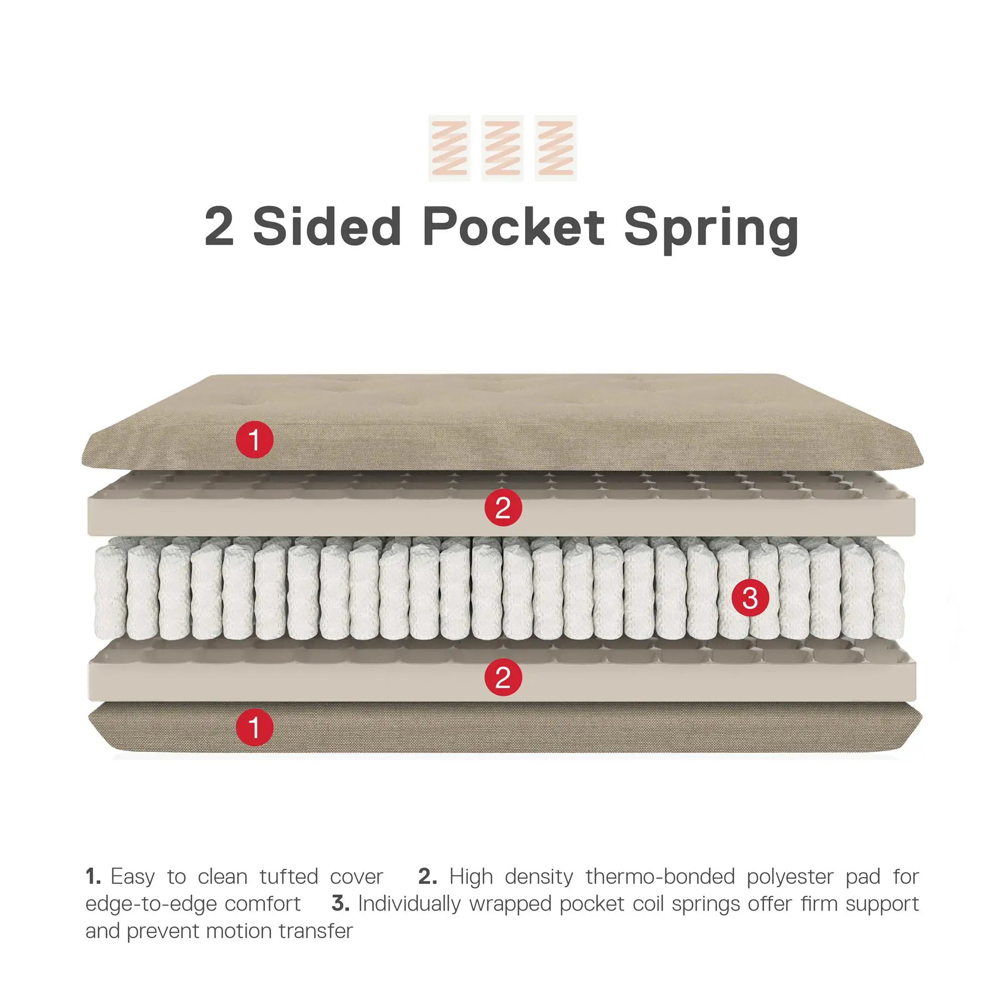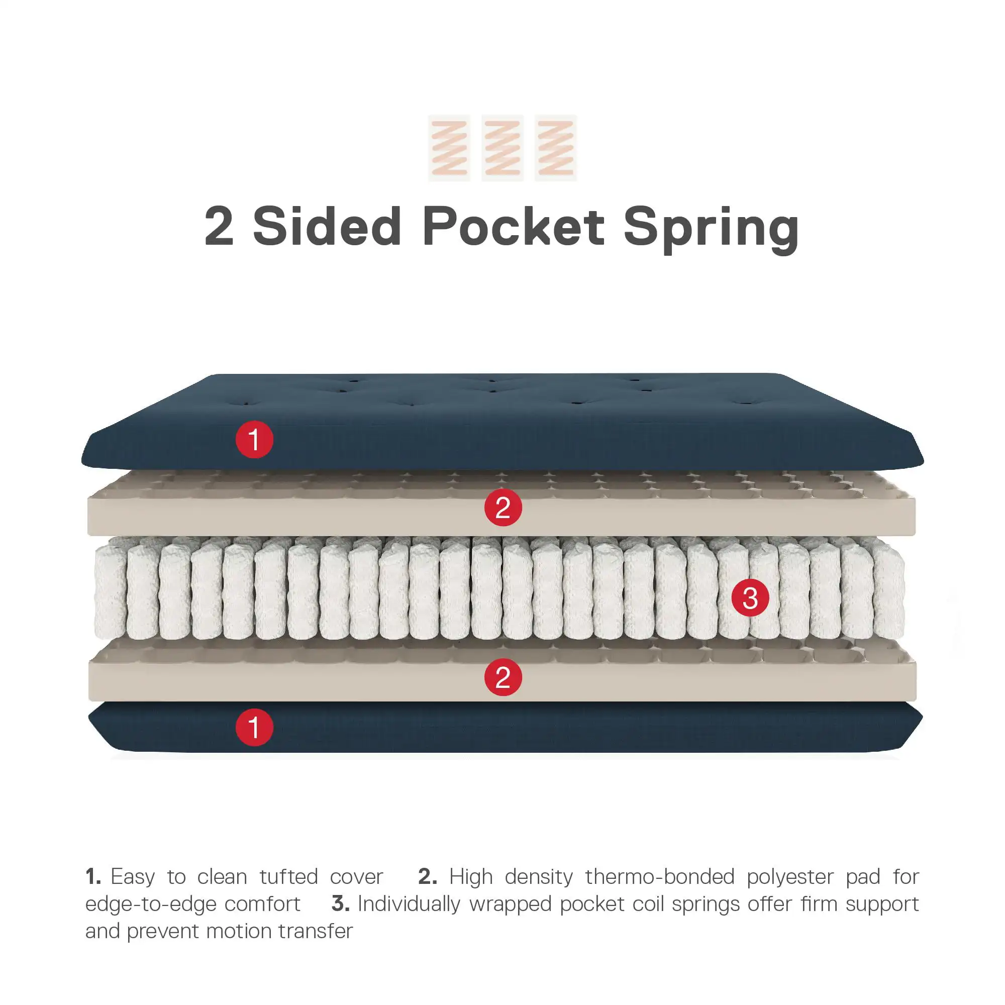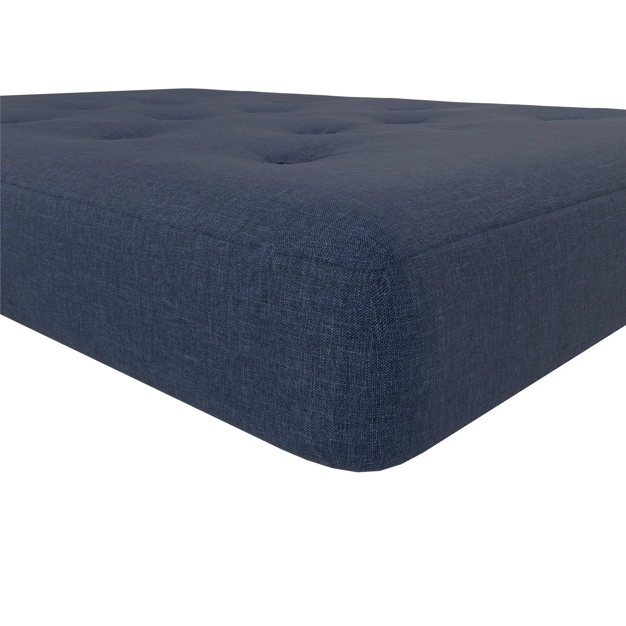 Lasting comfort is only moments away with the DHP Trule 8" Pocket Coil Reversible Full Size Futon Mattress. Designed for people who crave a sag-less sitting and sleeping experience, the Trule serves as an ideal accessory for your full-size futon frame (sold separately) while amplifying your pragmatic living room and home office style. Featuring 486-count independently encased steel spring coils wrapped between 2-sided layers of thermobonded high-density polyester padding, the Truleâs flippable design lets you rotate your mattress to minimize wear and tear and satisfies your need for firm level support. Covered in rich linen-like fabric with classic tufting that helps retain mattress shape, this easily foldable 3-seater and double sleeper combo is the perfect base for your sofa and guest bed. Assembled in Canada, its composition consists of 50% recycled polyester fibers to aid environmental sustainability efforts and it has gained GreenGuard Gold Certification for safeguarding clean indoor air. Available in assorted colors.