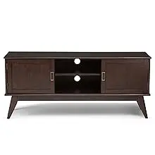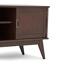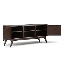 Your TV deserves a stylish and sturdy stand. The Draper Mid Century modern Low TV Media Stand is a well-designed piece of furniture. The center features two shelves with cable management cutouts for your electronics. Two side cabinets each have one adjustable shelf for your DVD or game collection. This 26" high stand can accommodate a TV up to 65". Cord Management Cutouts to allow for neat & organized look for the wires from all your devices. Mid Century Modern style evokes a time long past with its clean lines, elegant sensibility and tapered legs. Efforts are made to reproduce accurate colors, variations in color may occur due to computer monitor and photography. At Simpli Home we believe in creating excellent, high quality products made from the finest materials at an affordable price. Every one of our products come with a 1-year warranty and easy returns if you are not satisfied.