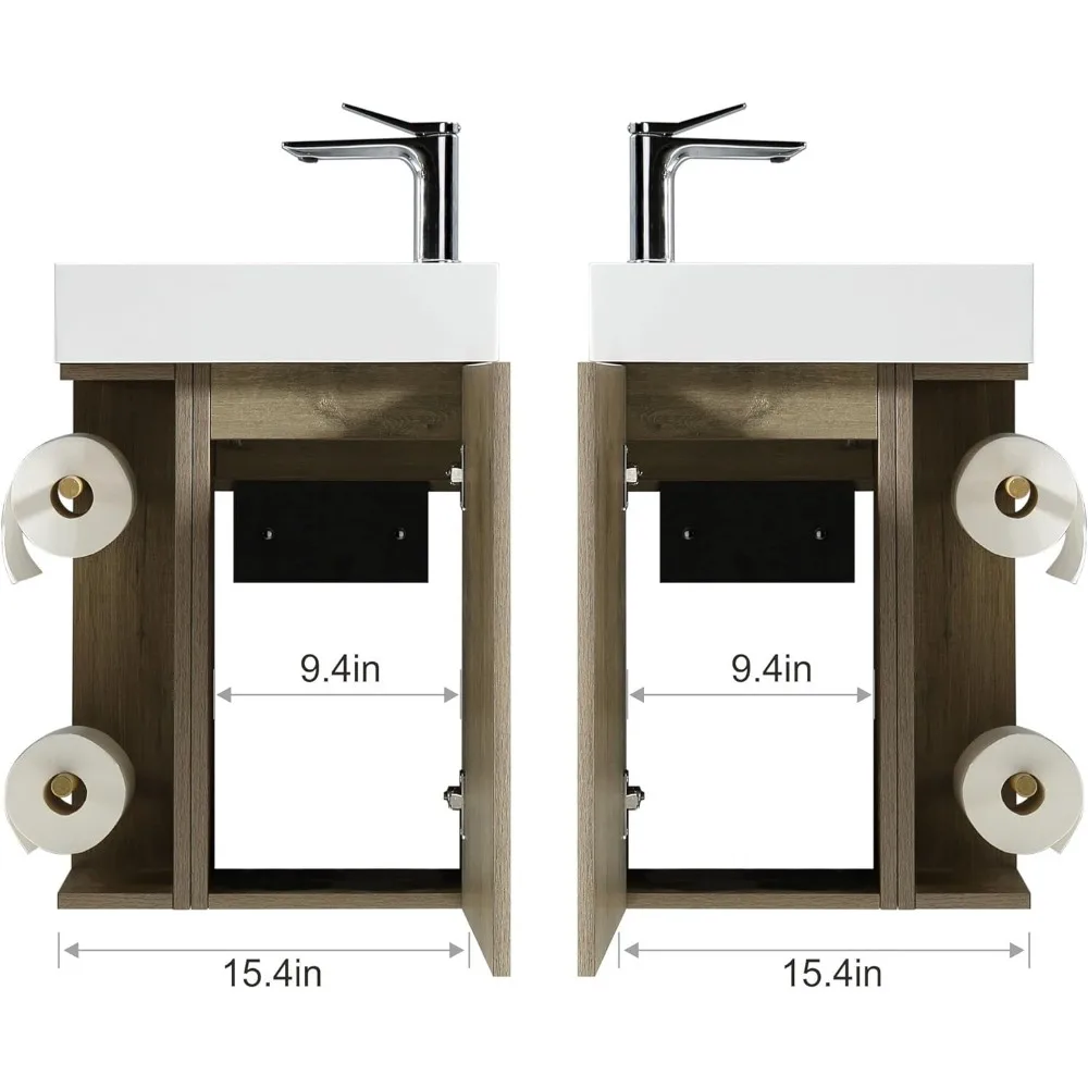 - 【SMALL SPACE BATHROOM VANITY SET】Embrace the perfect blend of utility and elegance. Our bathroom vanity with sink boasts a durable E1 standard eco-friendly storage cabinet and a sophisticated artificial stone basin. Measuring a mere 15.7 inches wide by 8.8 inches deep by 23.2 inches high, it's tailor-made for those tight spaces. (The faucet and the pop-up are not included.)