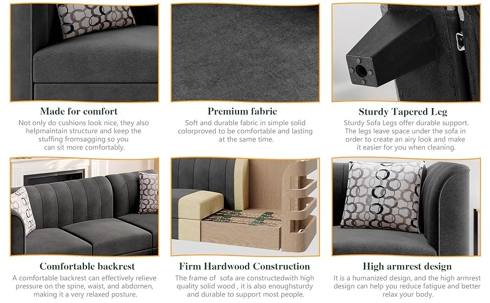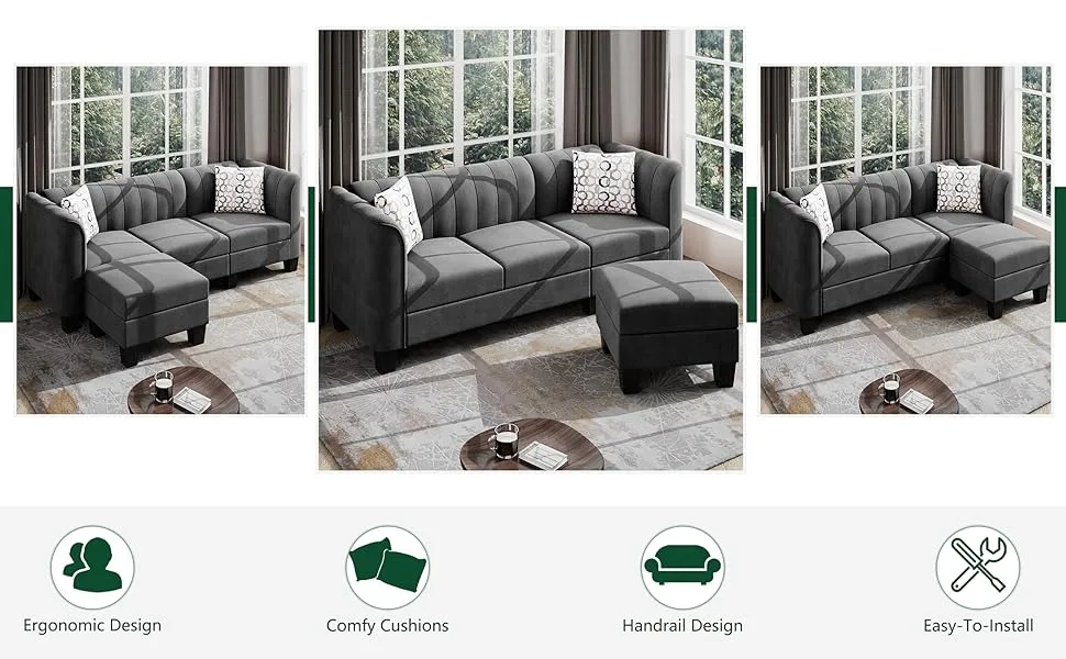 Versatile Sectional Sofa: Sectional sofa with an extra wide chaise lounge for maximum comfort,When friends come by, you can place the ottoman on either side of the sofa at random.