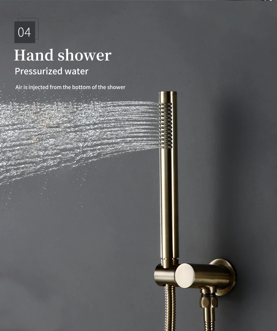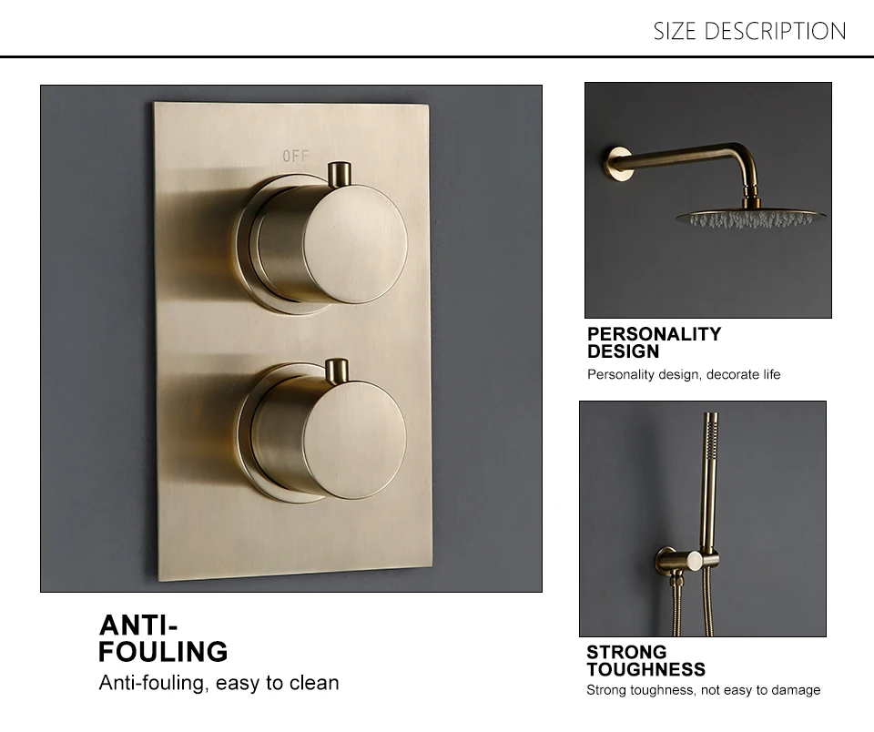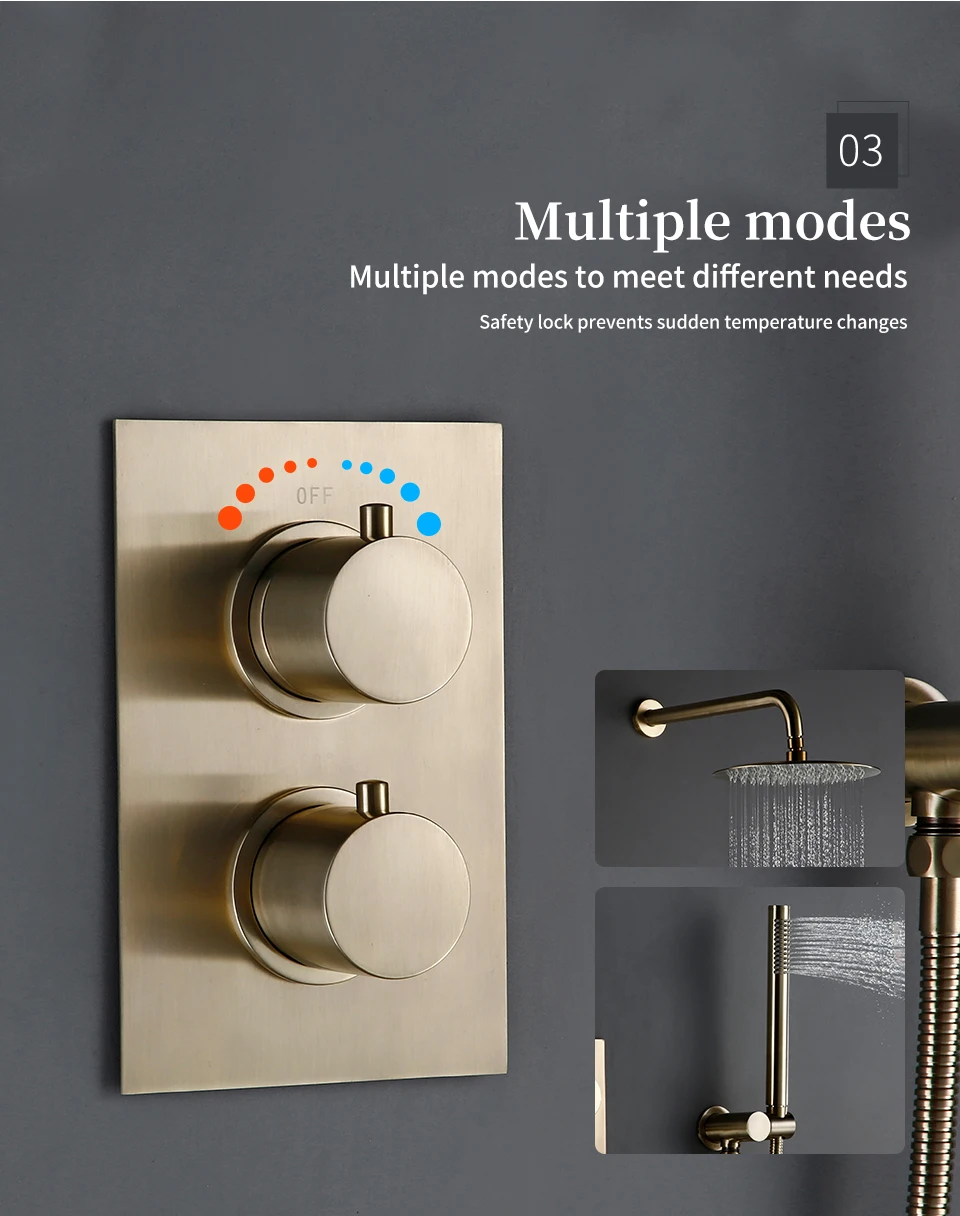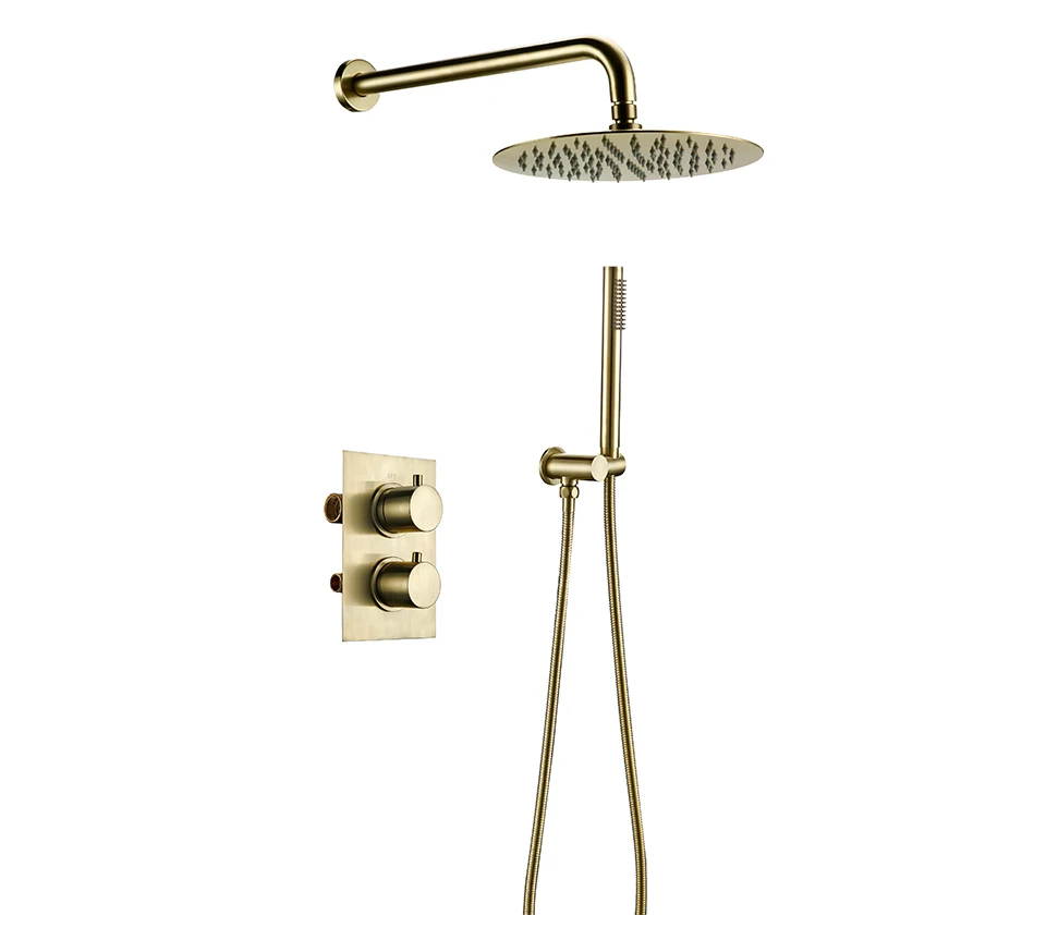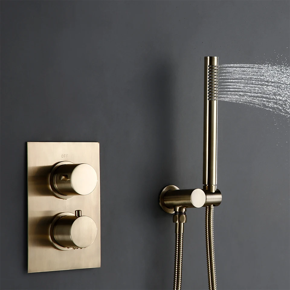 Solid Brass Thermostatic Mixer Diverter Set Brushed Gold Bath Bathroom Shower Head Rianfall Luxury Combo Faucet Wall Mount Arm