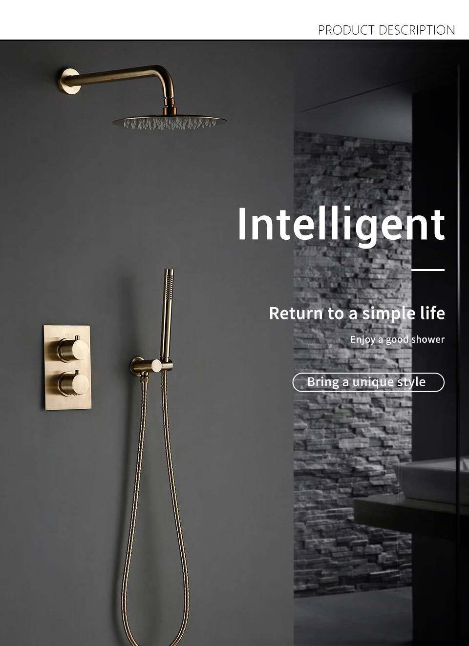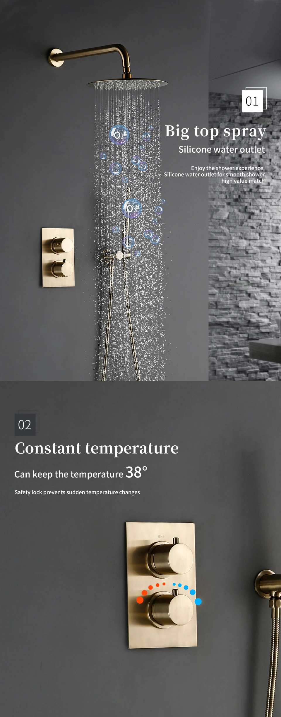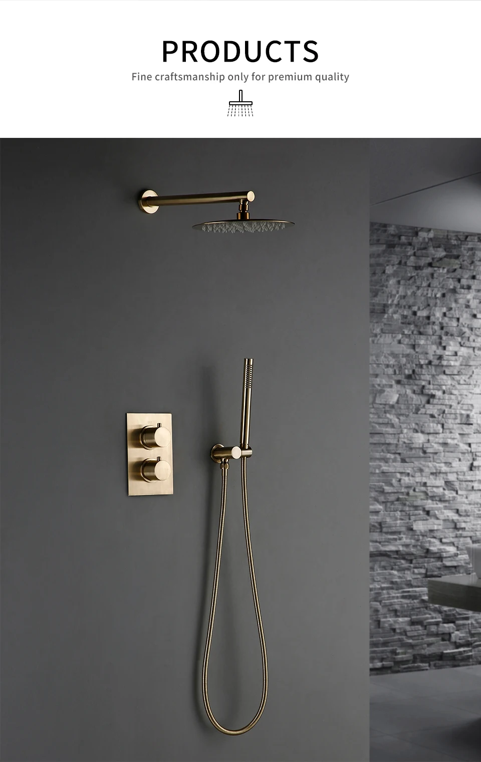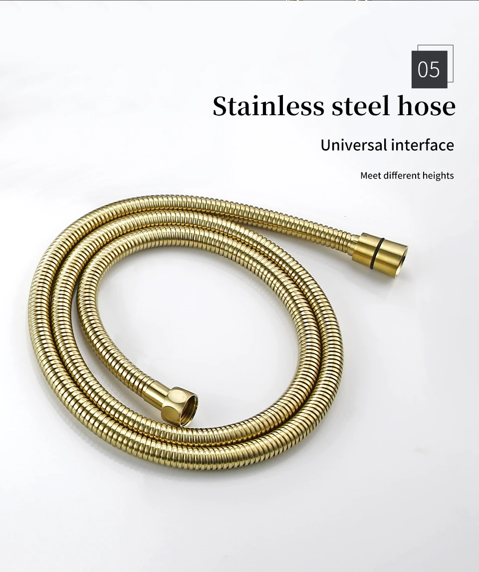 Solid Brass Thermostatic Mixer Diverter Set Brushed Gold Bath Bathroom Shower Head Rianfall Luxury Combo Faucet Wall Mount Arm