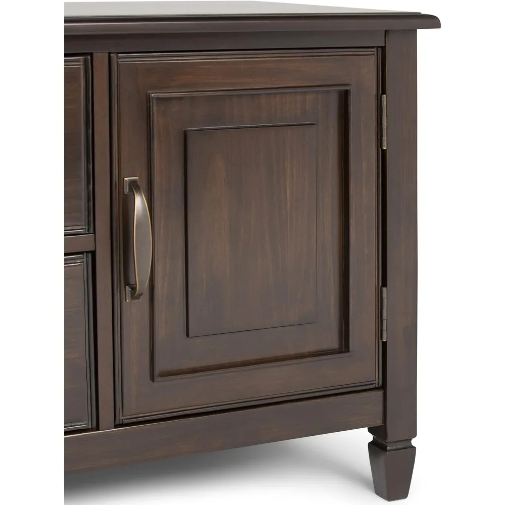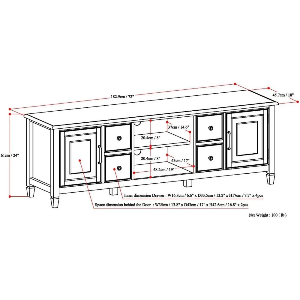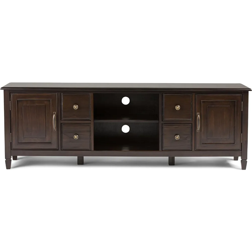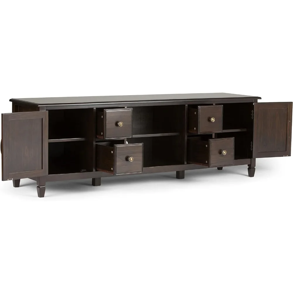 Now that 80 inch flat screen TVs are more affordable, you need to have one. To enjoy it fully, you will also need the perfect TV Stand to position your TV just right. Look no further. The Connaught Extra Wide TV Stand is perfectly sized for TVs up to 80 inches. It has plenty of storage space for all your media and gaming devices. It has a large centrally located open area with four side drawers as well as two enclosed spaces. The two large side storage cabinets open to one adjustable shelf. The unit features cord management cut-outs for easy installation of TV and media components. The unit includes cord management cut-outs for easy installation of TV and media components. Style Includes vintage raised panel doors and drawers, notched legs, Bronze decorative hardware and a style reminiscent of the historic British Colonial style. Efforts are made to reproduce accurate colors, variations in color may occur due to computer monitor and photography.