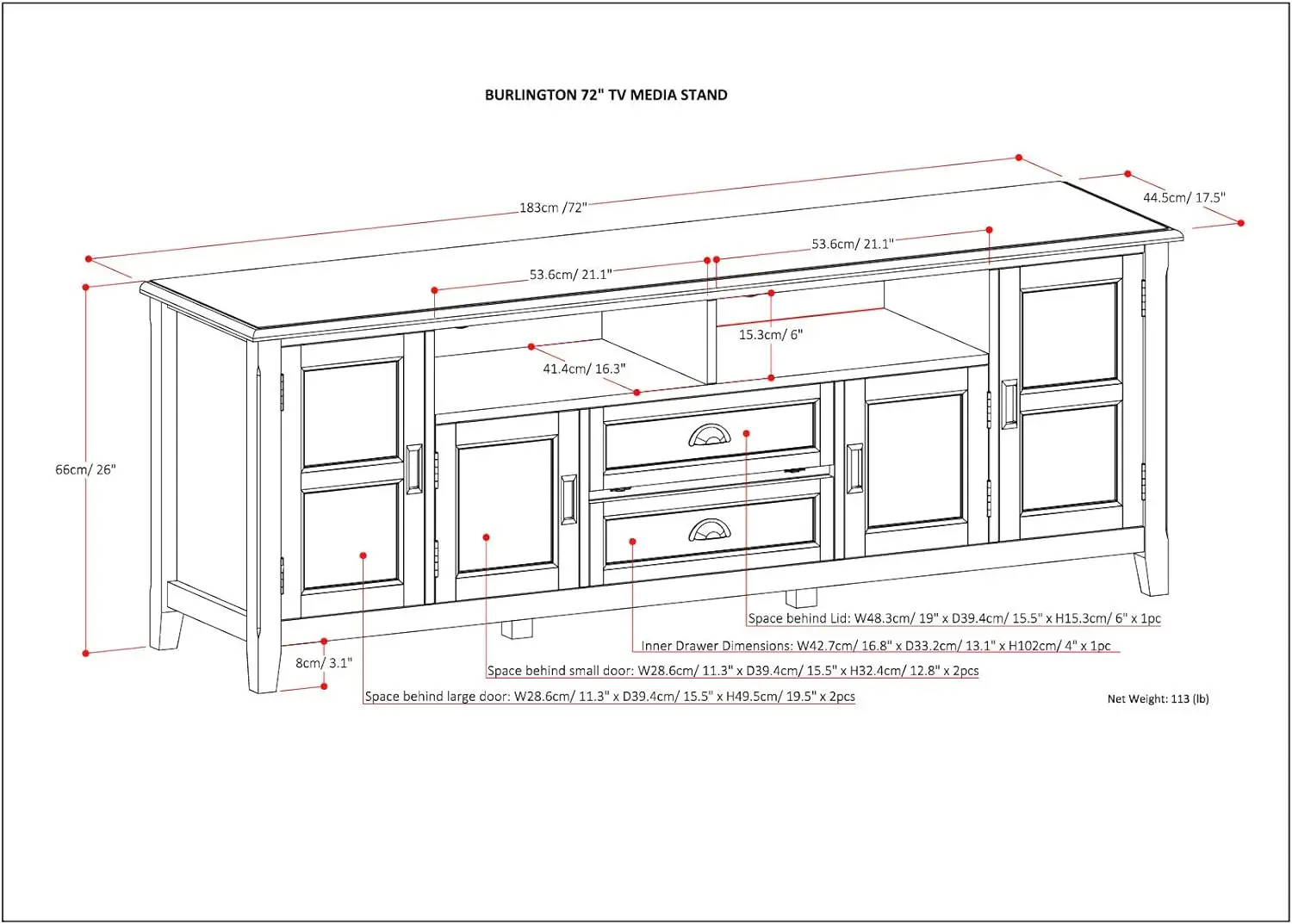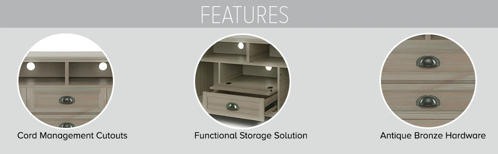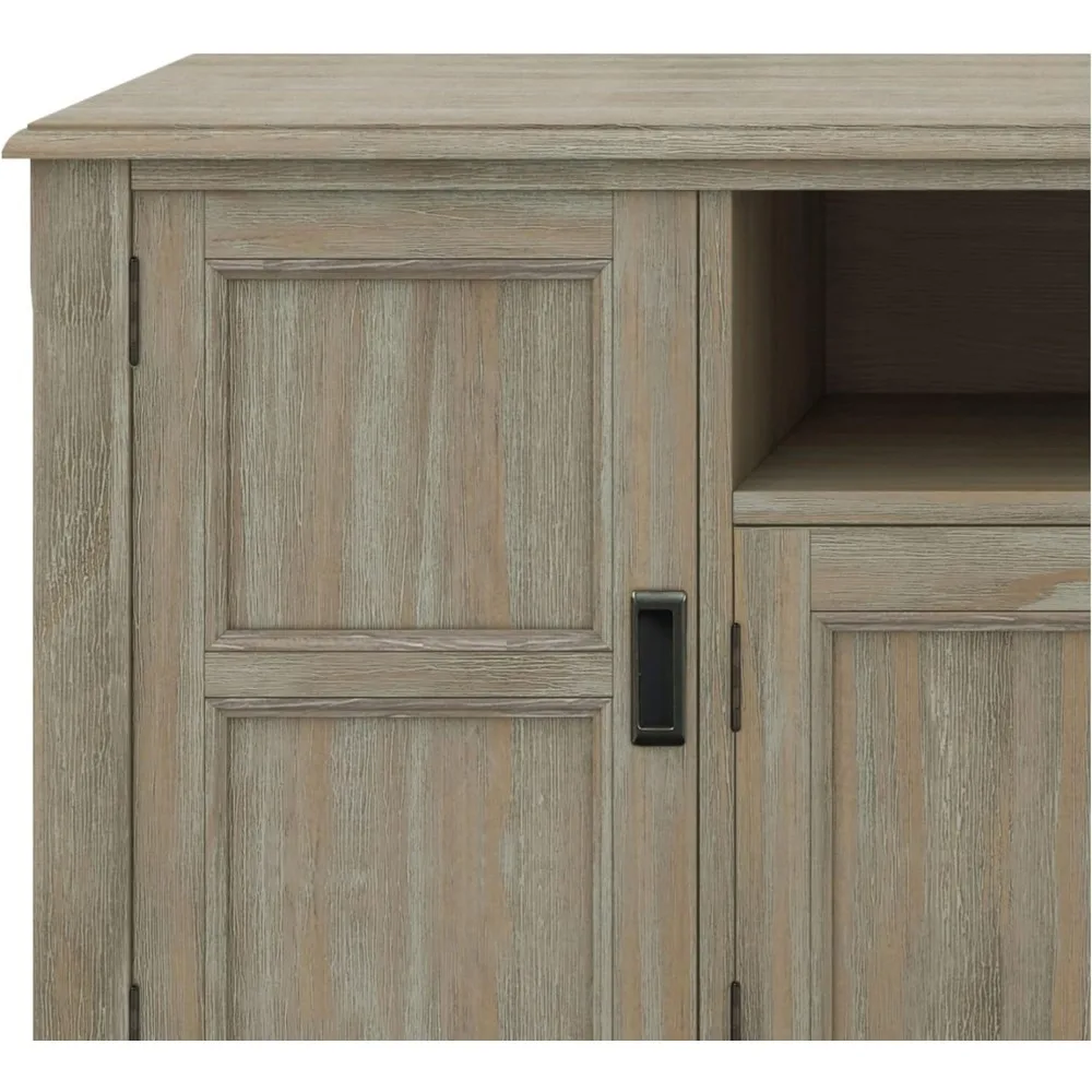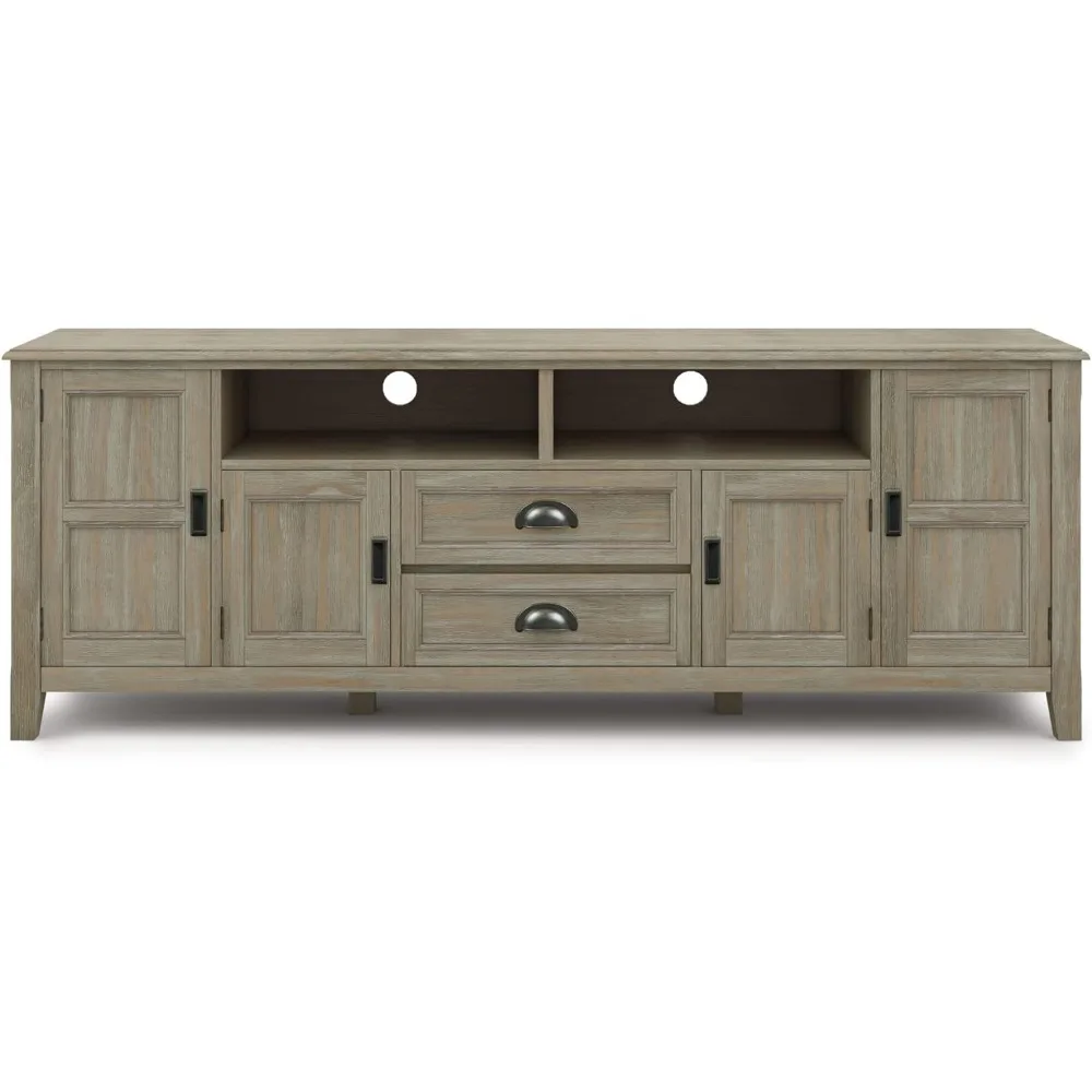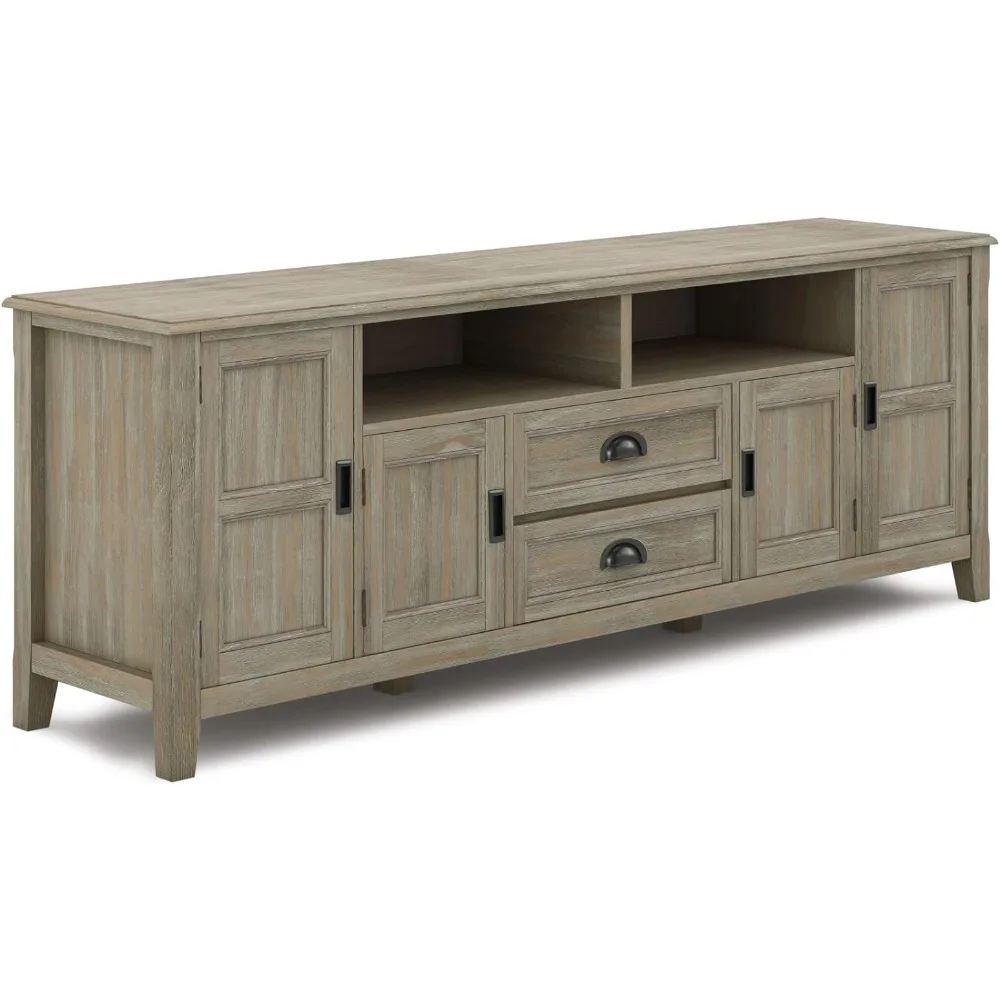 Now that 80 inch flat screen TVs are more affordable, you need to have one. To enjoy it fully, you will also need the perfect TV Stand to position your TV just right. Look no further. The 72 inch wide TV Stand is perfectly sized for TV's up to 80 inches. It has plenty of storage space for all your media and gaming devices. It has a two centrally located open areas with two drawers as well as two enclosed spaces. The two large side storage cabinets open to one adjustable shelf each. The unit features cord management cut-outs for easy installation of TV and media components. Cord Management Cutouts to allow for neat & organized look for the wires from all your devices. Style includes rounded molded table top, ladder framed doors and drawers, square and slightly tapered legs and Antique Bronze classic drawer pulls. Efforts are made to reproduce accurate colors, variations in color may occur due to computer monitor and photography. At Simpli Home we believe in creating excellent, high quality products made from the finest materials at an affordable price. Every one of our products come with a 1-year warranty and easy returns if you are not satisfied.