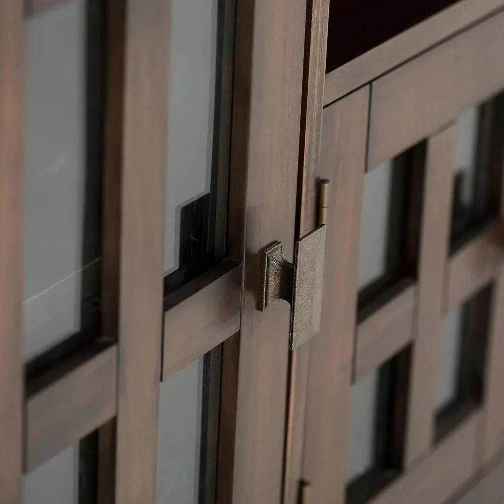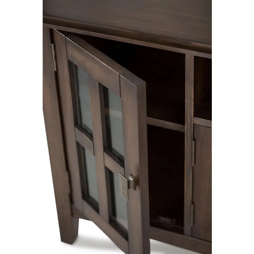 - Features a large centrally located open area with one (1) flip down drawer, one (1) pull out drawer as well as four (4) storage spaces with tempered glass doors.