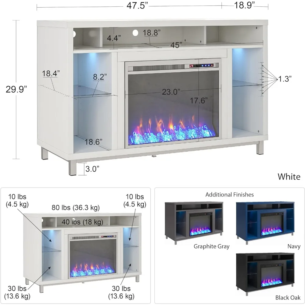 Step away from the ordinary and give your living room a modern makeover with the Lumina Fireplace TV Stand. Don't let the simple look fool you, this stand comes with a 23" electric fireplace insert with all the bells and whistles. Ready to warm up a 400 square foot room with the touch of a button, you can relax knowing that timers will take care of the rest. If you want to simply enjoy the look of the flames without the heat, use the included remote to switch off the heat option and pick your flame brightness. The fun doesn't stop there though. On either side of the fireplace insert are 4 shelves, 2 glass, that hold your entertainment components like gaming systems, a DVD player, DVDs and more. Both of the side shelves are illuminated with blue lights to coordinate with the glowing fireplace. These lights can be turned off if you prefer not to have them on. The top divided shelf is ideal for your audio and video equipment. This Fireplace TV Stand has a mix of white laminated particleboard and MDF construction with metal feet and tempered glass shelving. Combined together this Stand makes for a very sturdy addition to your room. The top can hold up to a 48" flat paneled TV with a maximum weight of 80 lbs. Two adults are recommended to assemble this Fireplace TV Stand. After assembly, the Stand measures to be 29.875"H x 47.5"W x 18.875"D.