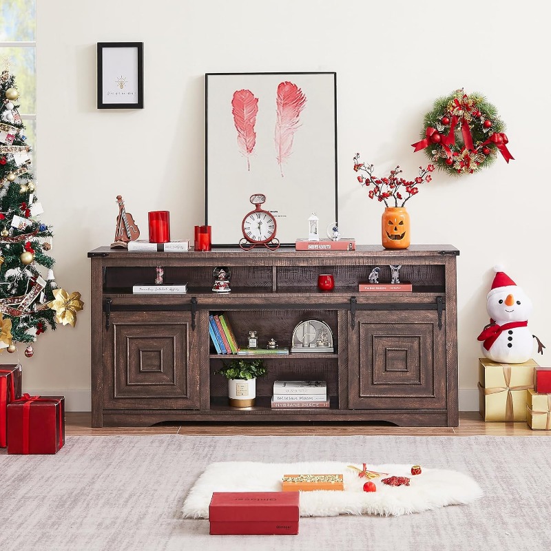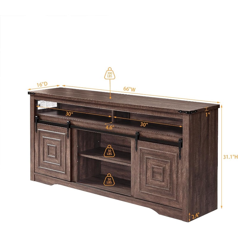 DIMENSION:Size of TV stands is 66" W x 16" D x 31.1" H. This entertainment center with storage is suitable for 75+ inch TV. Combined traditional farmhouse and modern style, With its stylish design and practical features, farmhouse television stand sure to enhance your home entertainment experience.