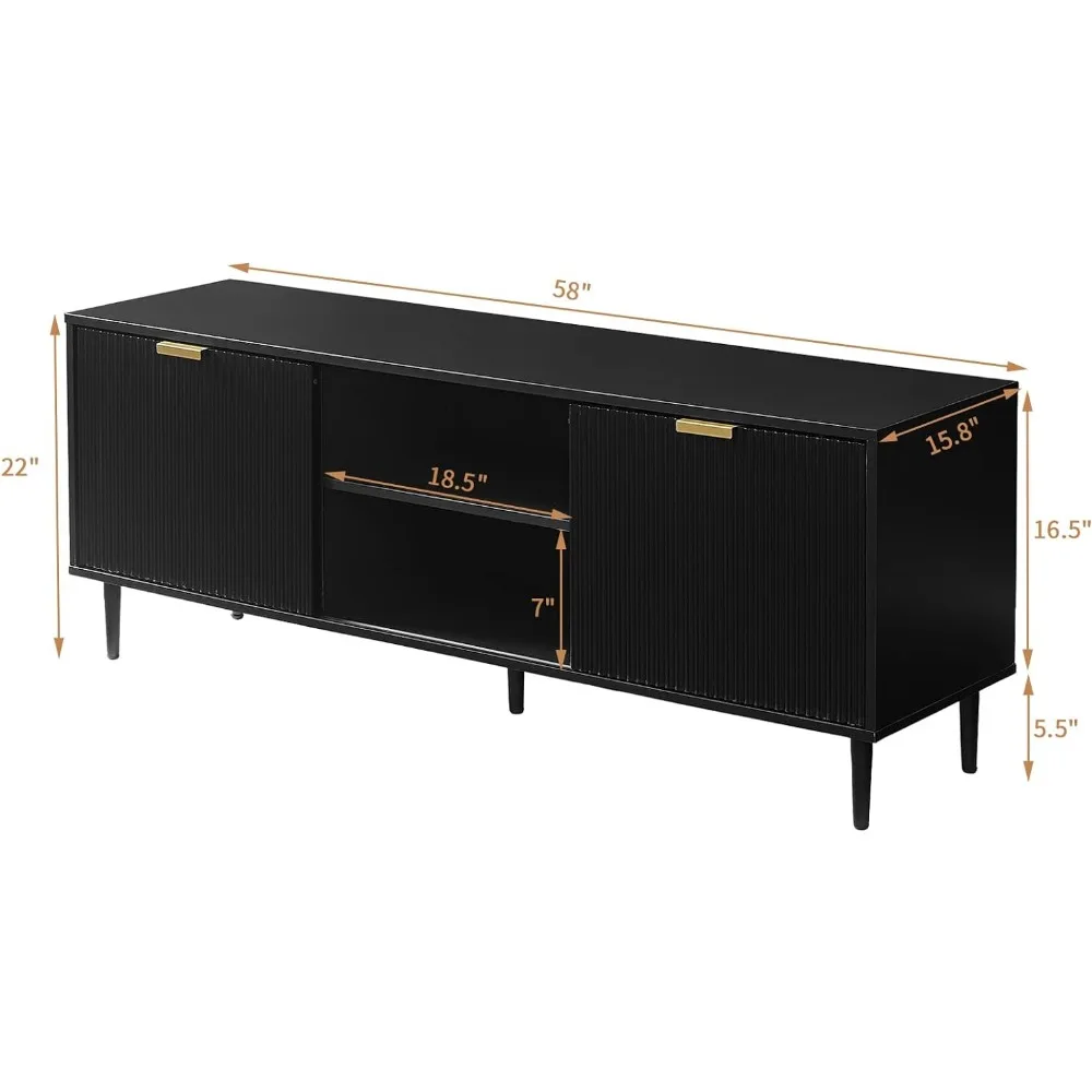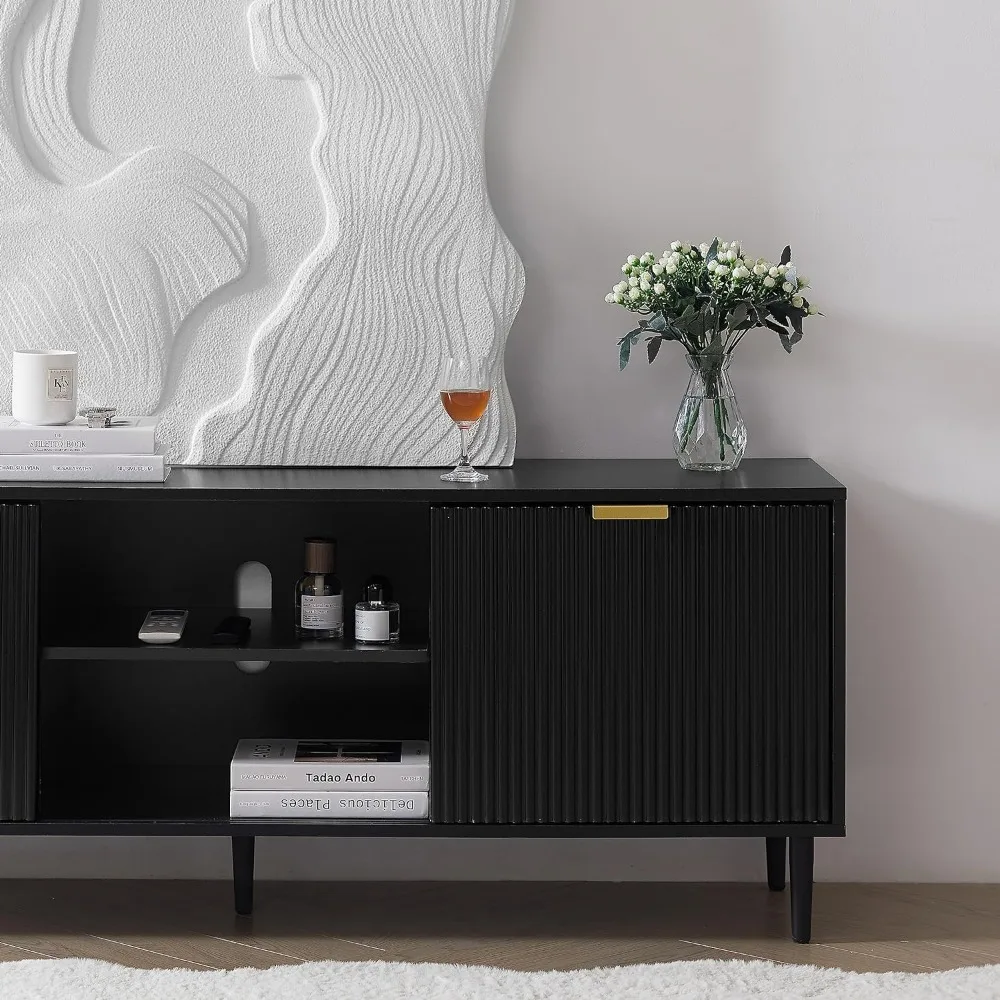 - MODERN STYLE & SLIDING DOORS: Minimalism tv stand is easy go with other furniture in your home. With special technology, the fluted panel design is in style and elegant. Equiped with moveable door, this black tv stand provides users customized ways to show or hide and make them easily and smoothly access to cabinets thanks for high-grade steel bar
