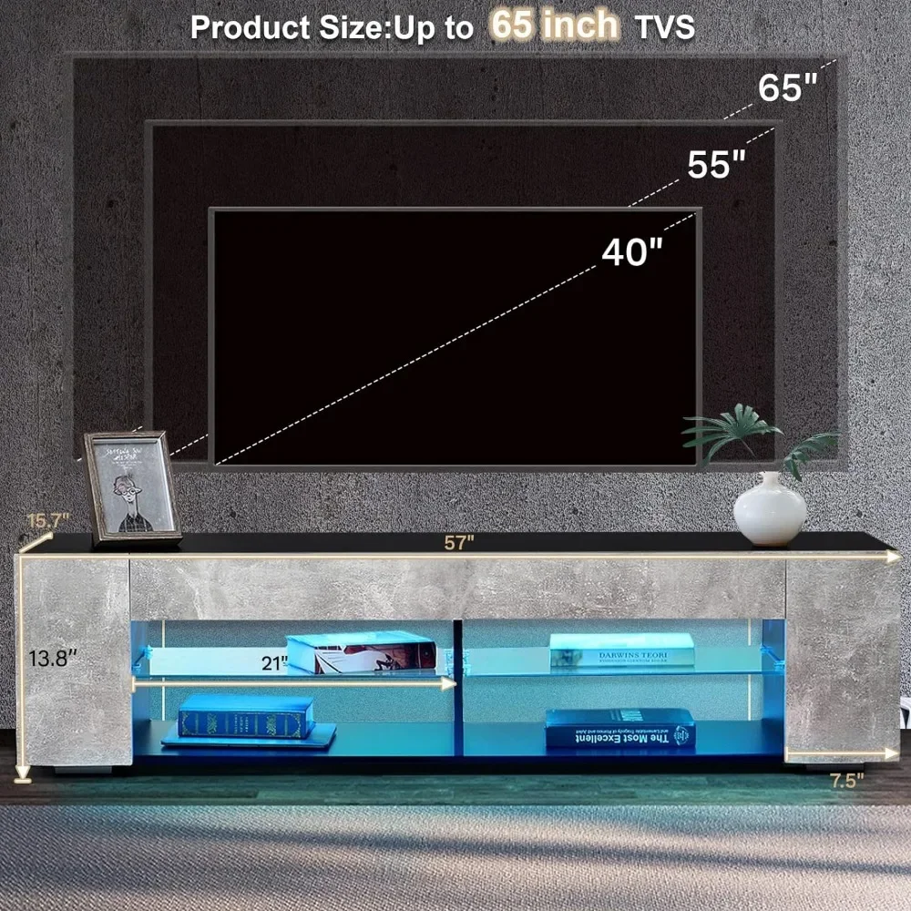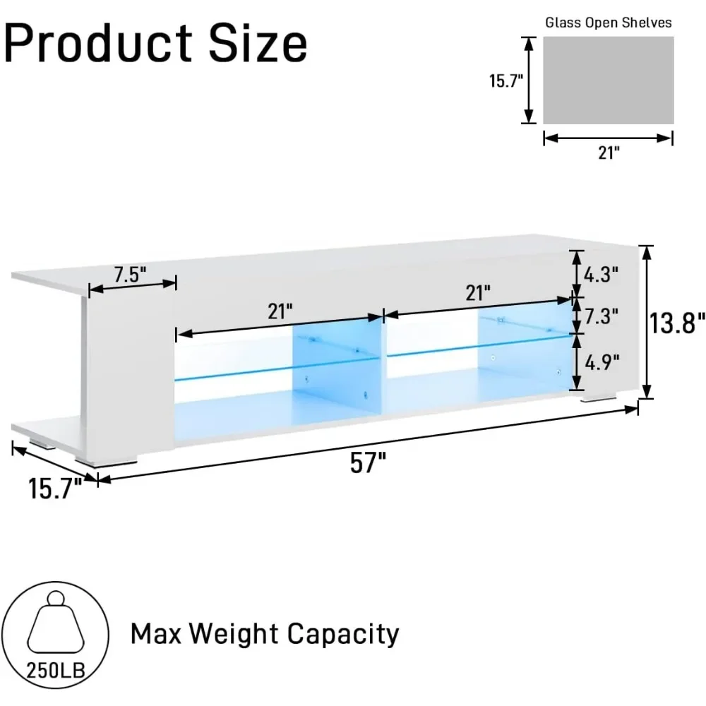 - [TV Stand with LED LIGHTS]: The sleek grey white TV stand boasts a radiant multi-color ambilight LED feature with a remote control, offering 29 dynamic styles and over color options for personalized ambience.