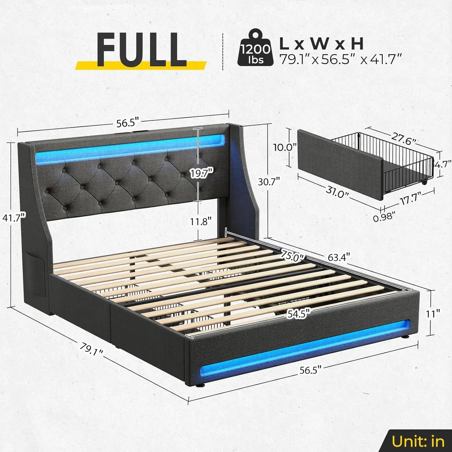 Twin Bed Frame With LED Lights And Charging Station, Upholstered Bed With Drawers, Wooden Planks, Noiseless And Easy To Assemble