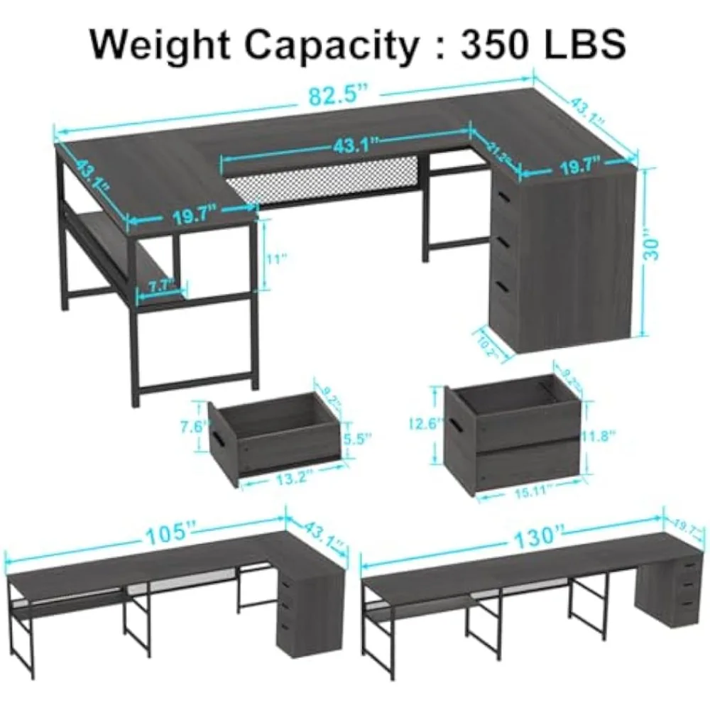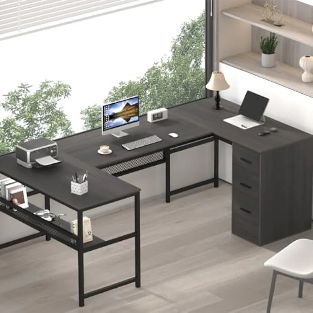 U Shaped Desk with Drawers, L Shaped Computer Desk with Storage Shelf, Large Reversible Wood Executive Home Office Desk
