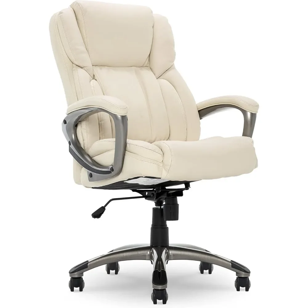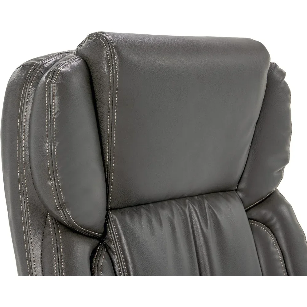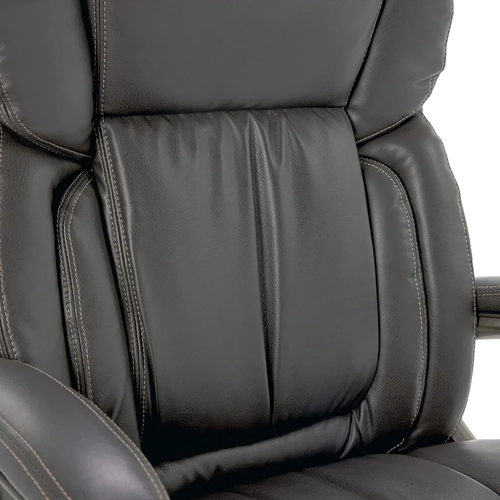 Bring relaxation to your busy workday with the Executive Office Chair. kept comfort in mind while designing this desk chair with luxurious layered body pillows, a contoured lumbar zone, and padded armrests for all day ease and exceptional support during long periods of sitting. The waterfall seat edge reduces pressure on the back of the legs and increases circulation, which helps decrease fatigue while seated. The ergonomic office chair features both recline and seat-height adjustment settings, allowing you to find your optimal seating position. The heavy-duty painted base with scuff-resistant foot pads is designed for long-lasting, reliable use. This desk chair is upholstered in supple bonded leather with contrast stitching. It measures 26-inches wide by 30-inches deep by 44-1/2-inches high and comes with a one-year limited warranty.