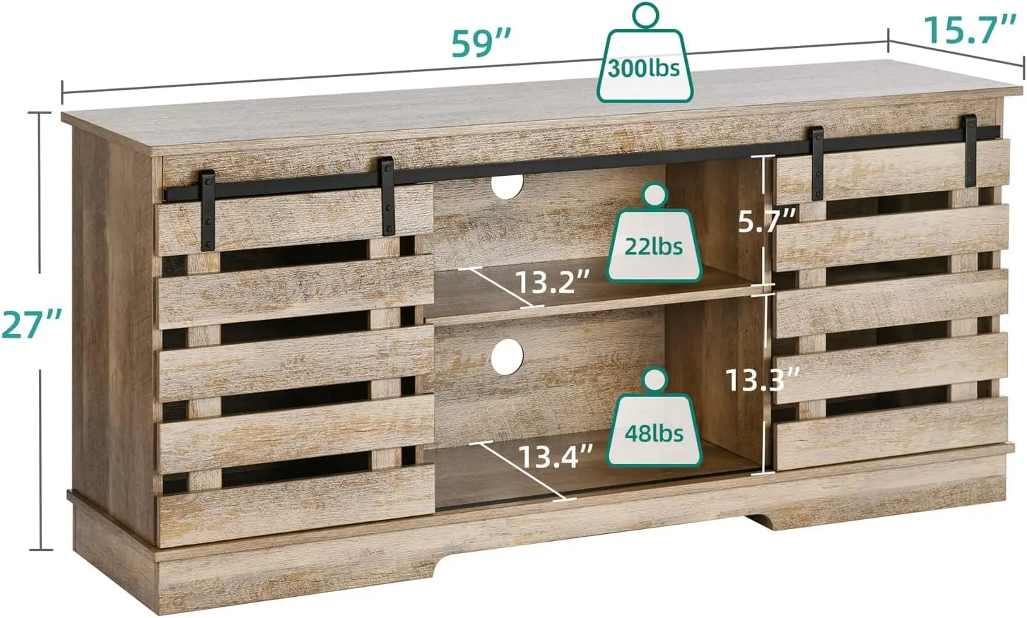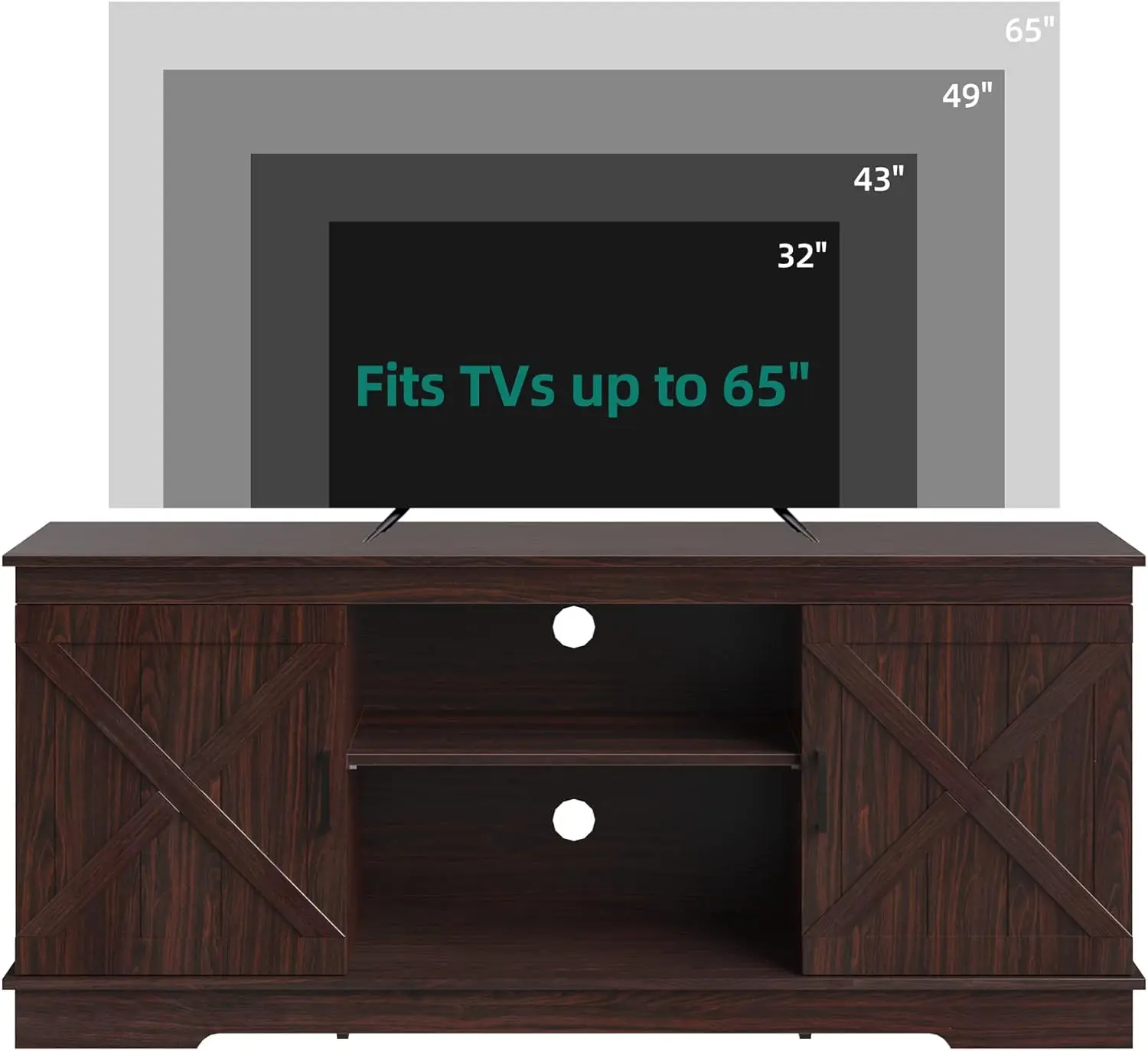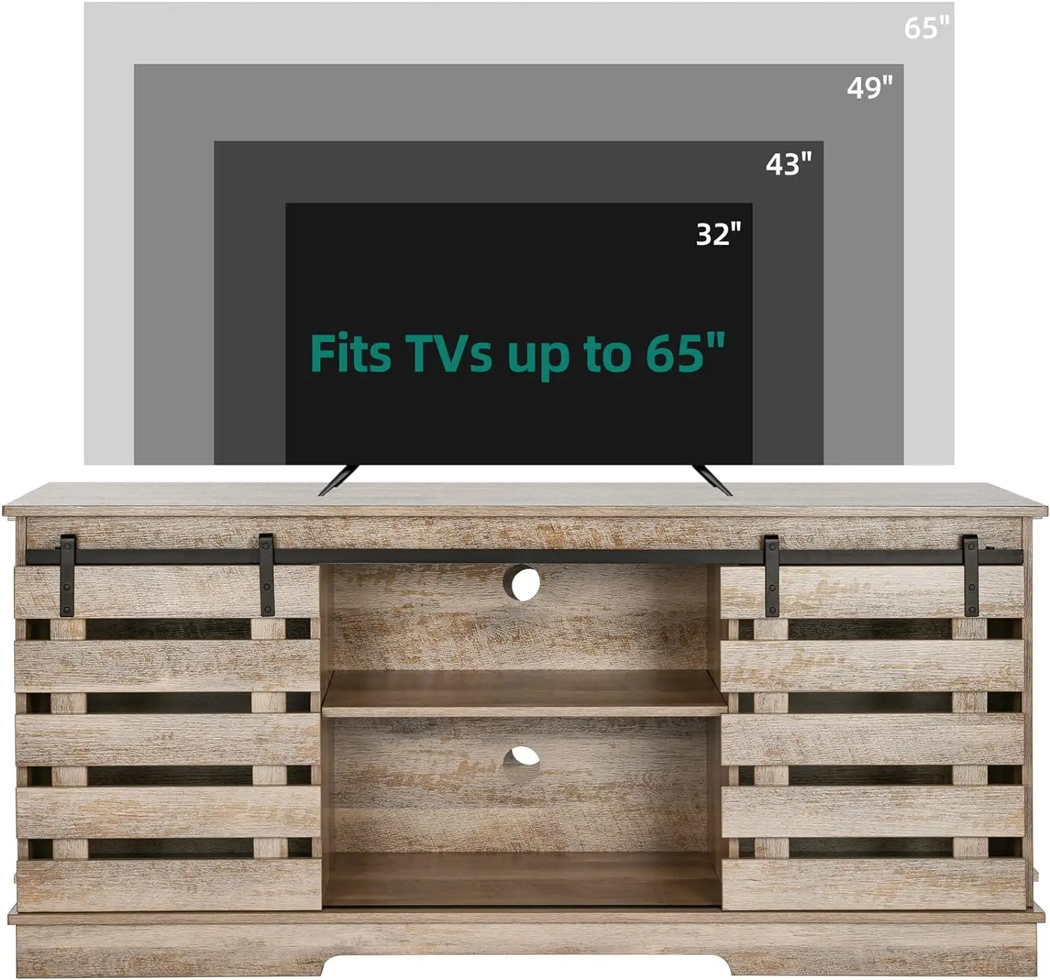 • SCRATCH-PROOF & STURDY FOR 300LBS - The farmhouse TV stand is made from well-done P2 MDF with high-level wood grain. This TV stand fits 50/ 55/ 60/ 65 inch TV. Dimensions: 15.7"D x 59.5"W x 26"H
