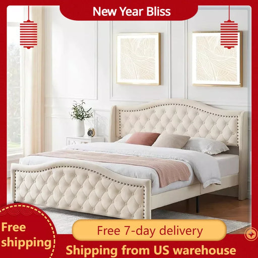 Original price $673.99Original price $673.99 - Original price $761.99Original price $673.99Current price $538.99$538.99 - $609.99Current price $538.99| /Bedroom furnitureKing size bed frame, padded platform bed with wingback high headboard, no springs, off-white
