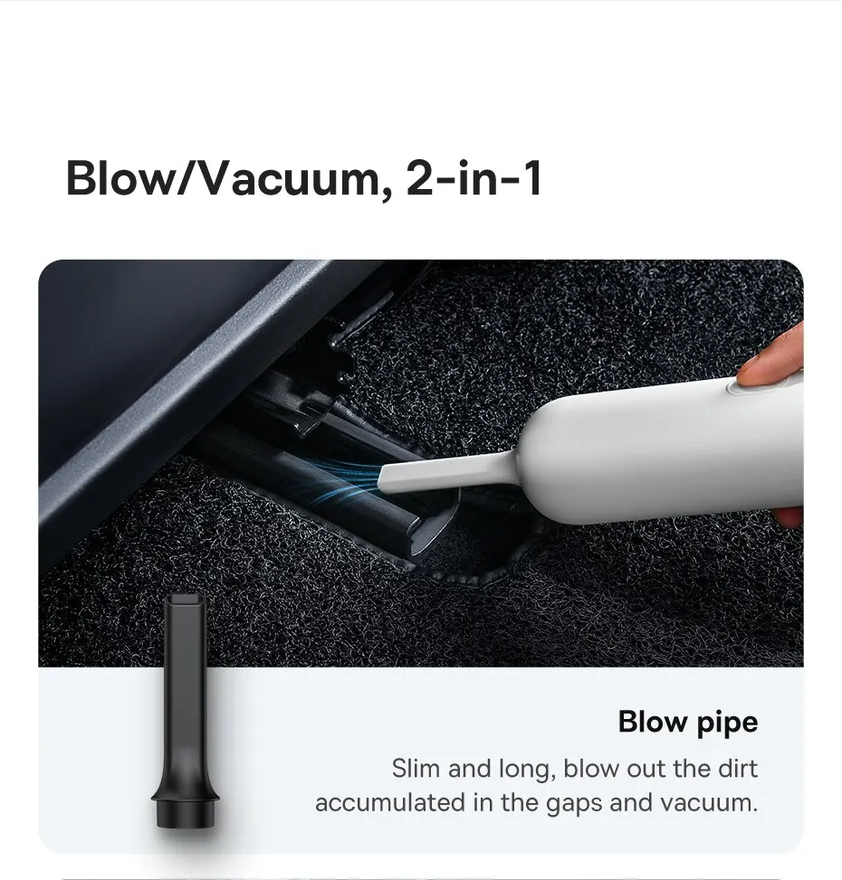 3. Use with the 2-in-1 suction nozzle, brush nozzle and blowpipe for special areas. Use with the 2-in-1 suction flat nozzle or the blowpipe for gaps.