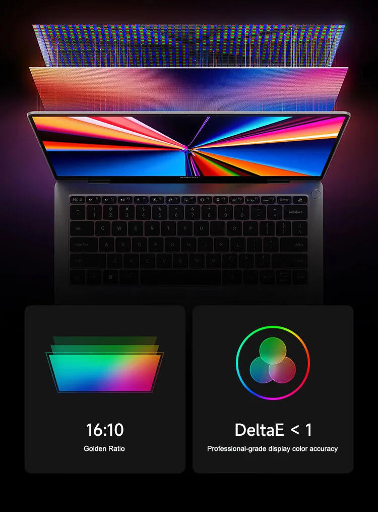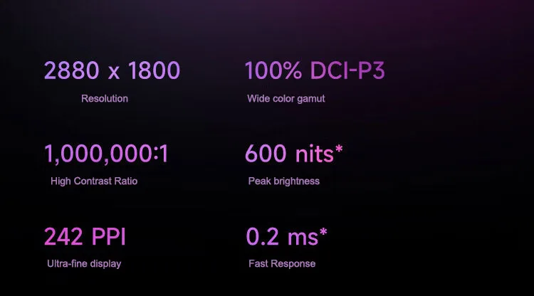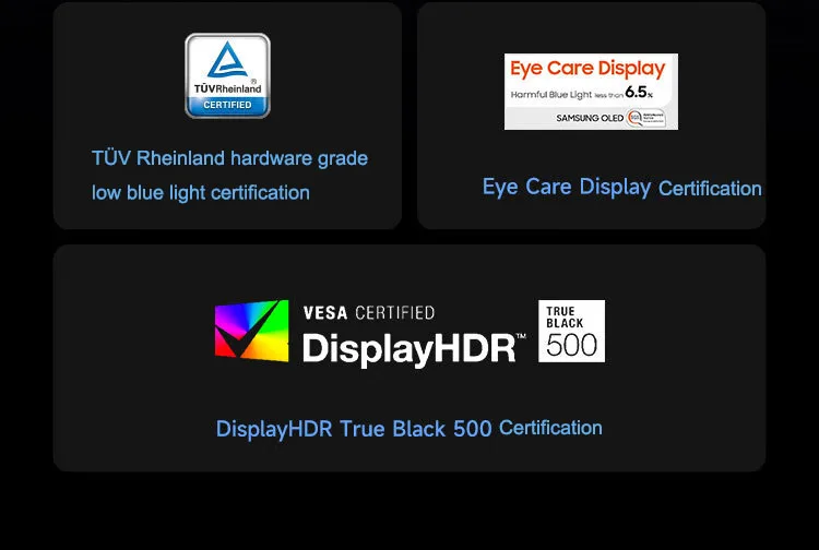 600nits Peak brightness, 1000000: 1 contrast, 100% DCI-P3 / Delta E <1* / AID lighting, passed the German Rhein TüV hardware-level anti-blue light certification