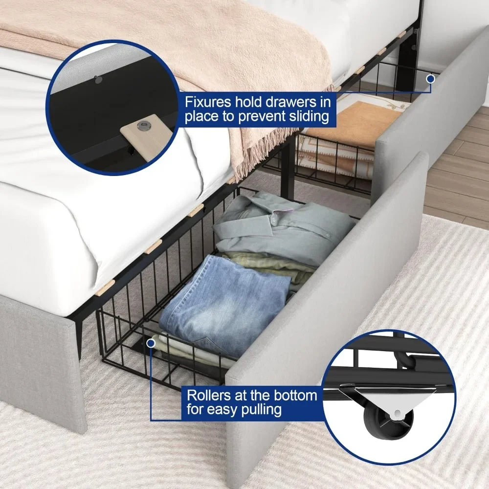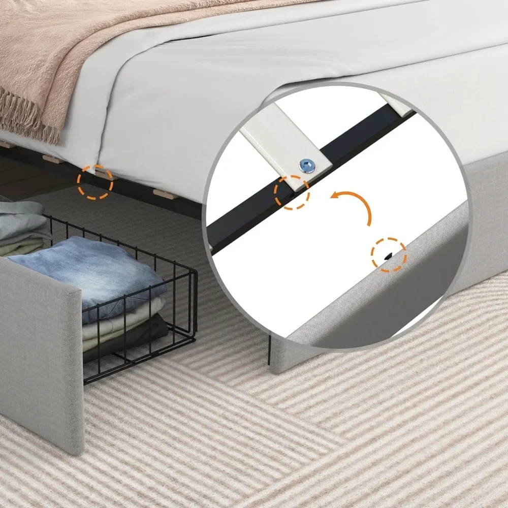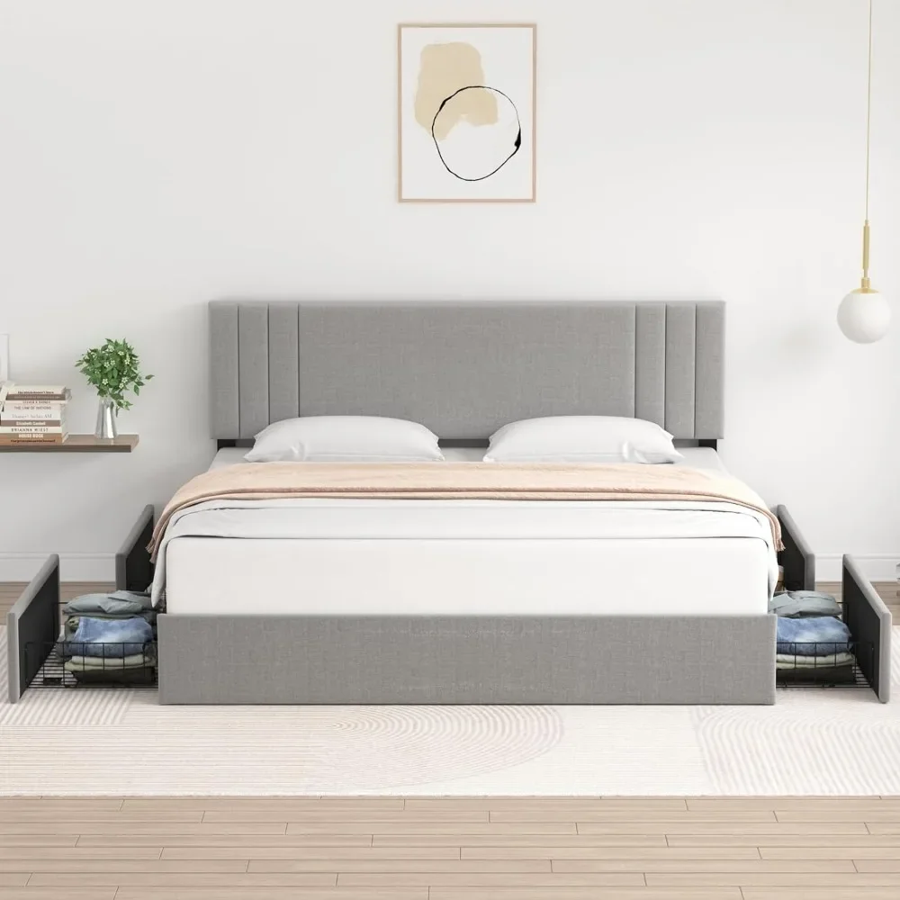 Bed Frame, Upholstered Large with 4 Storage Drawers and Adjustable Headboard, Sturdy Plank Support, Platform Bed Frame