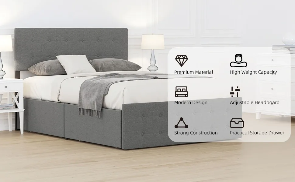 • Bed Frame with Drawer-Underneath the bed frame with four storage drawers to store your seasonal beddings and linen and a host of other personal essentials.