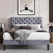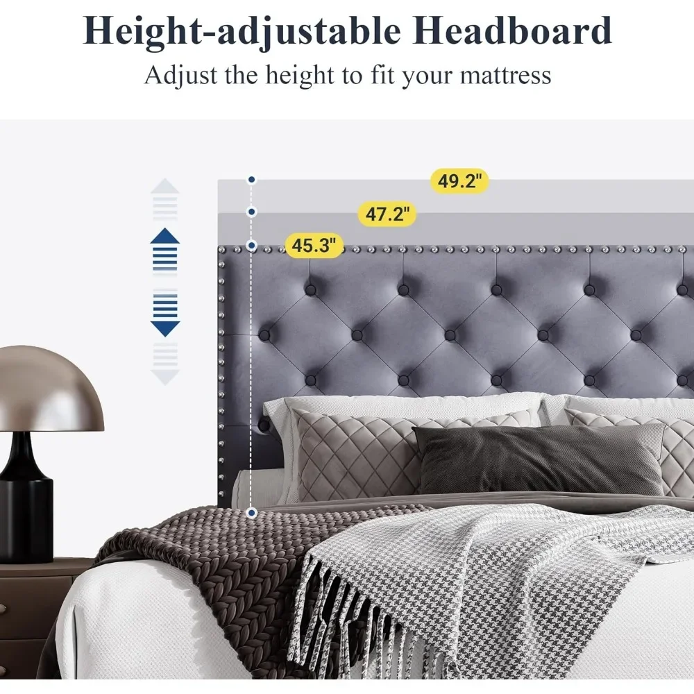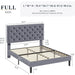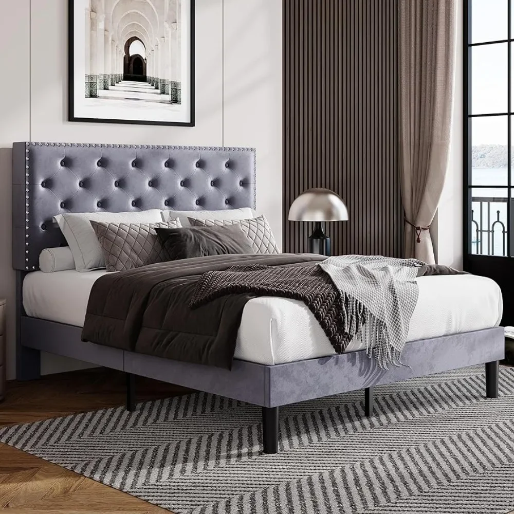 Bedroom furniture full bed frame, velvet upholstered platform bed, no springs required, light grey