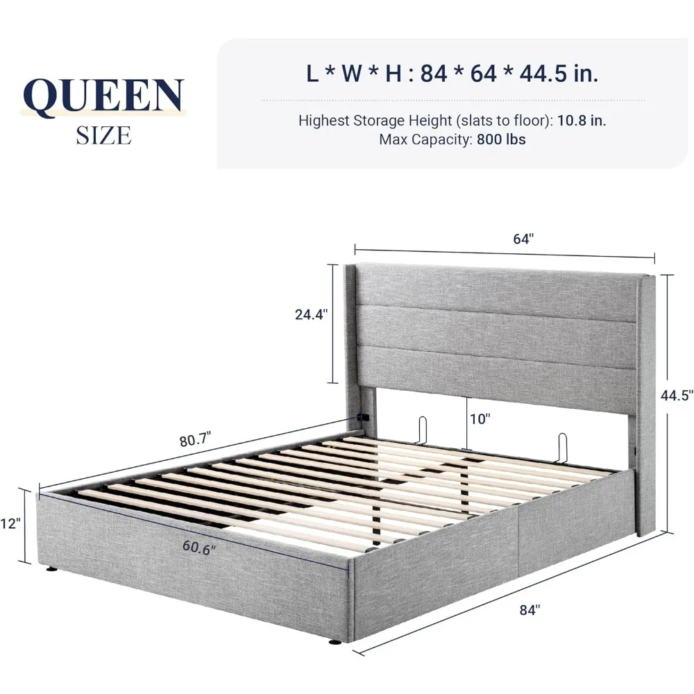 Bedroom furniture large lift storage bed, modern wing-back headboard, no springs required, hydraulic storage, light beige
