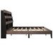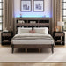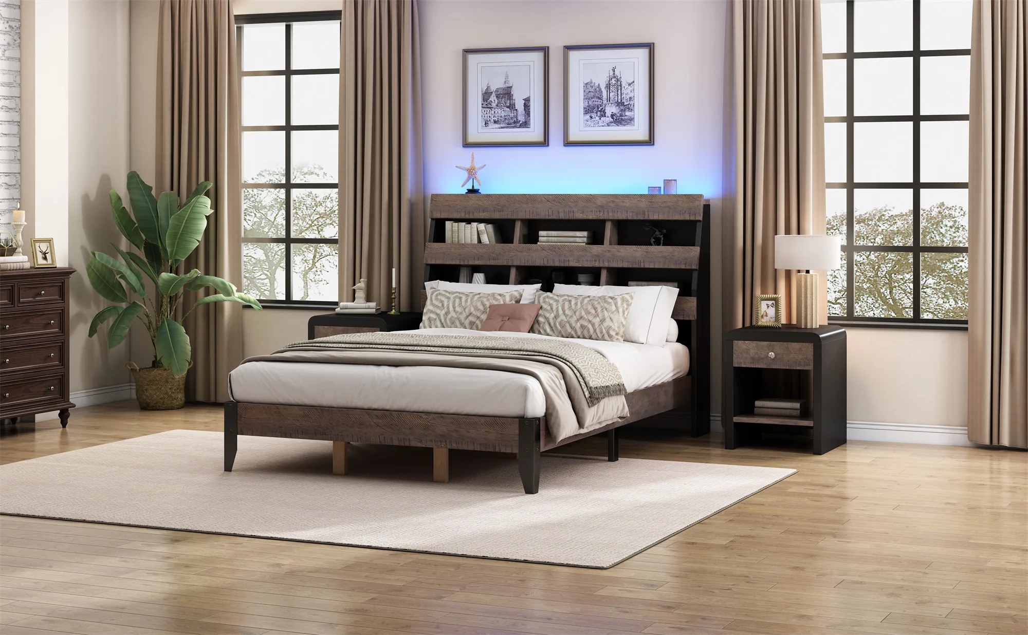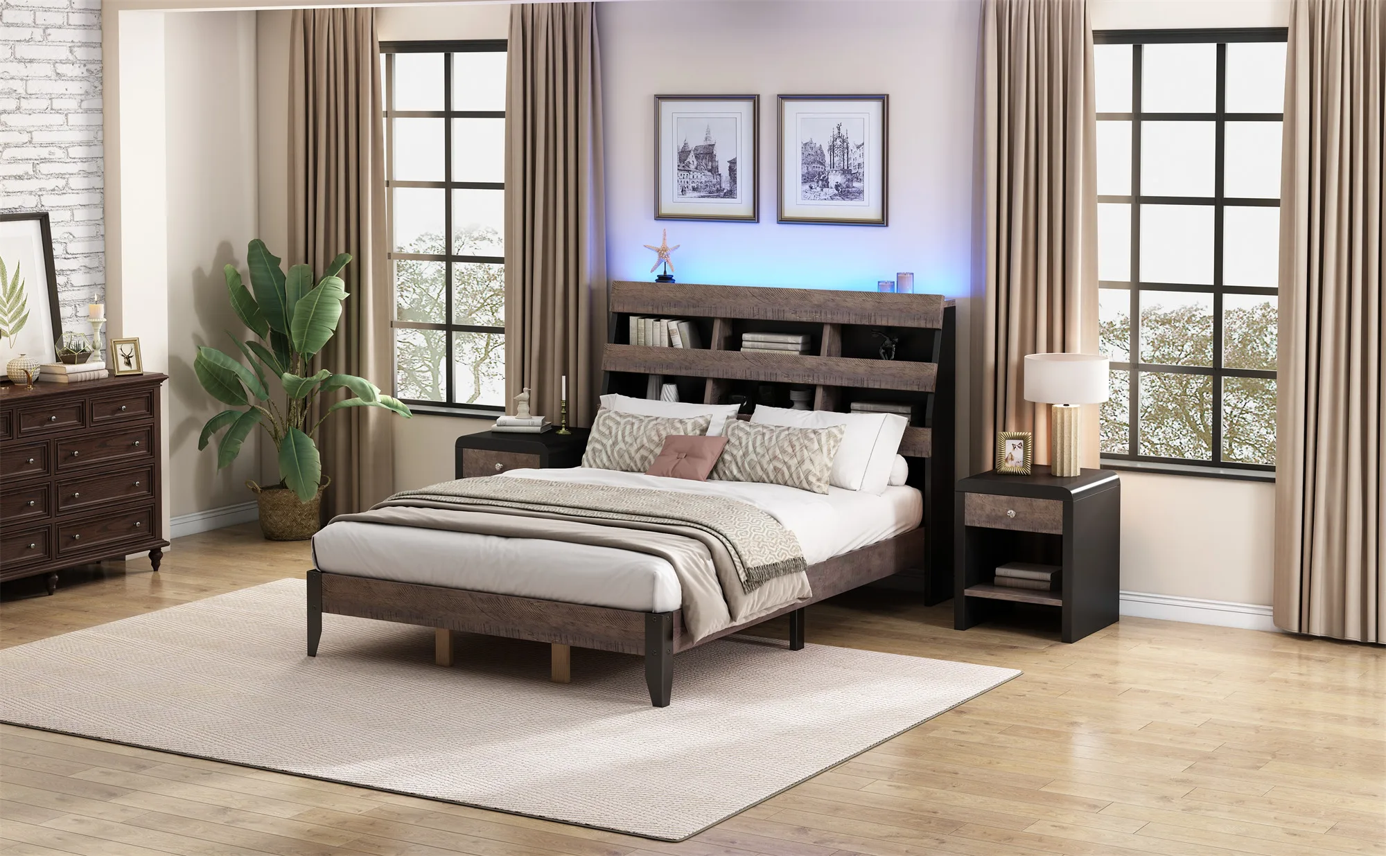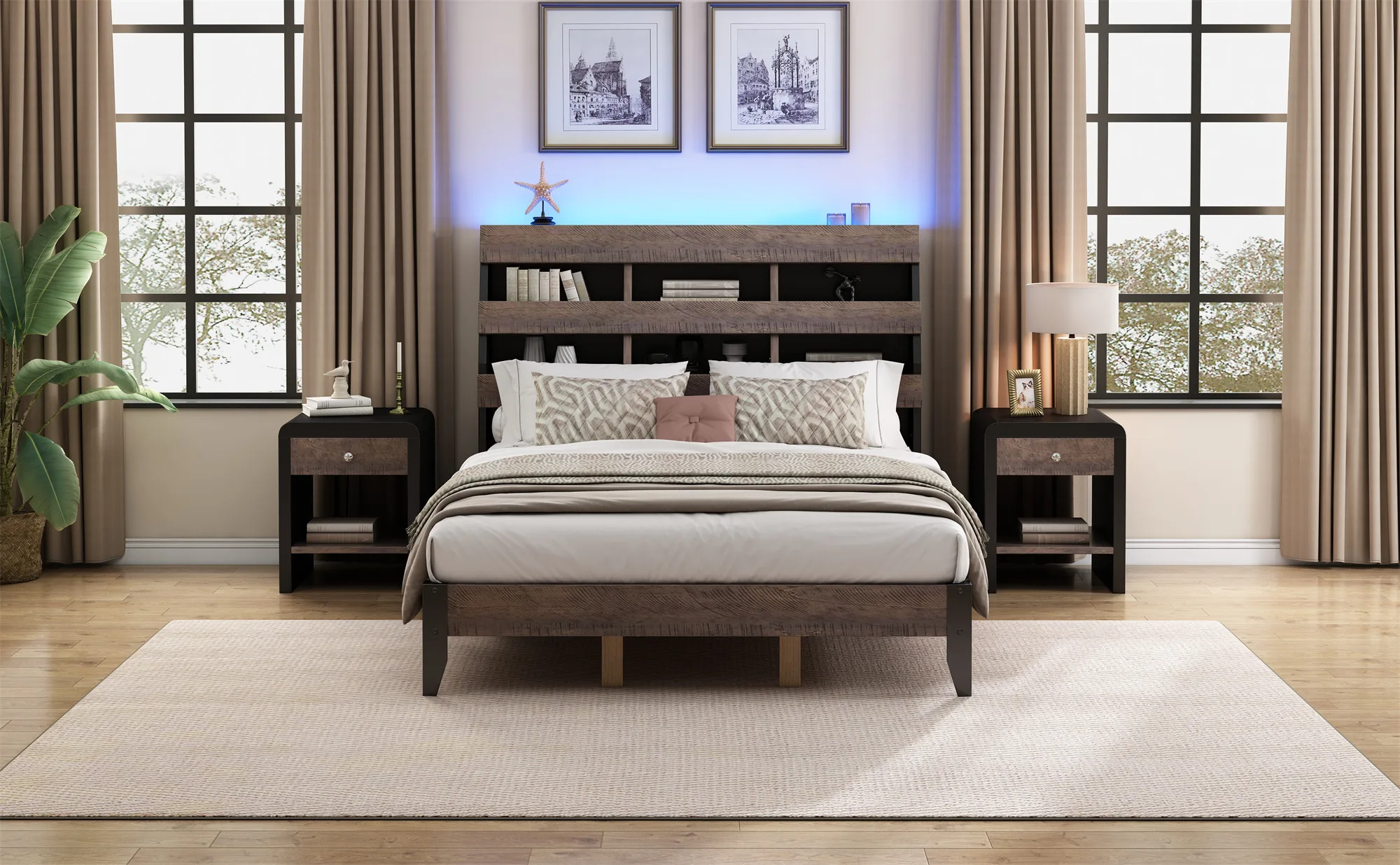 Bedroom Sets Mid Century Modern Style Queen Bed Frame with Bookshelf&LED Lights&USB Port Walnut Black[US-W]