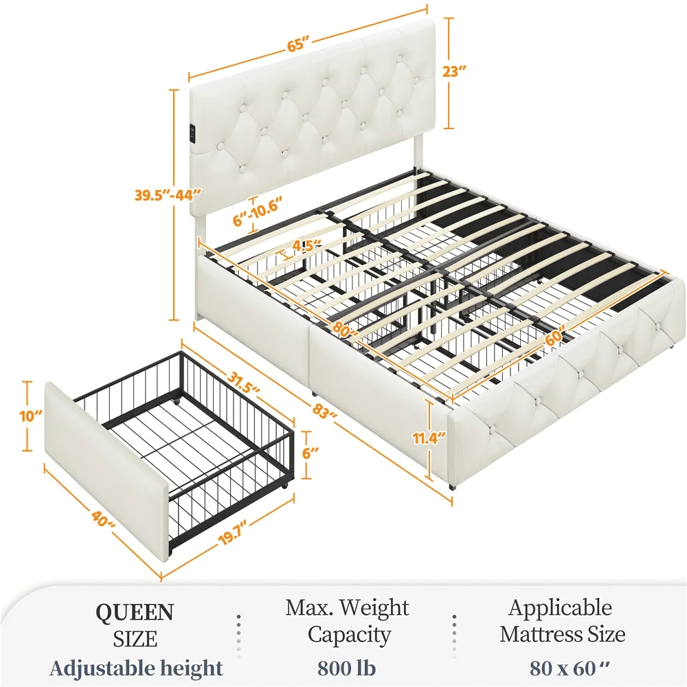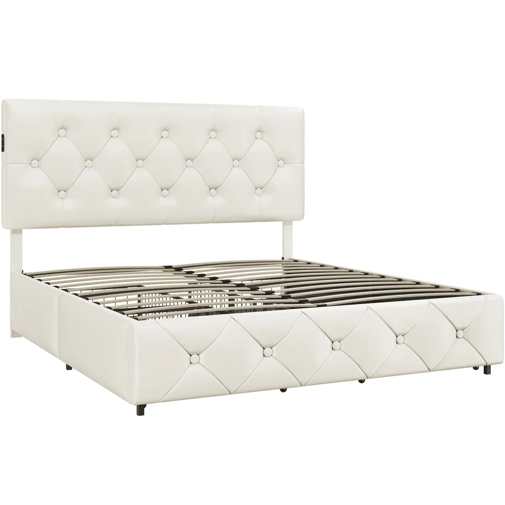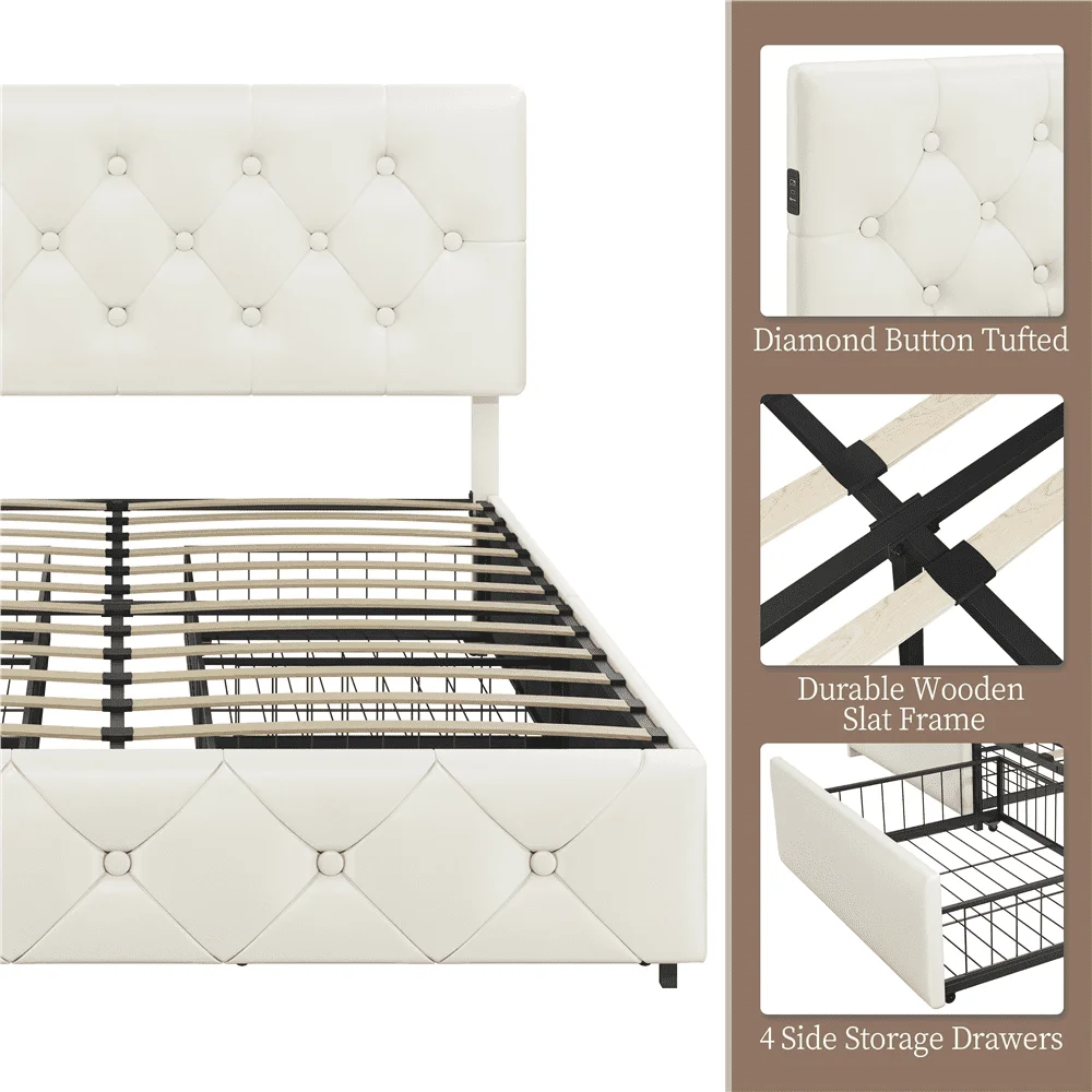 Faux Leather Upholstered Bed with 4 Storage Drawers and USB Ports,Queen,Beige: