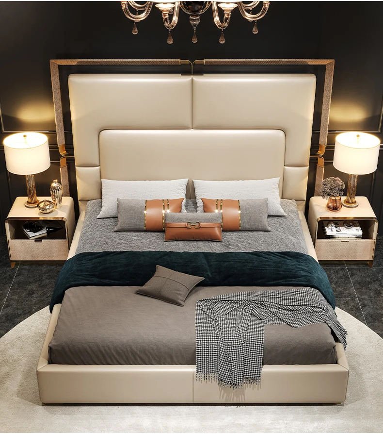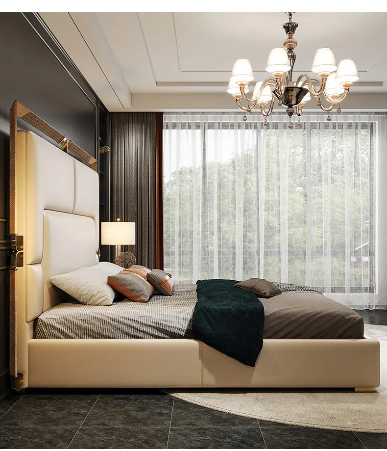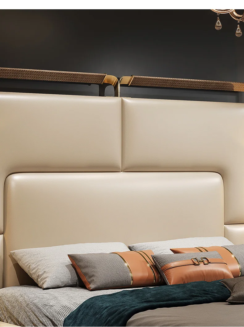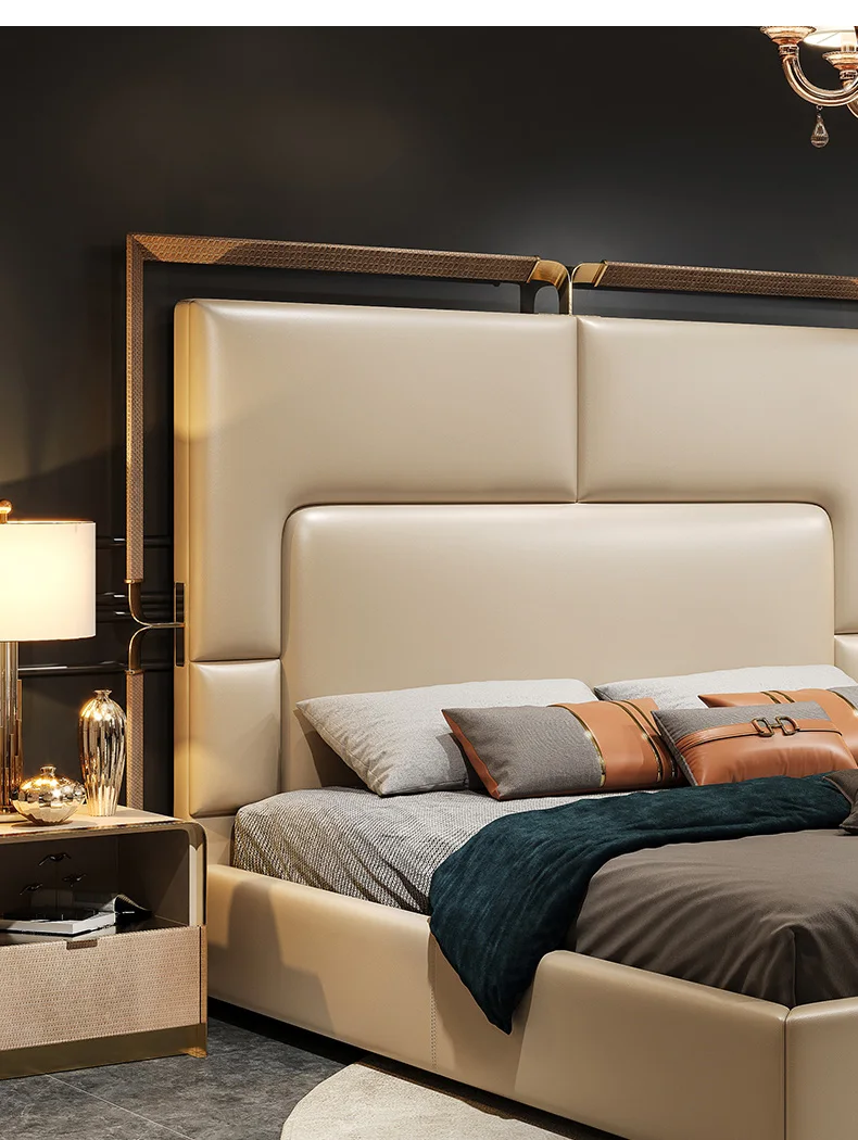 Light Luxury Leather Bed Master Bedroom Modern Simple 1.5M / 1.8M Double Bed High-End Villa Napa Head Layer Leather Wedding Bed