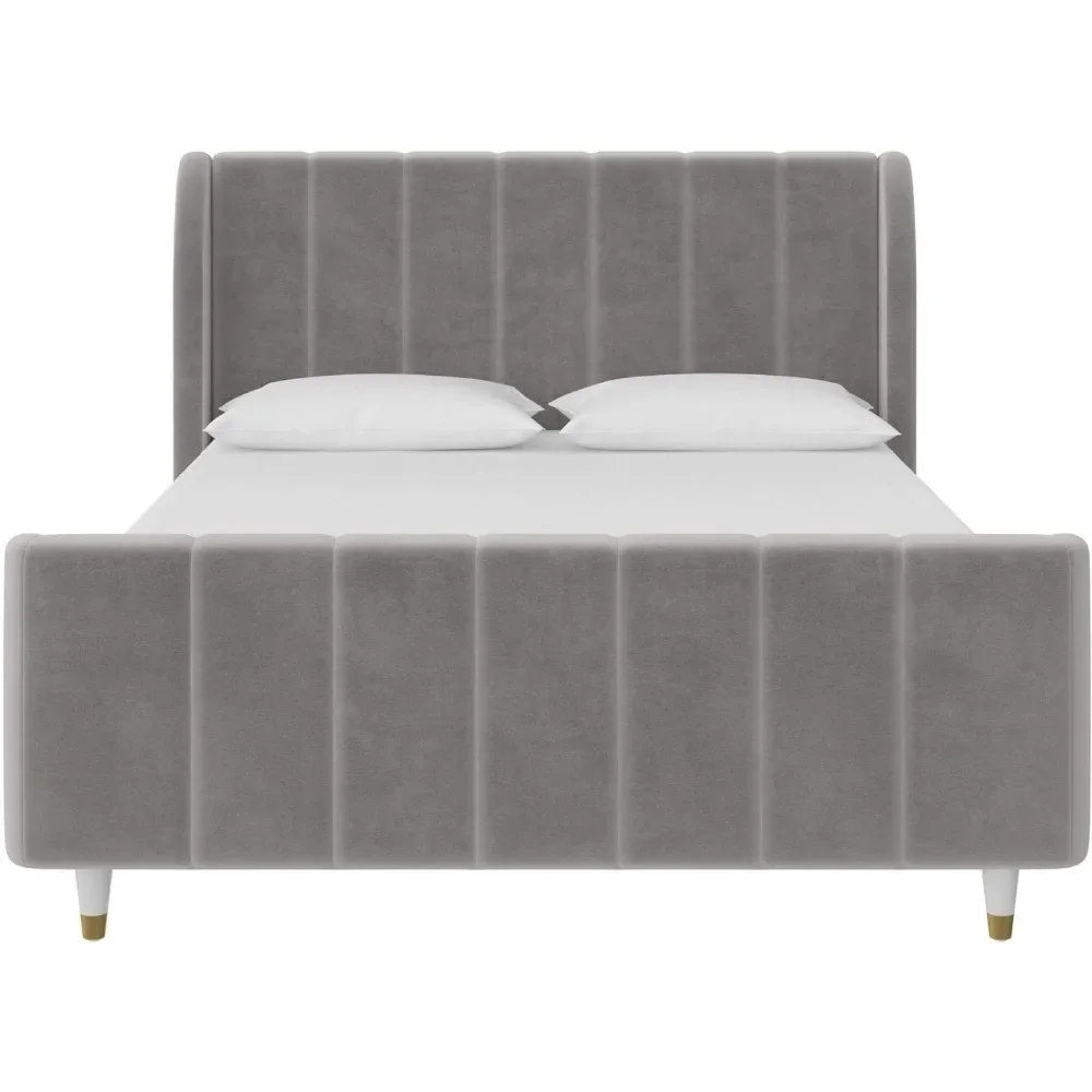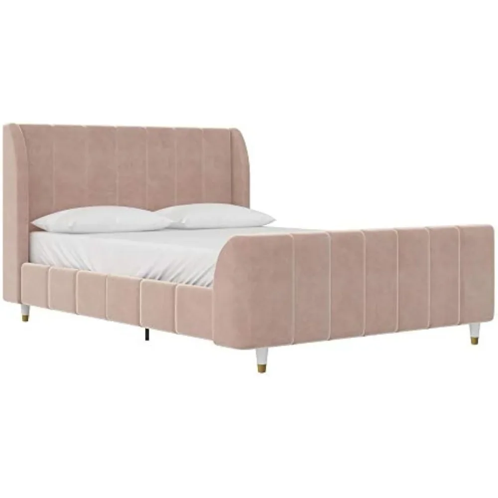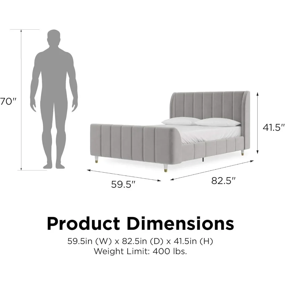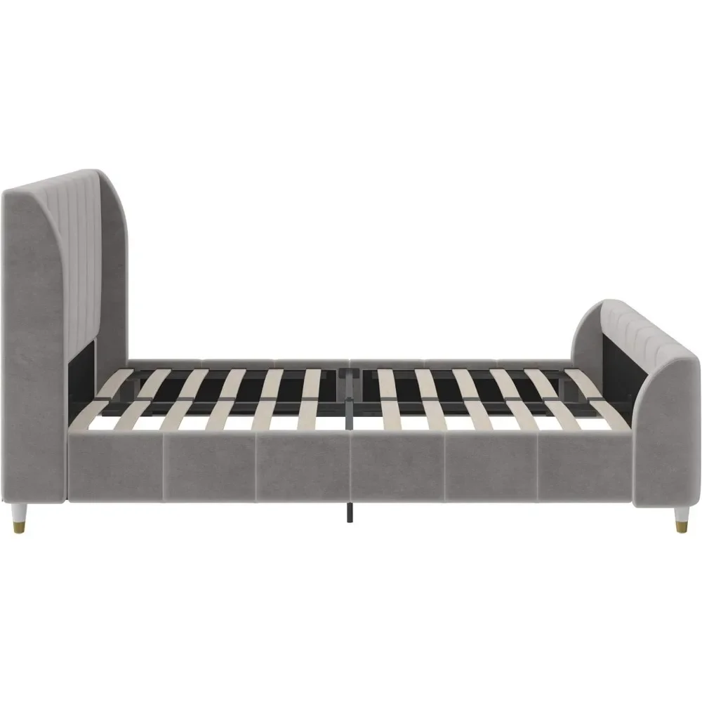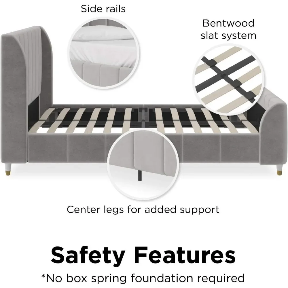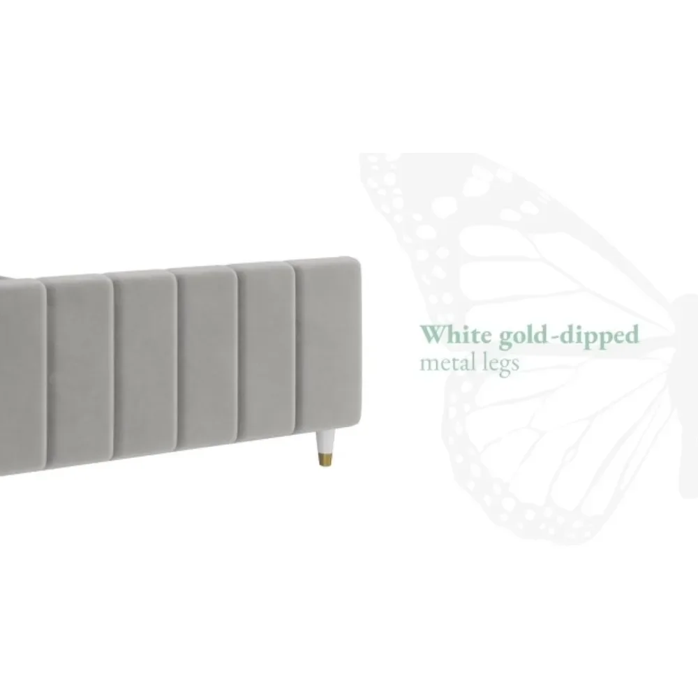 - Designed with soft velvet upholstery and white/gold dipped metal legs..Sturdy construction with metal side rails, additional center legs and a bentwood slats system. No additional box spring or foundation required.