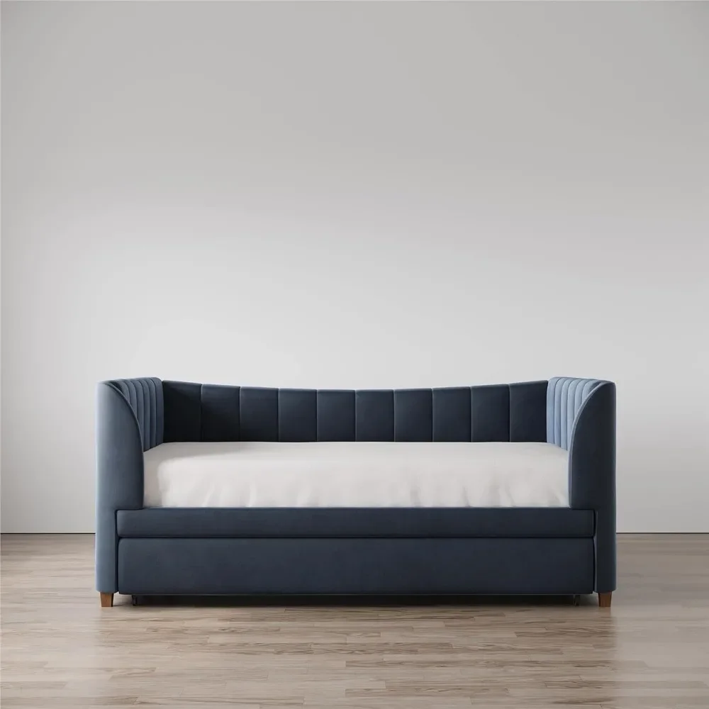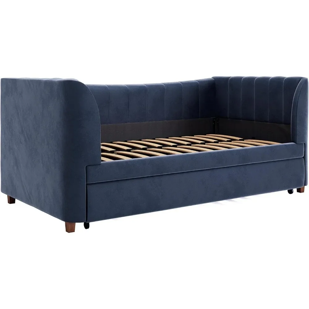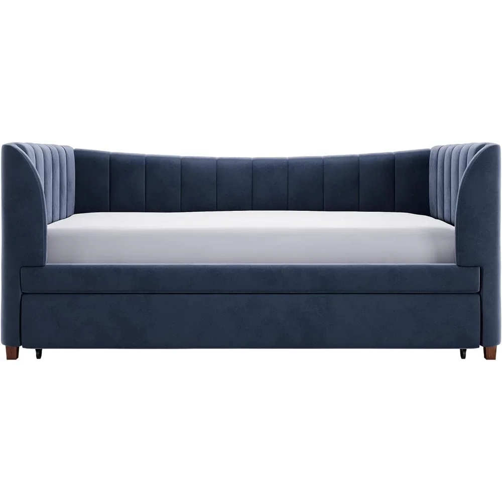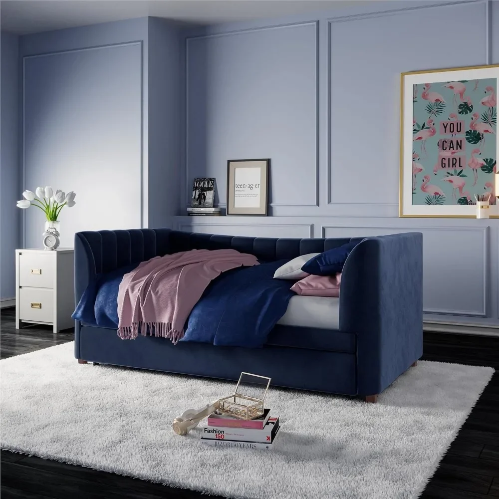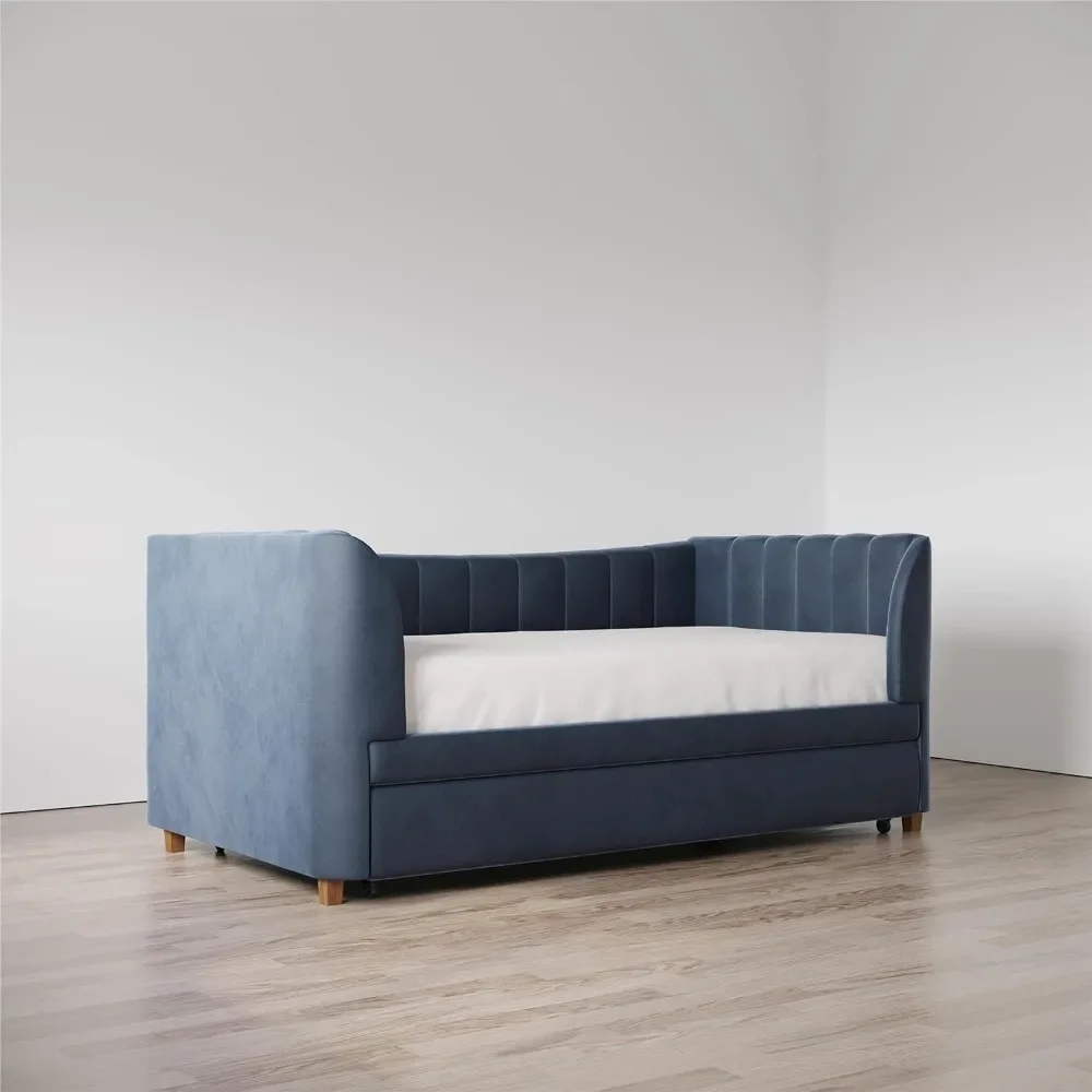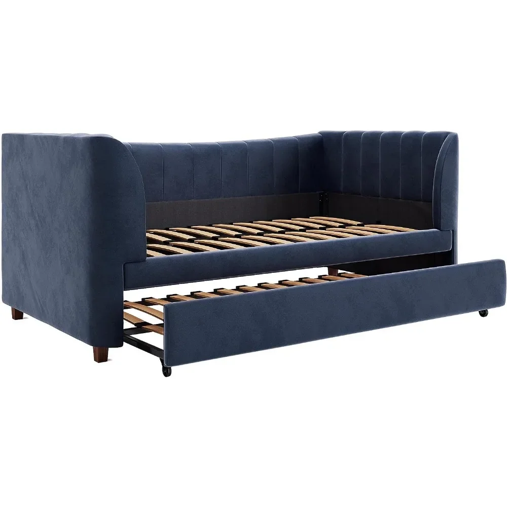 - Designed with soft velvet upholstery and white/gold dipped metal legs..Sturdy construction with metal side rails, additional center legs and a bentwood slats system. No additional box spring or foundation required.
