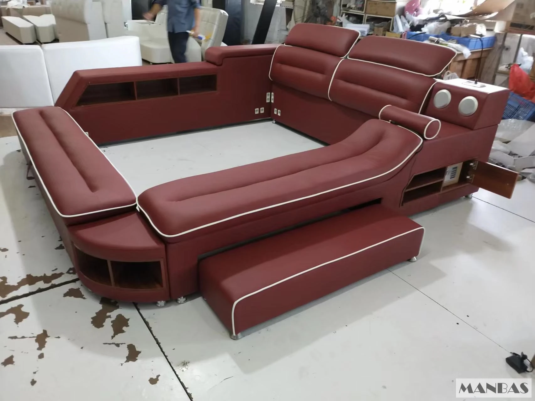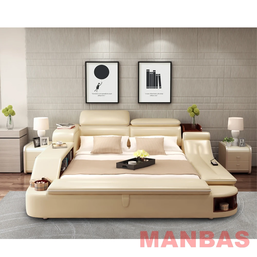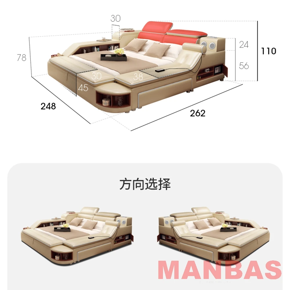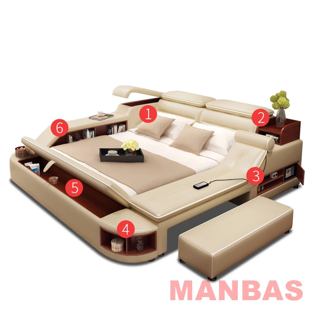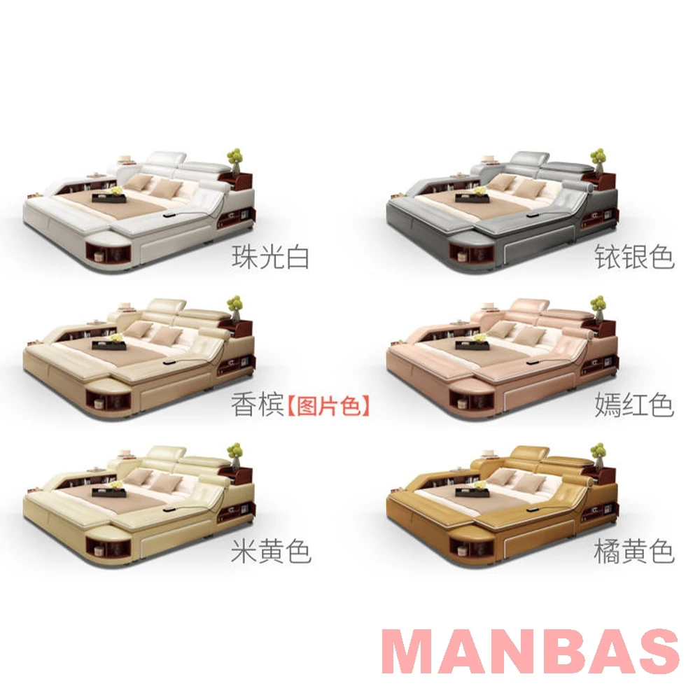 Get a Good Night's Sleep with the MINGDIBAO Multifunctional Bed - Genuine Leather Upholstery, Tatami, Massage, Speaker, USB Charge, Safe.
