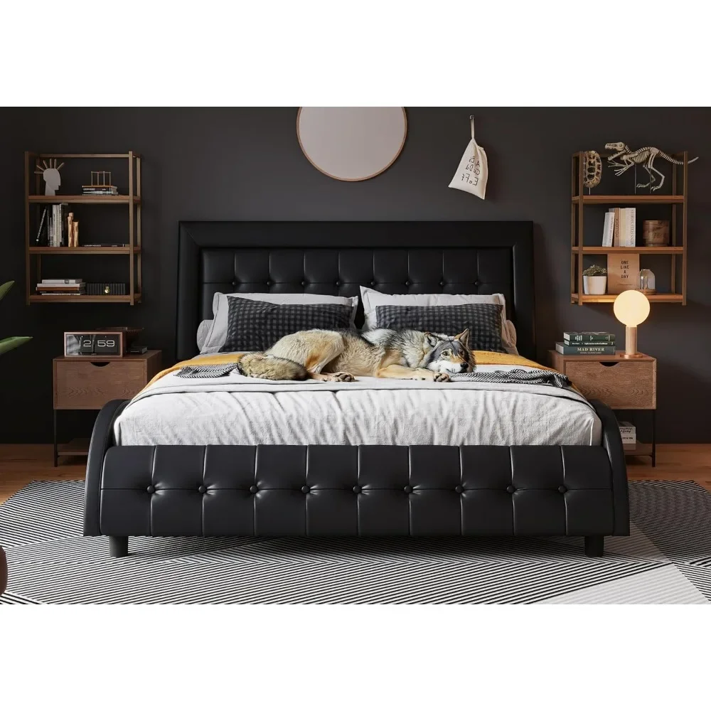 Platform bed frame, full-size box tufted, faux leather upholstered bed, black with adjustable headboard, wooden slatted support