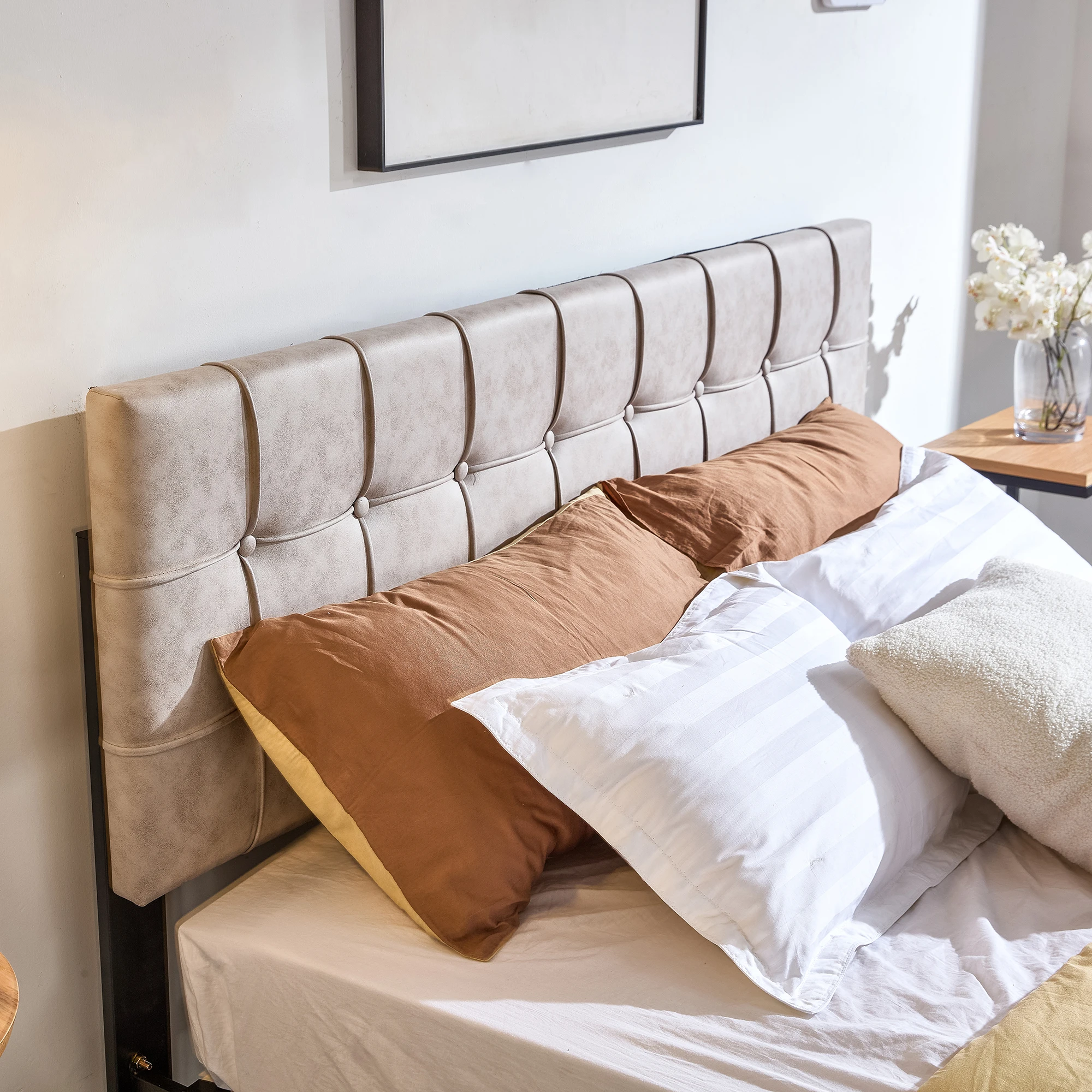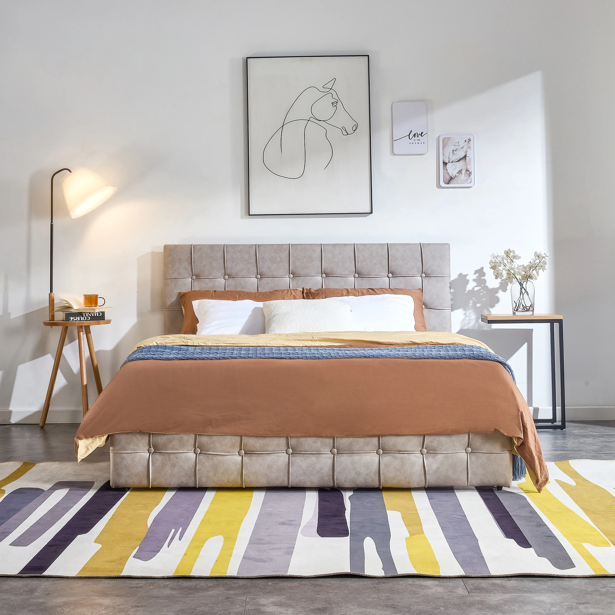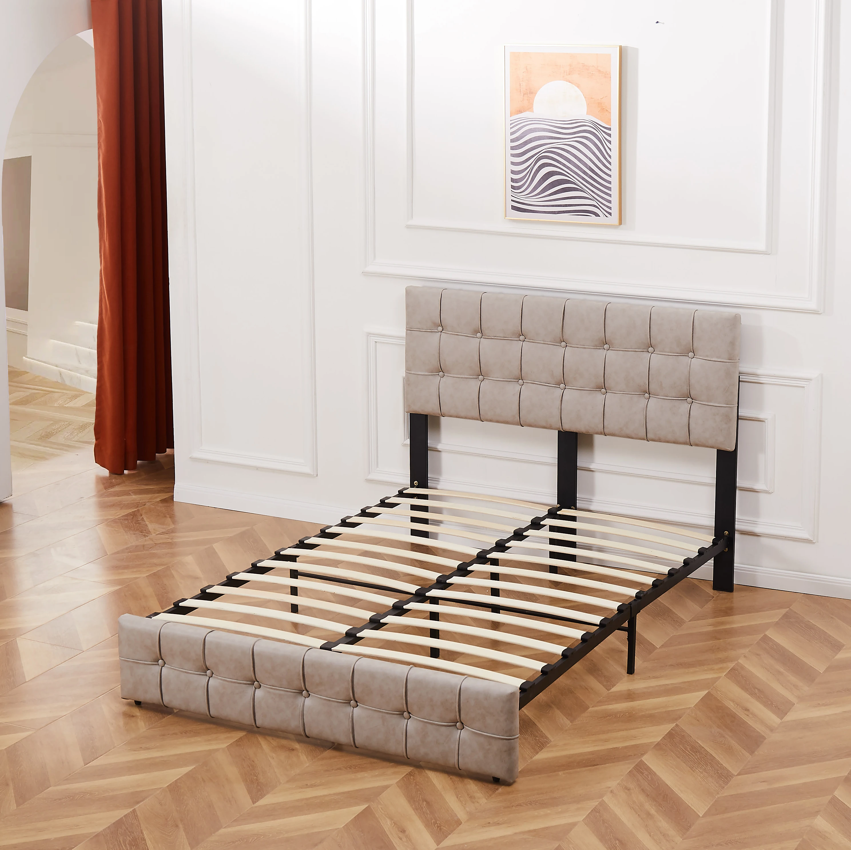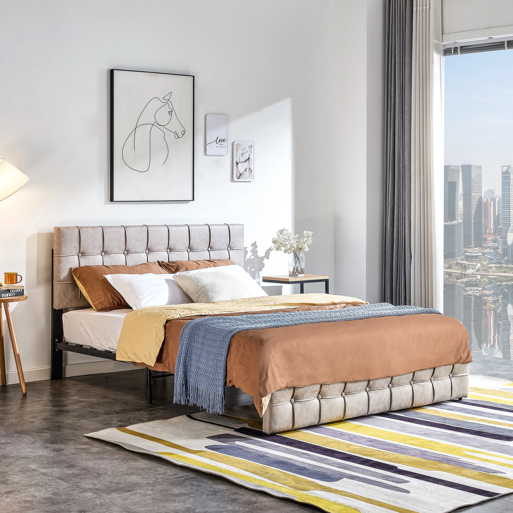 [Flash Sale]Queen/Full Bed Frame Modern Tech cloth Upholstered Platform Bed W/Adjustable Headboard Heavy Duty Button Wood Slat Support Grey/Beige Easy Assembly No Box Spring Needed[US-W]