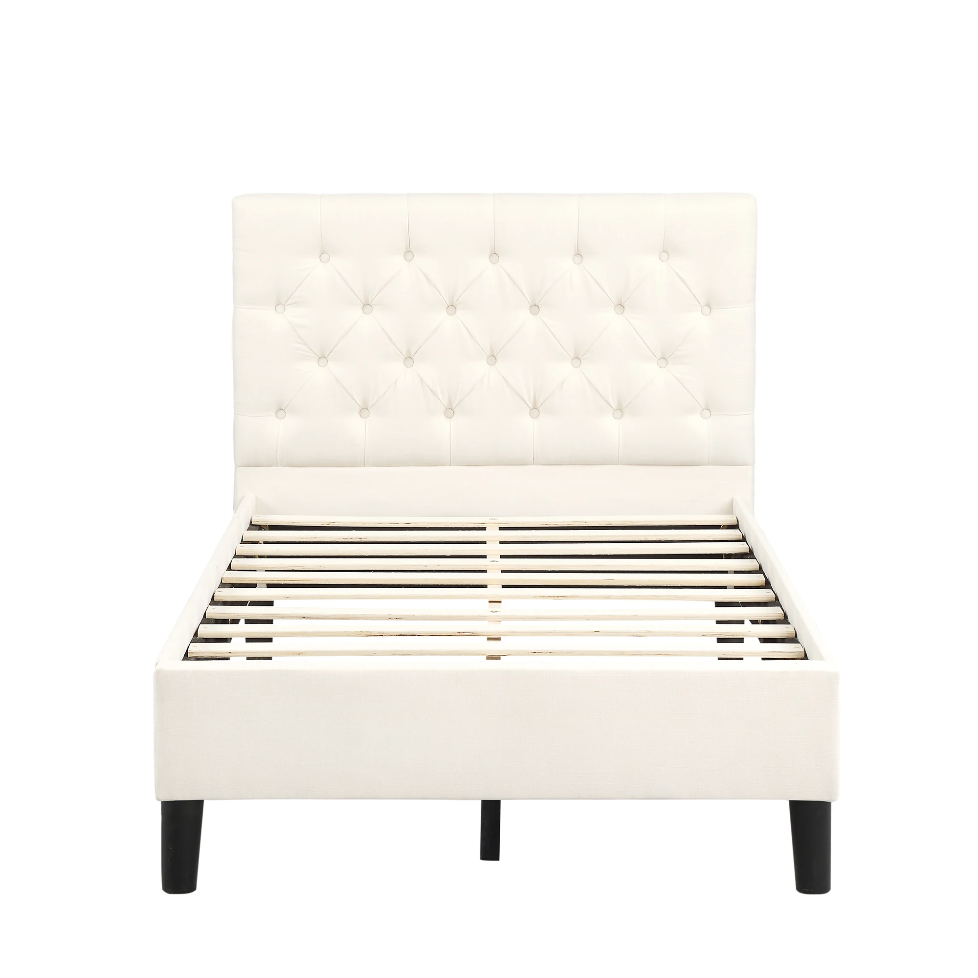 This beautiful Upholstered Platform Bed features button tufted upholstered headboard that adds a contemporary chic look to your bedroom and filled in thick foam to add extra comfort.Sturdy wood frame construction and a wooden slat system to add extra stability and safety. You don’t need to buy the box spring because this twin bed equipped with a lot of slats.