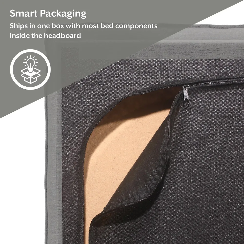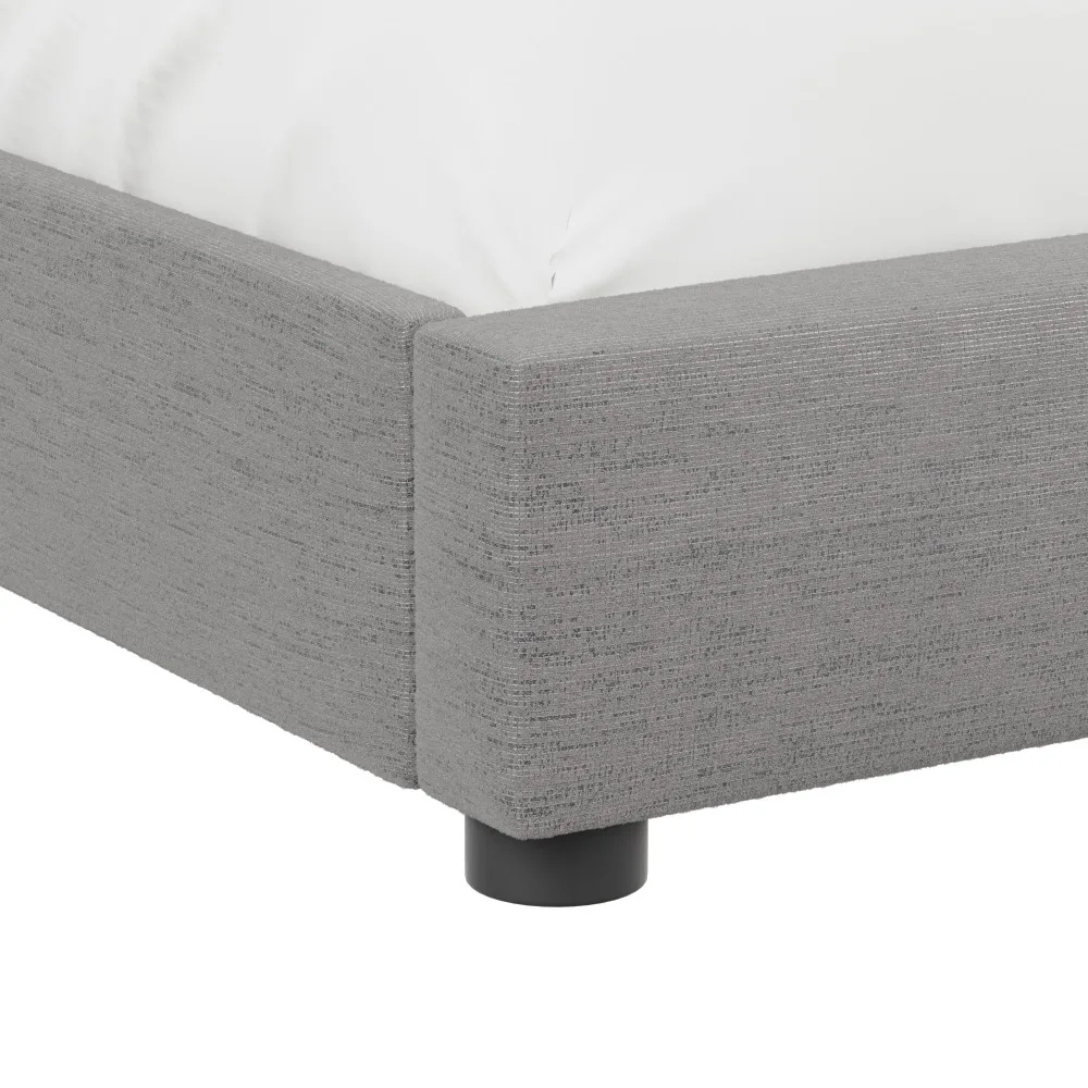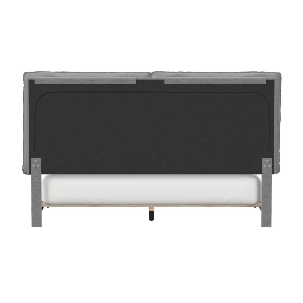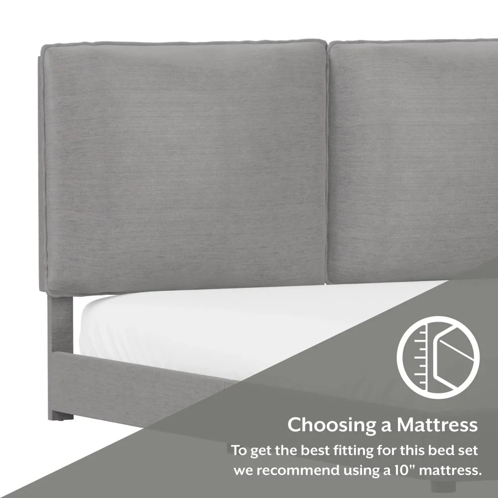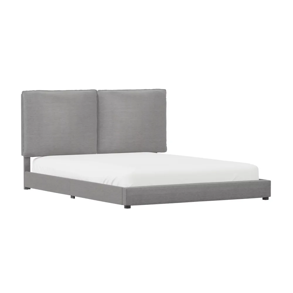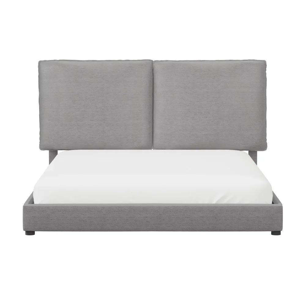 Most beds are built for comfort. But how many beds have built-in comfort? With this Platform Queen Bed and its pillow headboard, relaxing comes easy-no fluff required. The tall headboard is covered in a cozy gray upholstery and has two large, upholstered pillows that easily attach and firmly secure with VELCRO®. Plus, the upholstery continues along the low-profile side rails that are supported by espresso-finished wooden legs for a fresh and modern look in any bedroom space. No box spring needed, queen mattress required, not included. Assembly required.