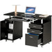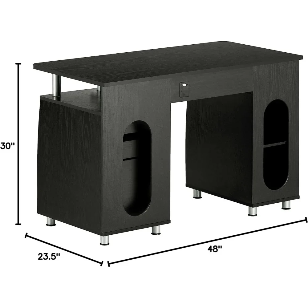 This Desk is a complete workstation offering an ample work surface and plenty of storage space. It features an accessory shelf atop a storage cabinet, a keyboard panel equipped with a safety stop, 2 drawers and a file cabinet. The CPU/Storage cabinet not only has a removable shelf that can be pleased up, down or completely removed but also has a large back opening for cables. The desktop has an 80lbs weight capacity, while the shelves can each hold up to 30lbs, and the drawers each have a 22lbs weight capacity. This elegant desk is made of heavy-duty MDF panels with a moisture resistant PVC laminate veneer atop scratch-resistant powder-coated steel supports.
