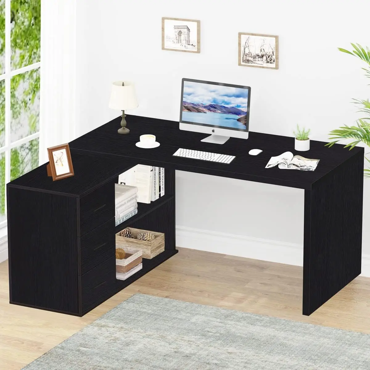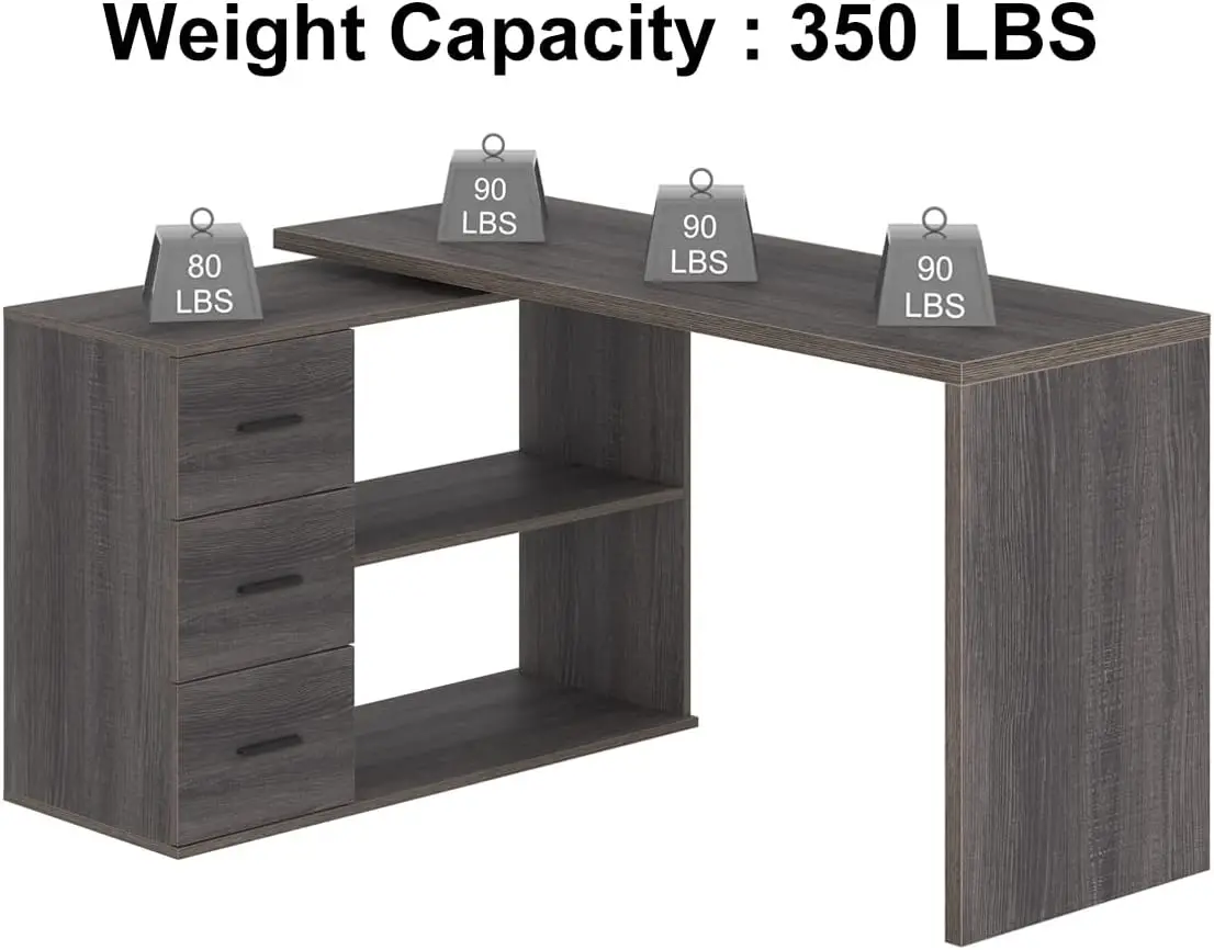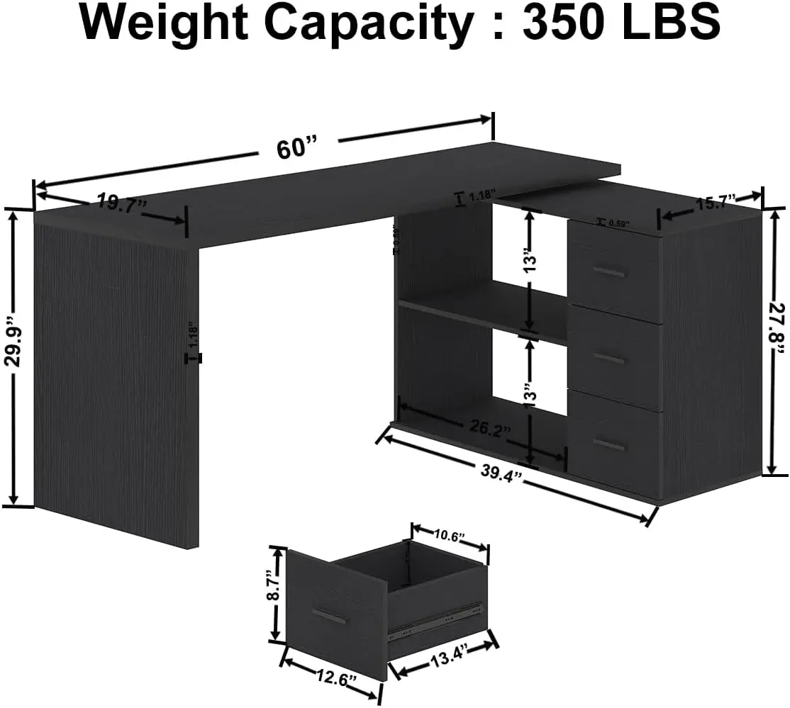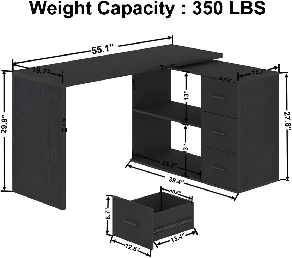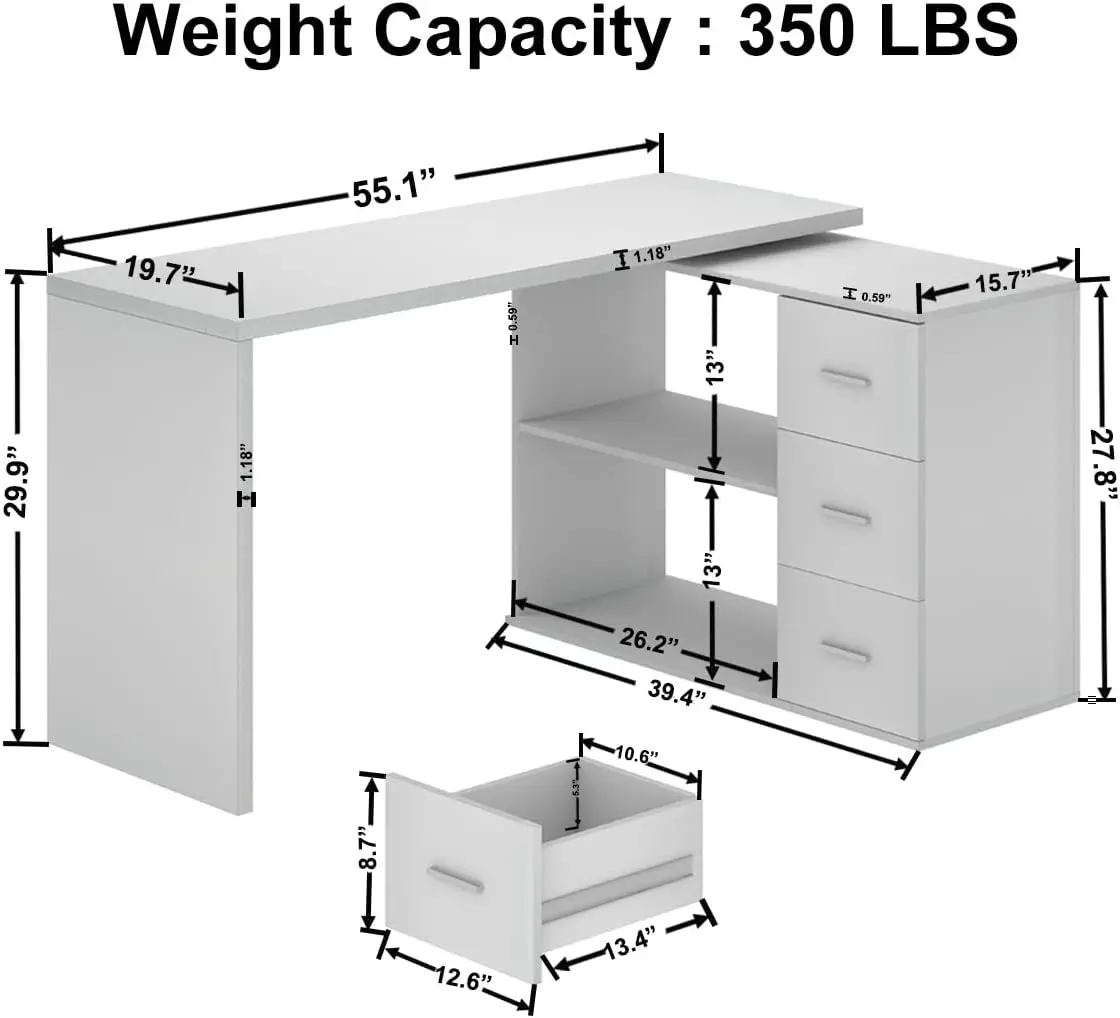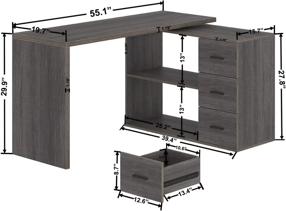 - Keep Clutter out of Sight and out of Mind: The open and long 2 tier shelves of the L shape desk provide a place for essential office supplies at arm's reach, while the 3 drawers let you tuck away anything from loose odds and ends to important files. The shelves and drawers of the L shaped desk maximally utilize your home office and provide enough space for storage.