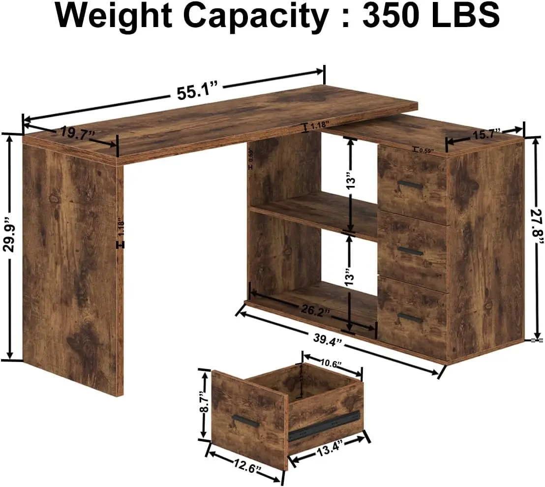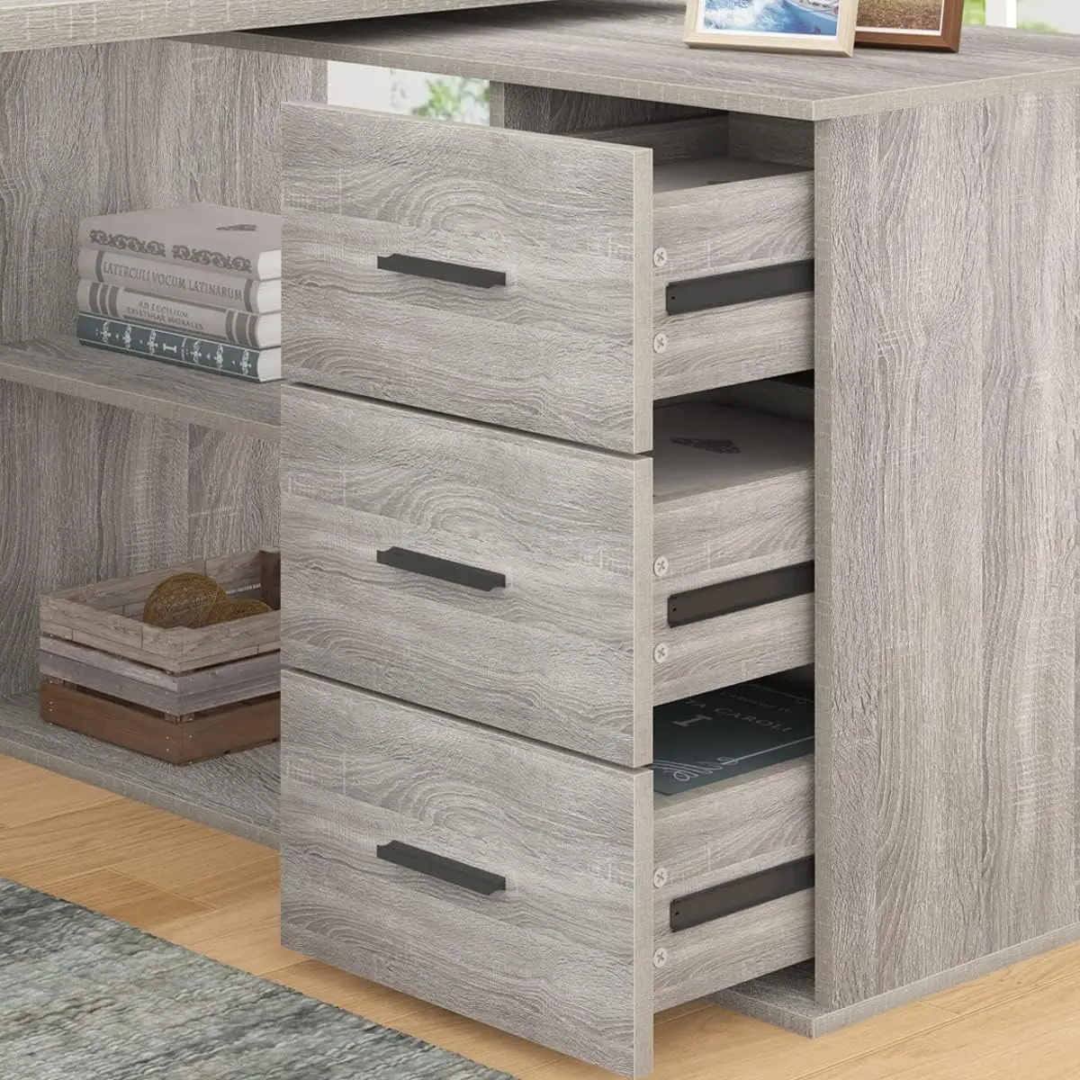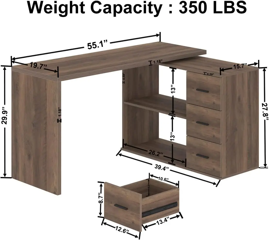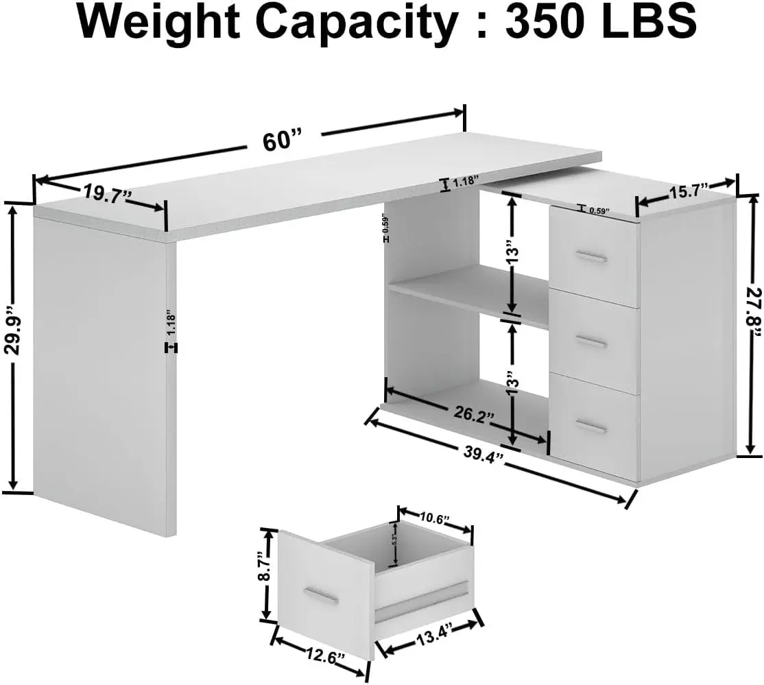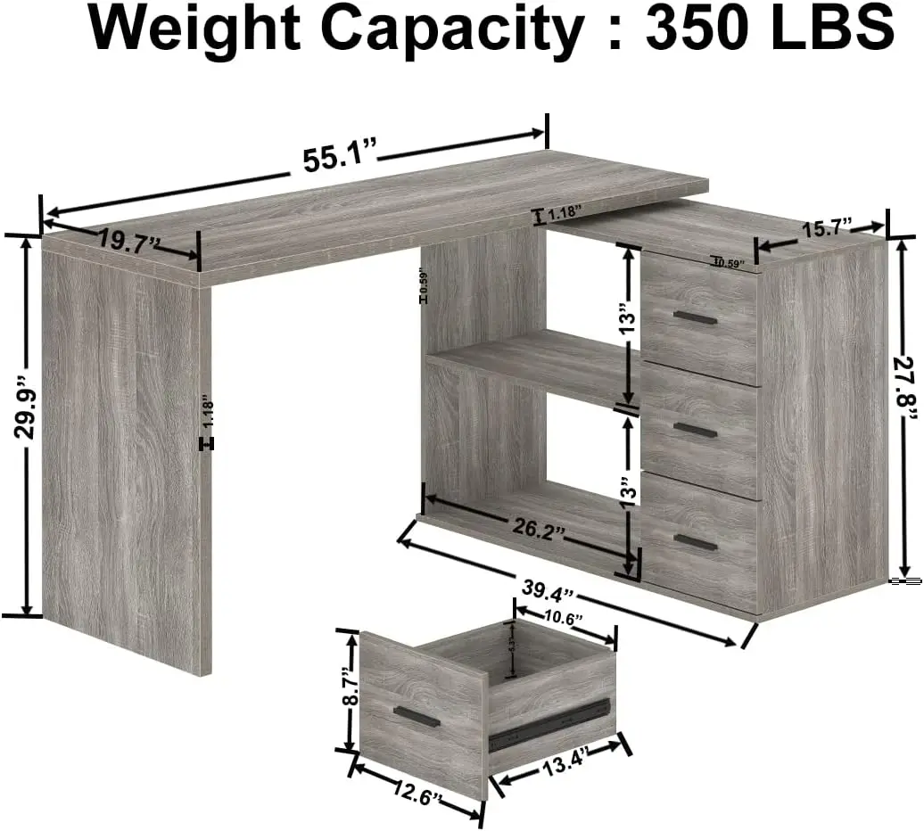- Keep Clutter out of Sight and out of Mind: The open and long 2 tier shelves of the L shape desk provide a place for essential office supplies at arm's reach, while the 3 drawers let you tuck away anything from loose odds and ends to important files. The shelves and drawers of the L shaped desk maximally utilize your home office and provide enough space for storage.