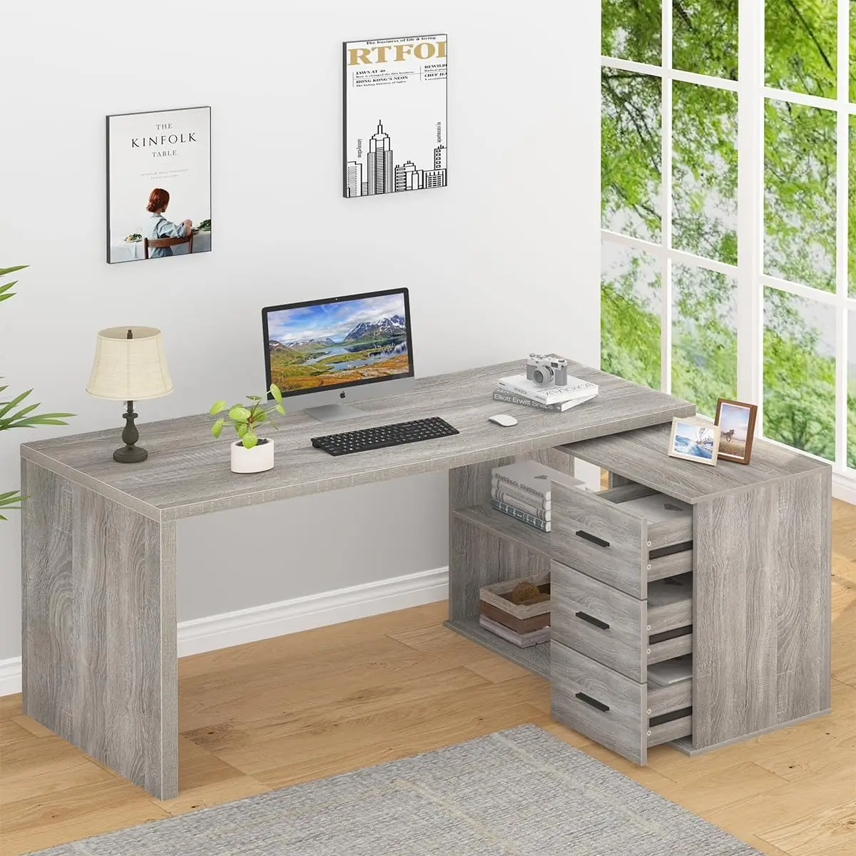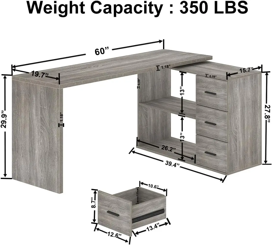 - Extraordinary Durability and Sturdy Construction: This grey l desk with drawers is manufactured with high quality engineered wood with 1.18" thick surface desktop. The sturdy board, firm wooden legs and 2 metal brakets offer the l-shaped desk extra strength and stability. The drawers are pretty sturdy and smooth. This 60 inch large l shaped desk can hold up to 350 LBS of weight.