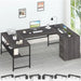 The open shelves of the grey l shape desk provide a place for essential office supplies at arm's reach.