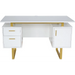 • This white and gold modern desk features two siding drawers and a cabinet with gold handles, to provide functional space to keep your workspace organized.