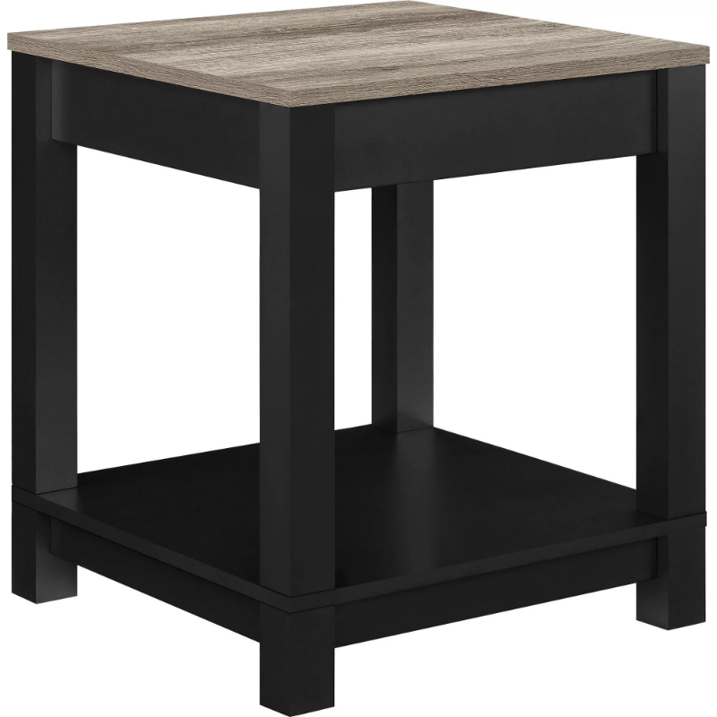 Add extra style to your living room with the Better Homes and Gardens Langley Bay End Table. This item is beautiful and functional. The top surface of the End Table is the perfect spot for your lamp or family photos while the lower shelf can be used to keep books and magazines in one handy space. The Langley Bay End Table features a matte black finish with a distressed woodgrain top that creates a refined, clean look in your home. After assembly, the End Table measures to be 23.3"h x 20.1"w x 20.1"d.
