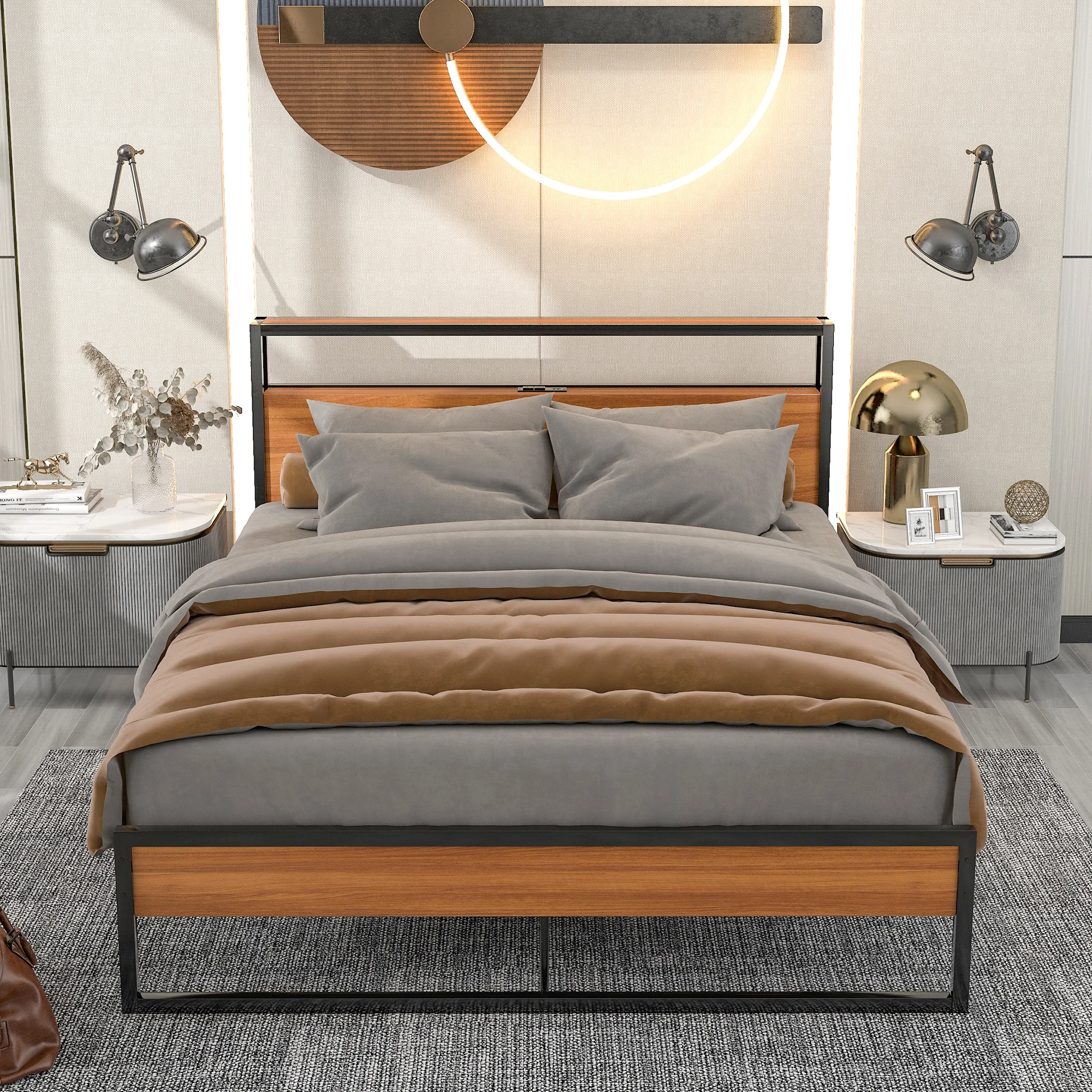 Full /Queen Size Metal Platform Bed Frame with Sockets, USB Ports and Slat Support ,No Box Spring Needed