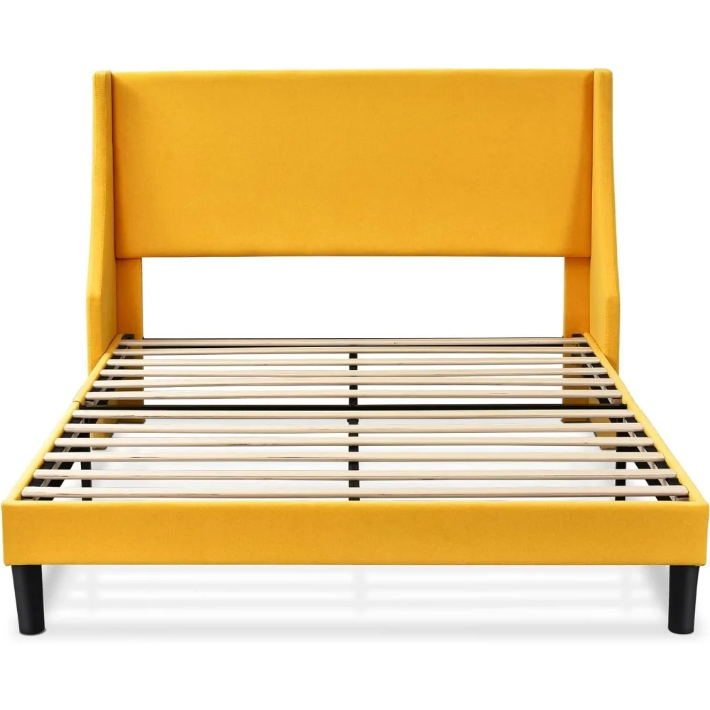 Full-size bed frame, platform bed frame with padded headboard, modern luxury wing back, plank support, mattress base