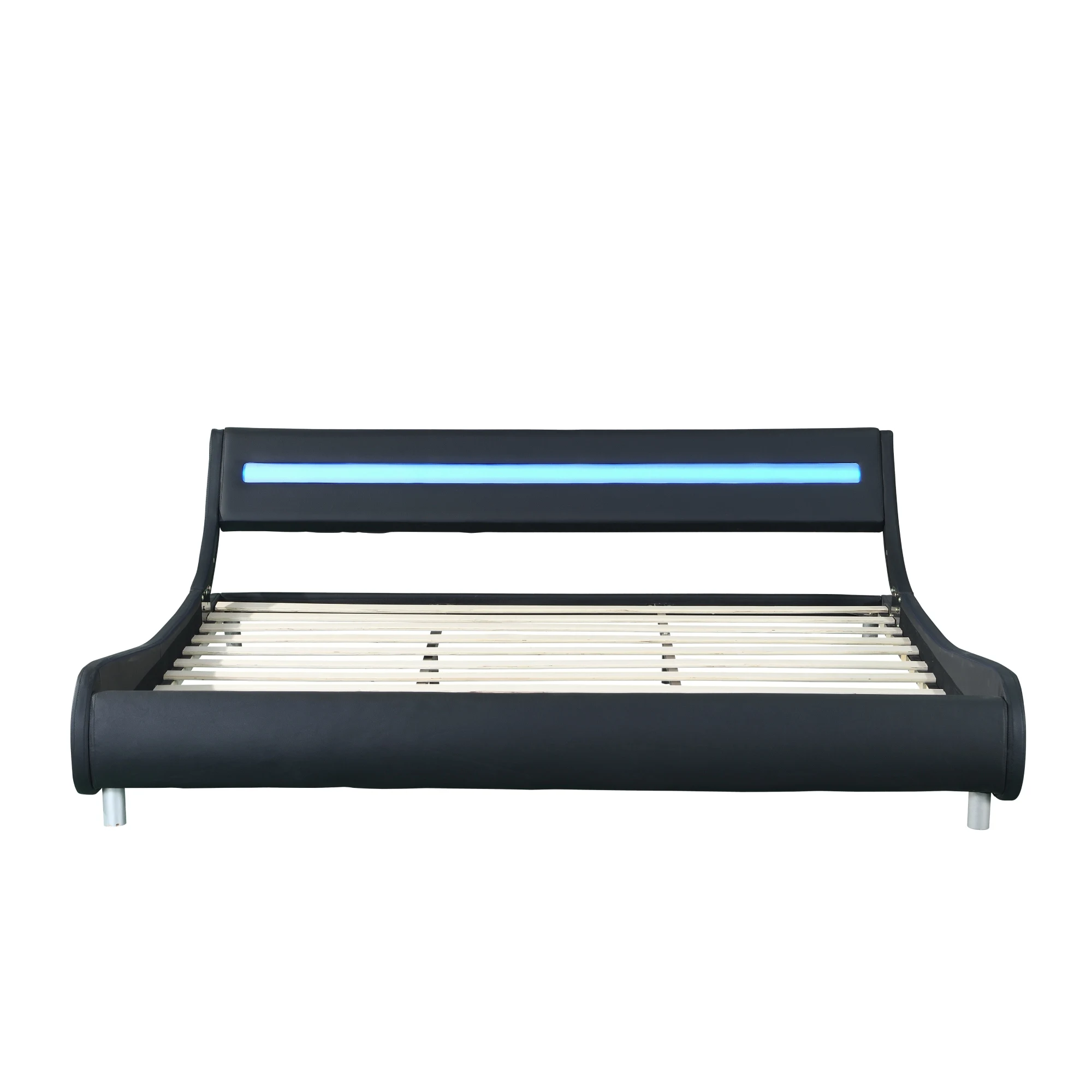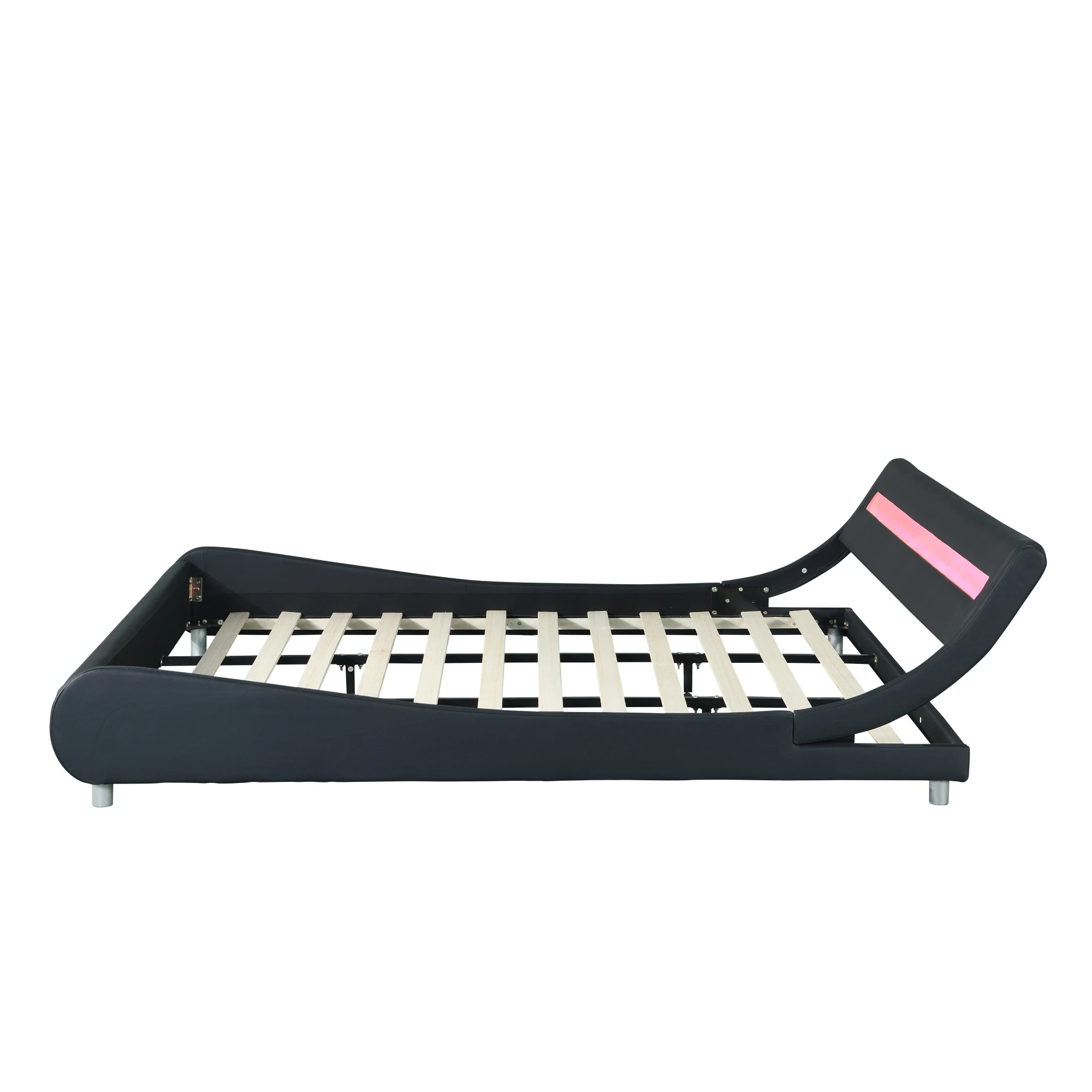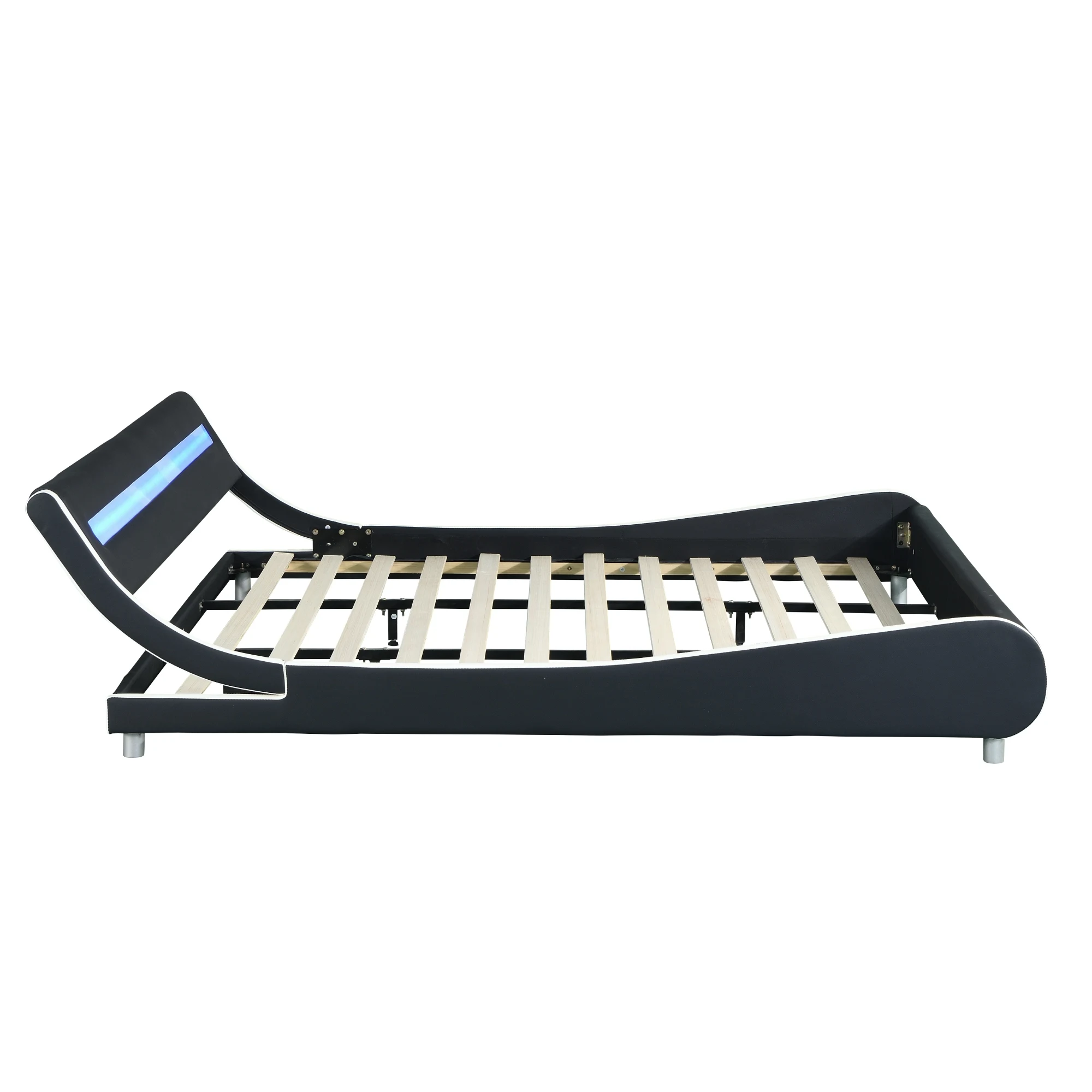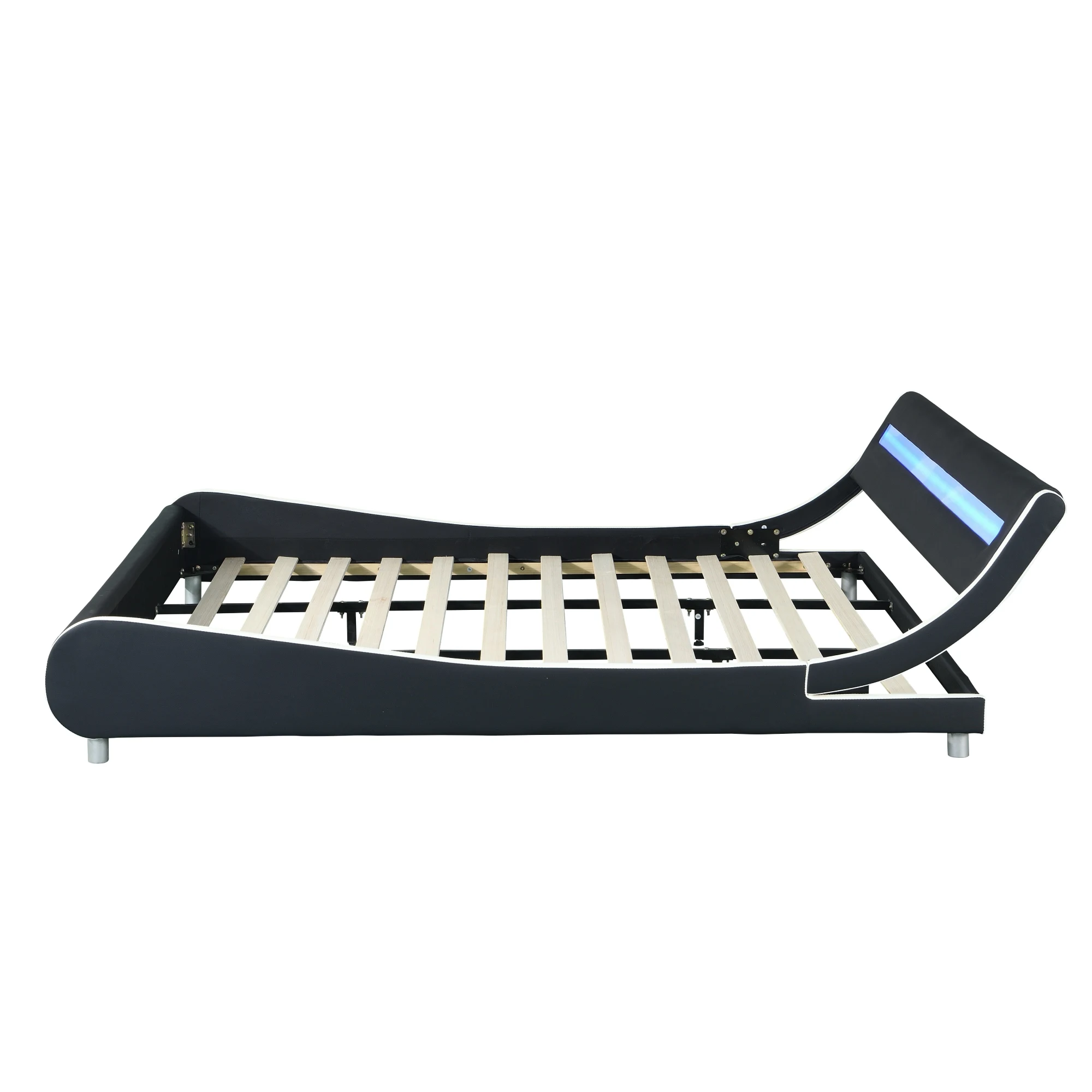 [Flash Sale]King/Queen Faux Leather Upholstered Platform Bed Frame W/Led Lighting Curve Design Wood Slat Support No Box Spring Needed Easy Assemble Black/White/Gray[US-W]