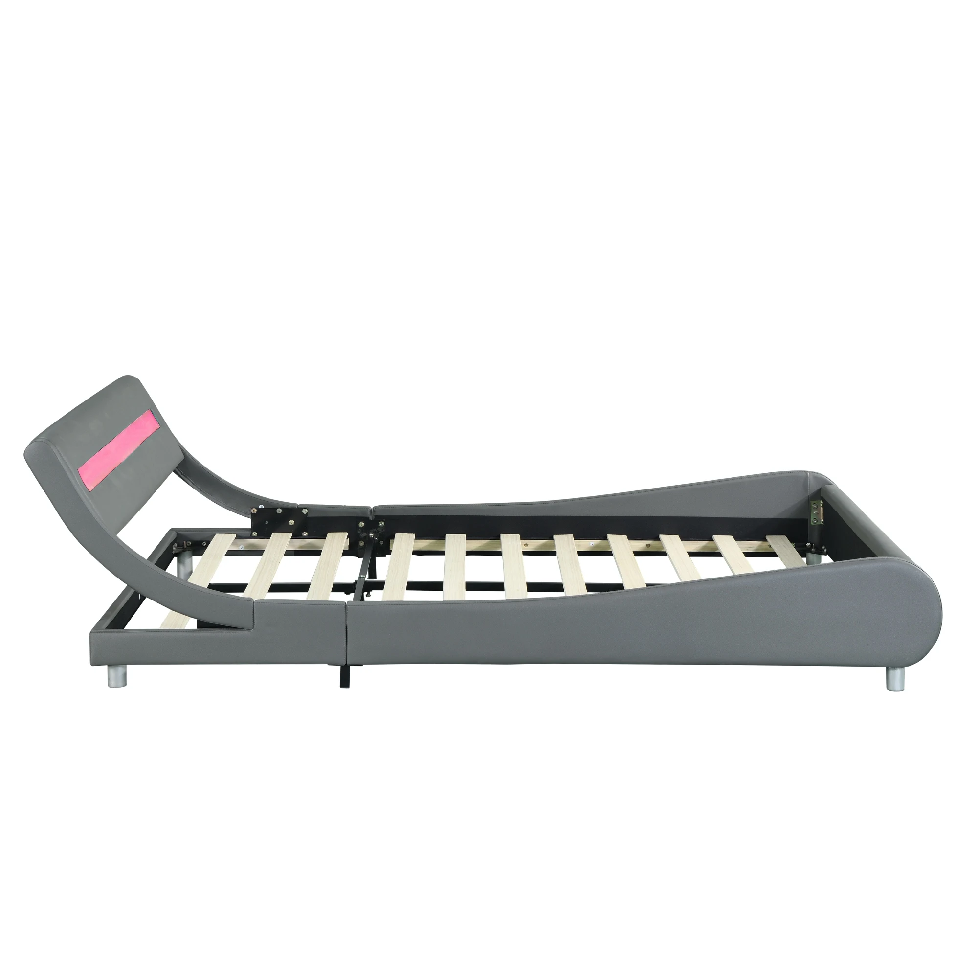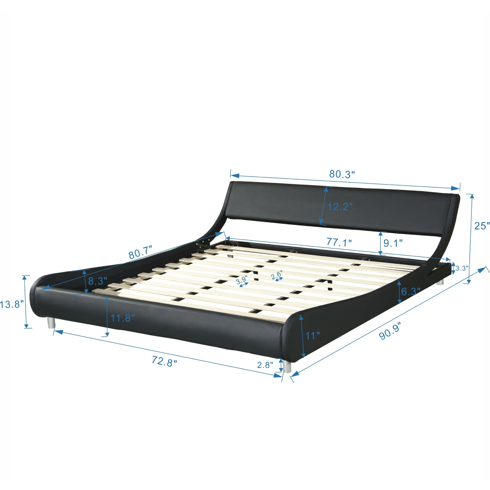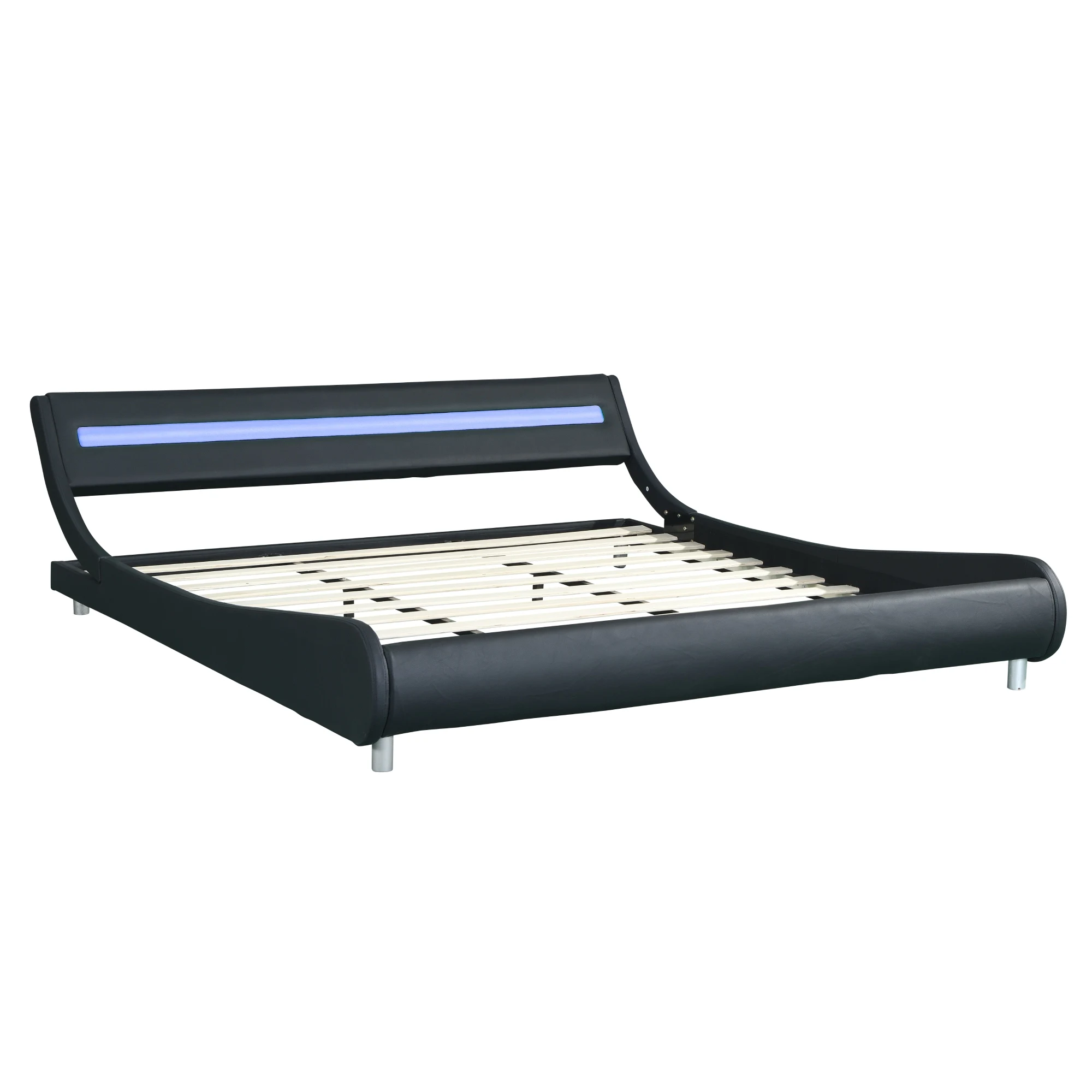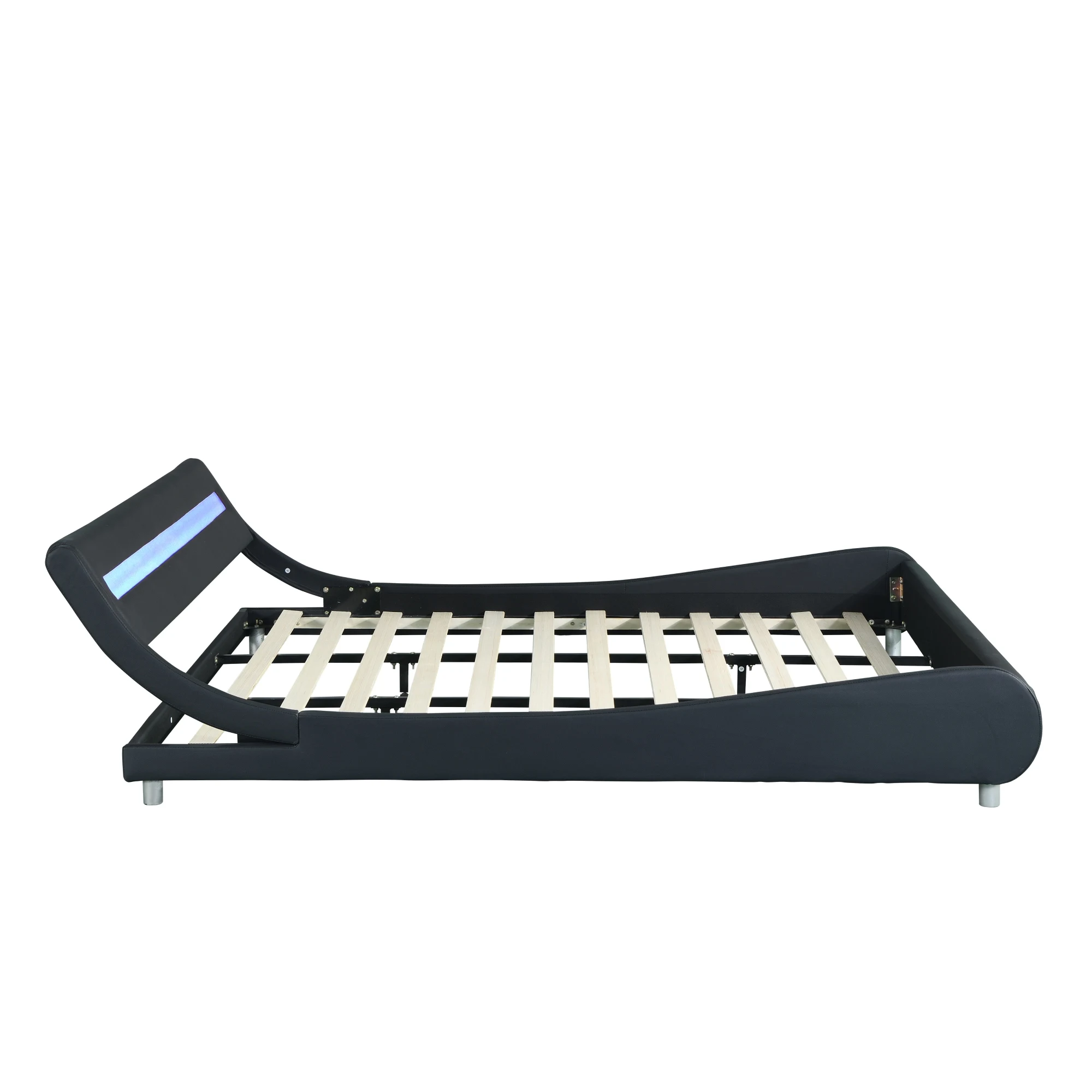 [Flash Sale]King/Queen Faux Leather Upholstered Platform Bed Frame W/Led Lighting Curve Design Wood Slat Support No Box Spring Needed Easy Assemble Black/White/Gray[US-W]