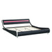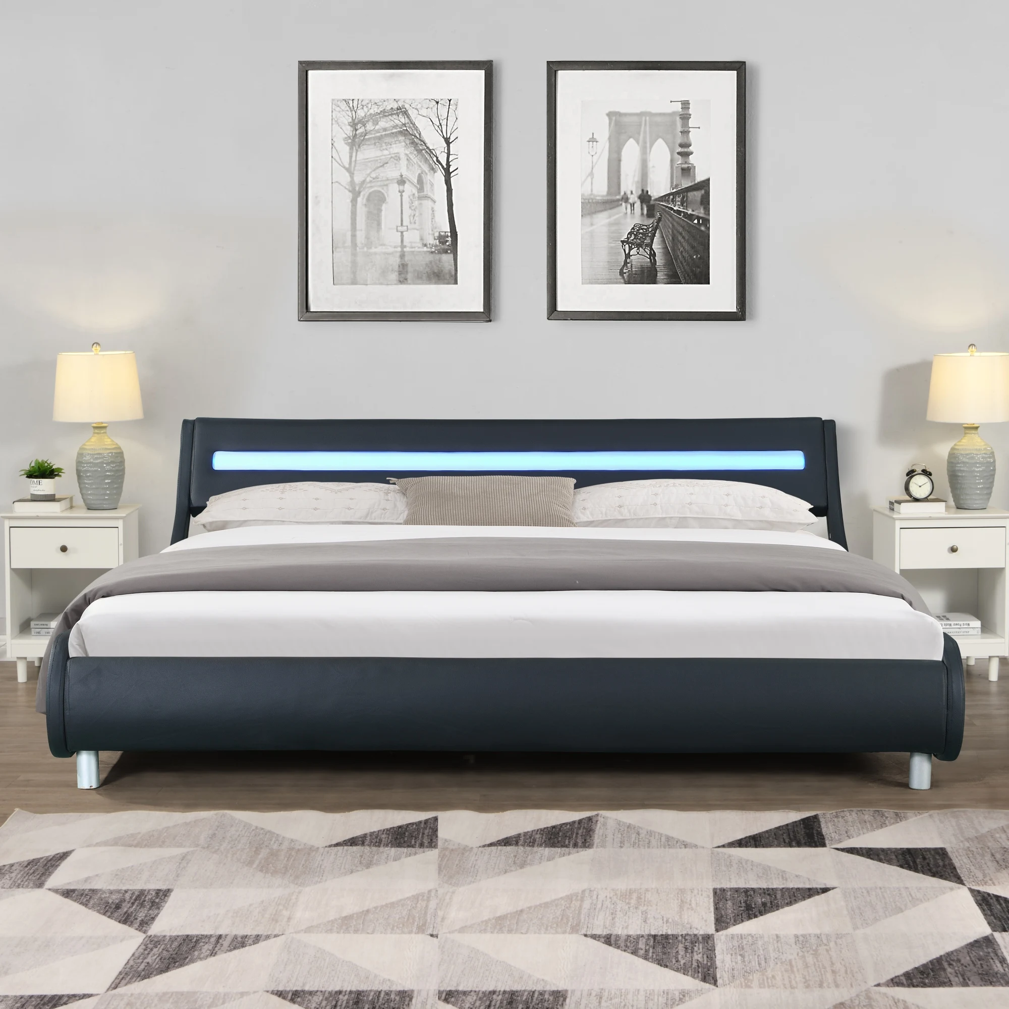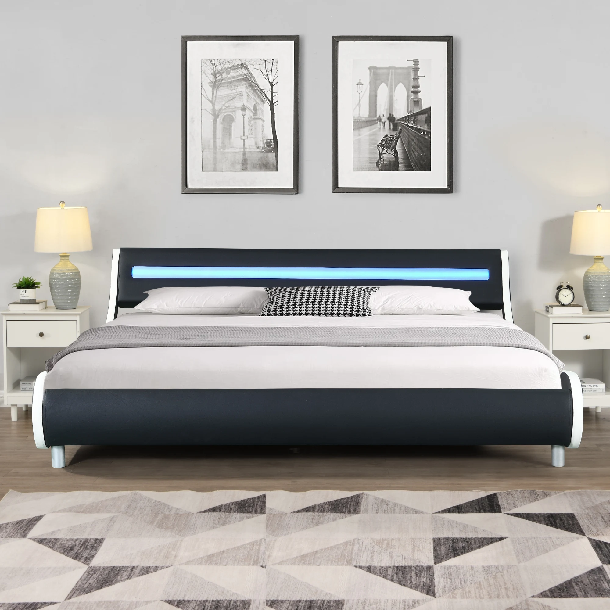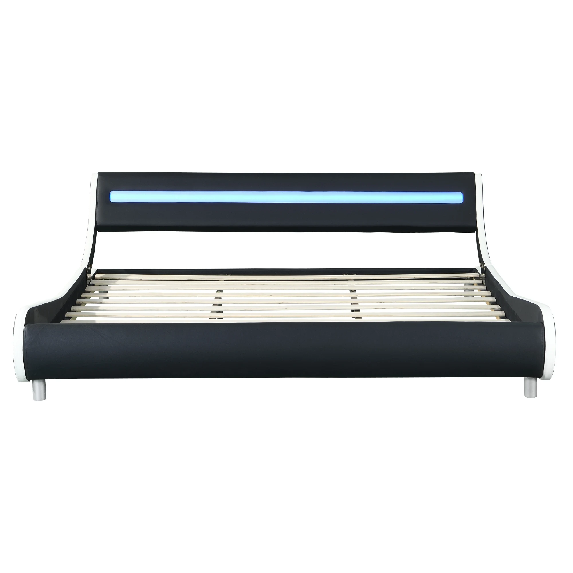 King/Queen Faux Leather Upholstered Platform Bed Frame W/Led Lighting Curve Design Wood Slat Support Black/White/Gray[US-W]